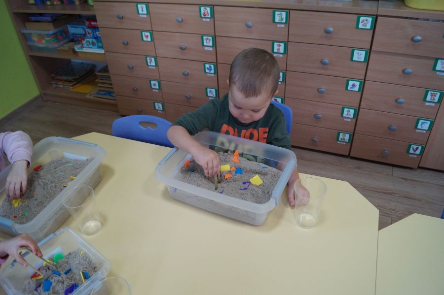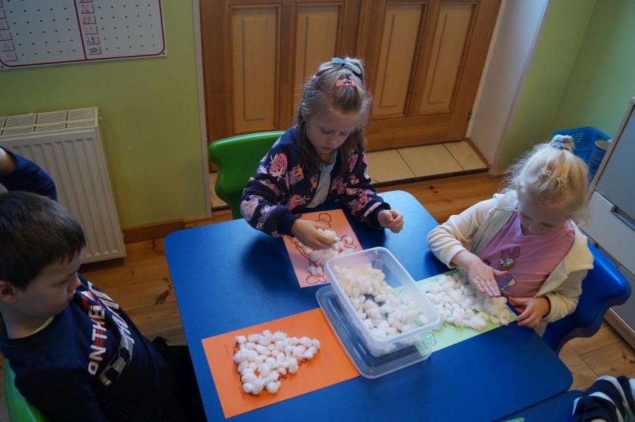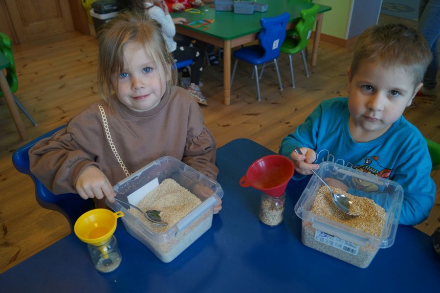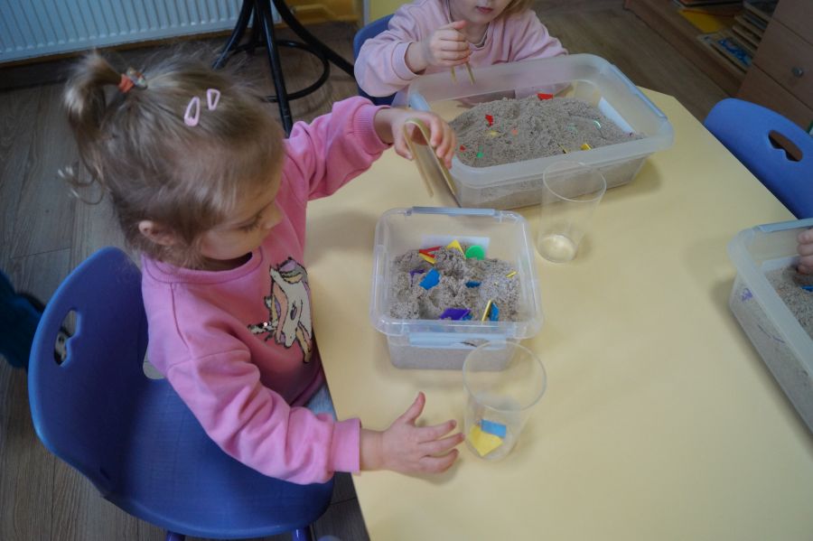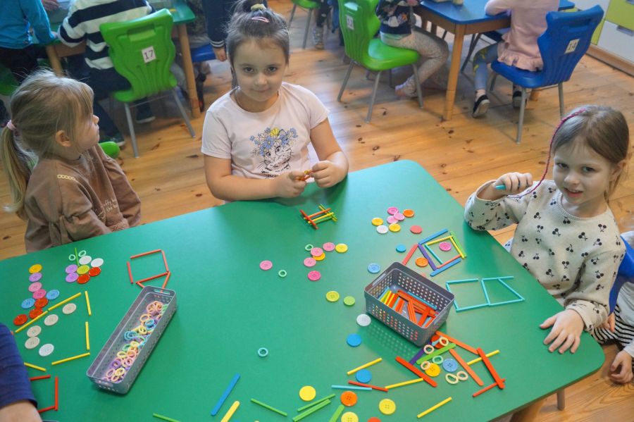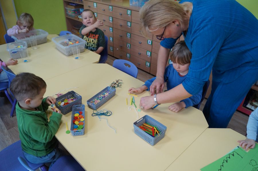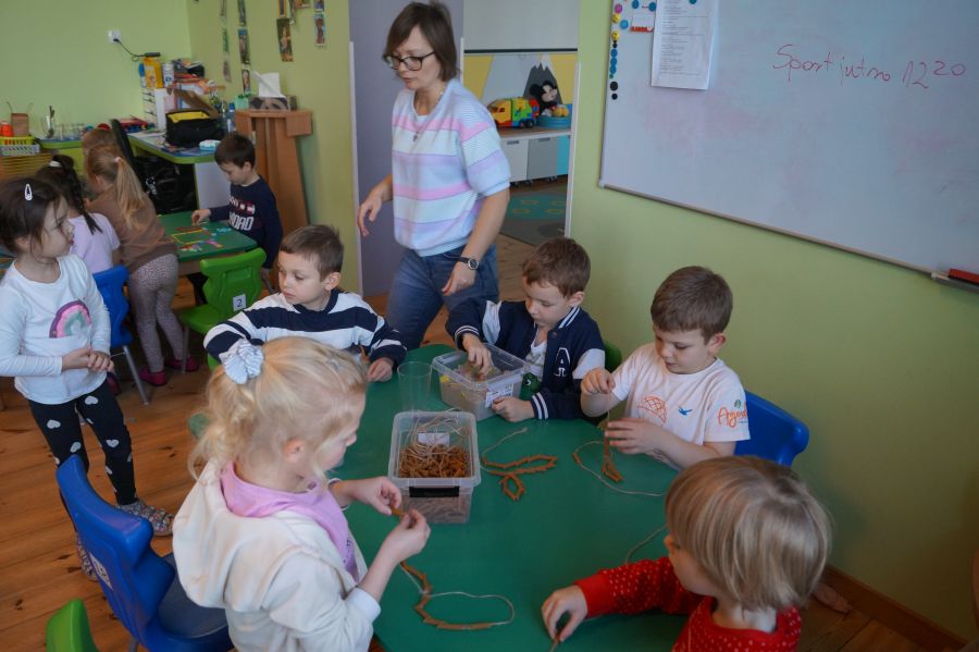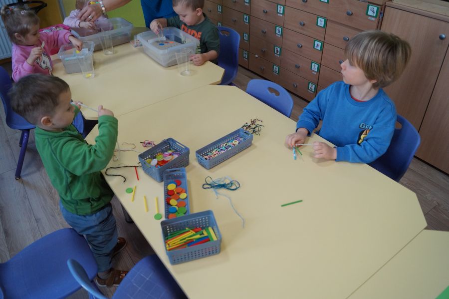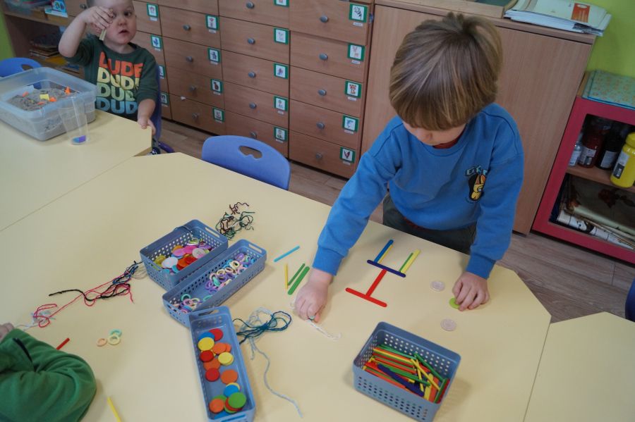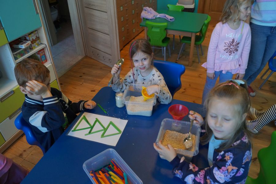 Podczas dzisiejszych zajęć dzieci ze starszej i młodszej grupy przedszkolnej pracowały na kilku stanowiskach rozwijających motorykę małą, koncentrację oraz kreatywność. Wykonywały różnorodne zadania: segregowały kształty ukryte w piasku, tworzyły własne kompozycje z patyczków, guzików i wełny, nawlekały „makaronowe korale”, przesypywały ryż i kaszę, a także układały rytmy z patyczków. Takie aktywności wspierają sprawność dłoni i palców, koordynację wzrokowo–ruchową, logiczne myślenie, a także cierpliwość i samodzielność. Dzieci uczyły się poprzez zabawę, eksperymentowanie i działanie, rozwijając jednocześnie swoją wyobraźnię oraz umiejętność skupienia uwagi.