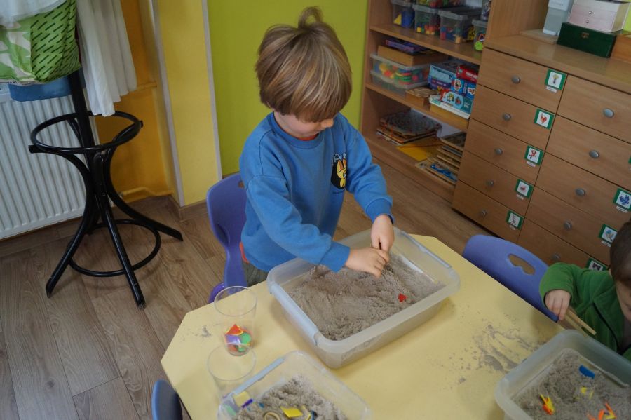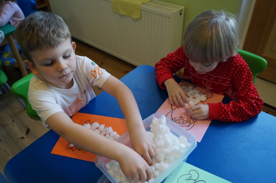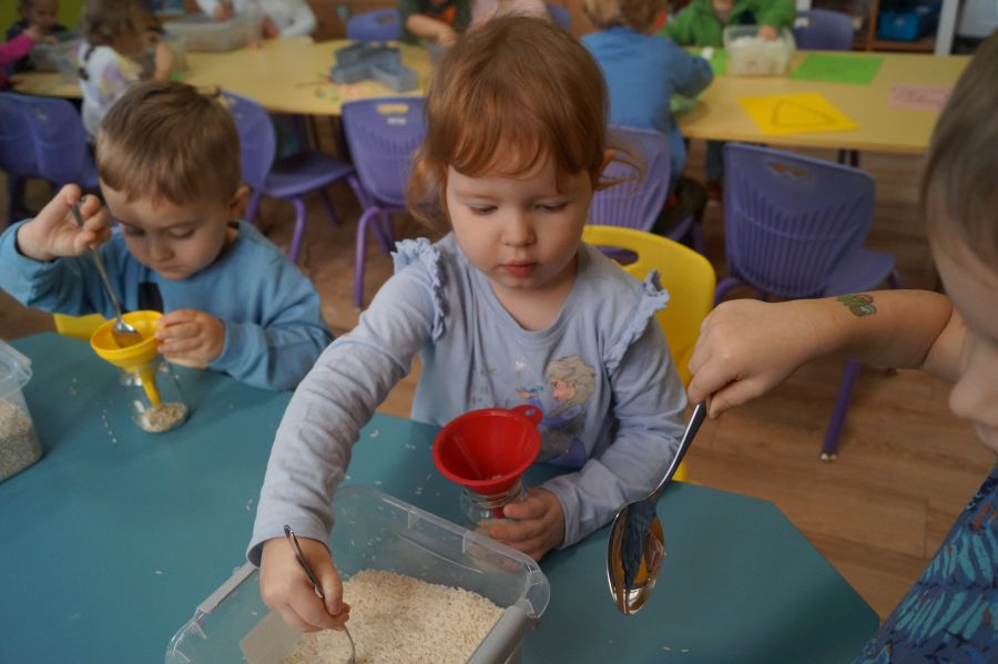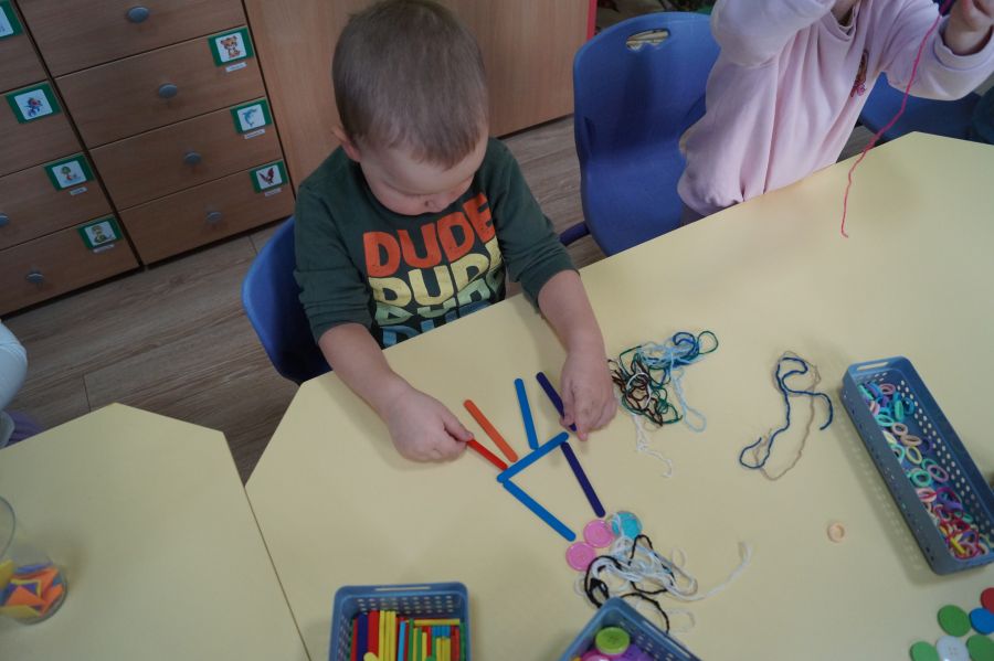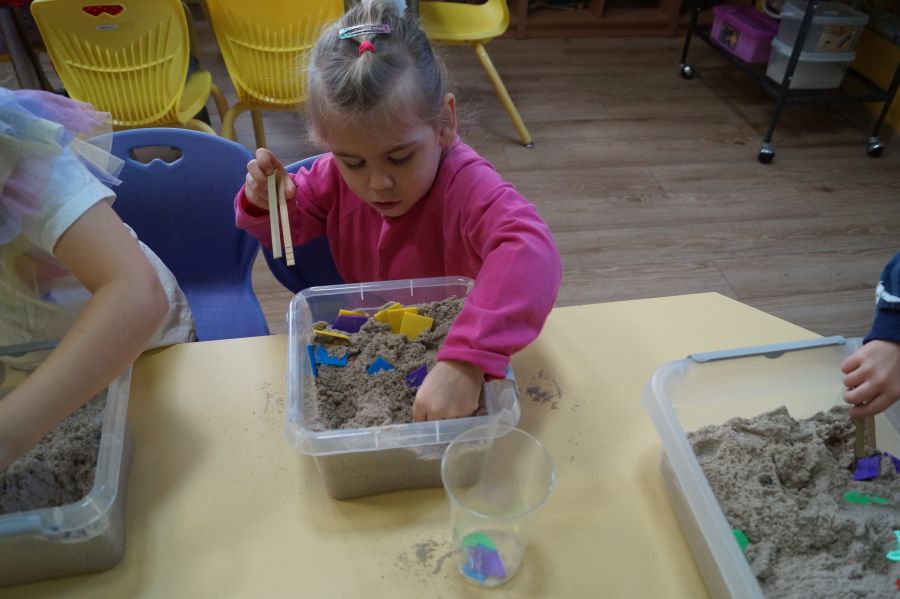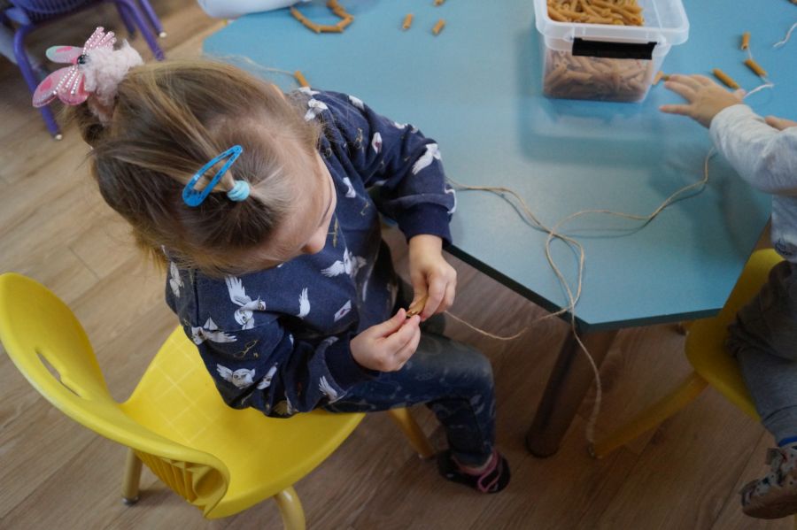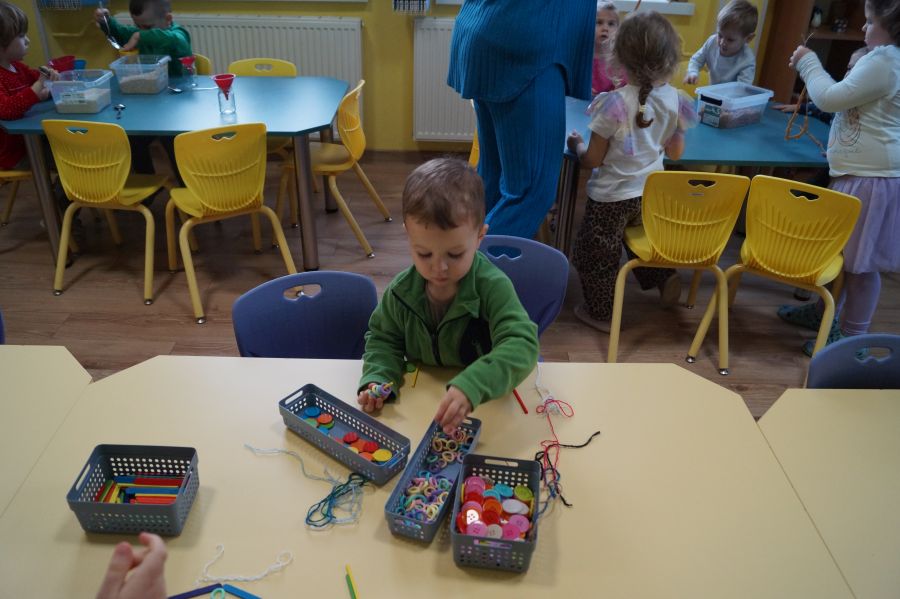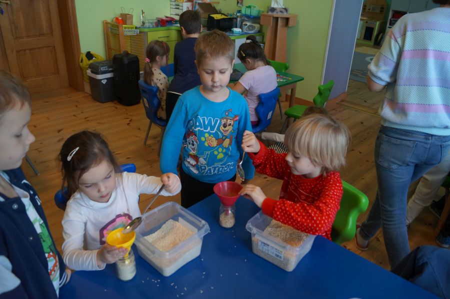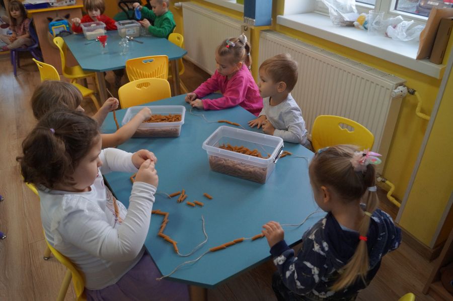 Podczas dzisiejszych zajęć dzieci ze starszej i młodszej grupy przedszkolnej pracowały na kilku stanowiskach rozwijających motorykę małą, koncentrację oraz kreatywność. Wykonywały różnorodne zadania: segregowały kształty ukryte w piasku, tworzyły własne kompozycje z patyczków, guzików i wełny, nawlekały „makaronowe korale”, przesypywały ryż i kaszę, a także układały rytmy z patyczków. Takie aktywności wspierają sprawność dłoni i palców, koordynację wzrokowo–ruchową, logiczne myślenie, a także cierpliwość i samodzielność. Dzieci uczyły się poprzez zabawę, eksperymentowanie i działanie, rozwijając jednocześnie swoją wyobraźnię oraz umiejętność skupienia uwagi.