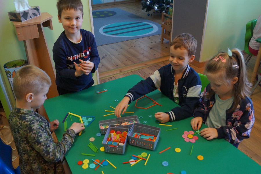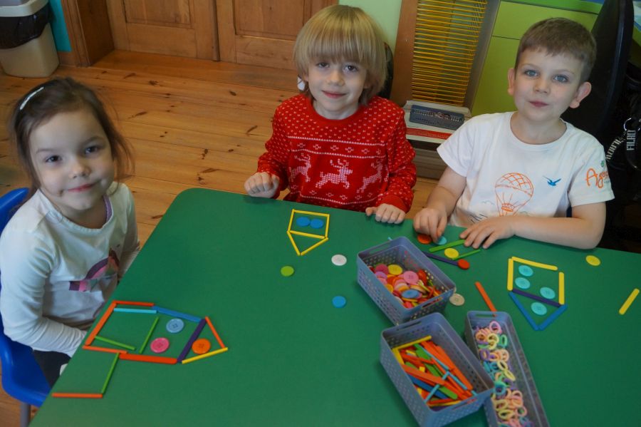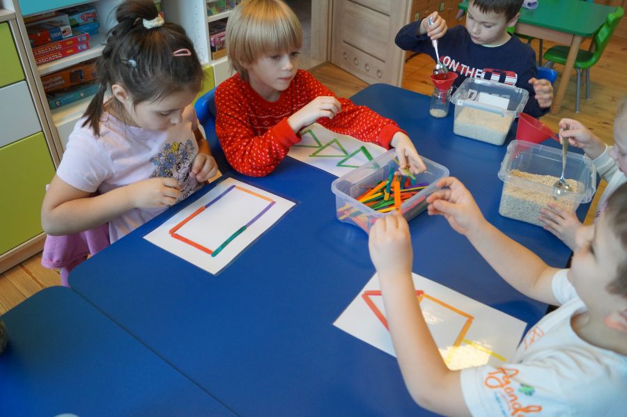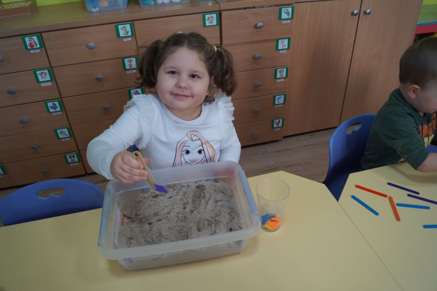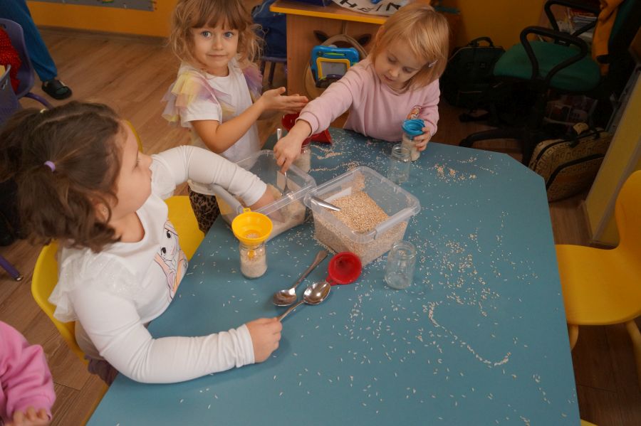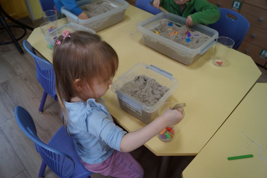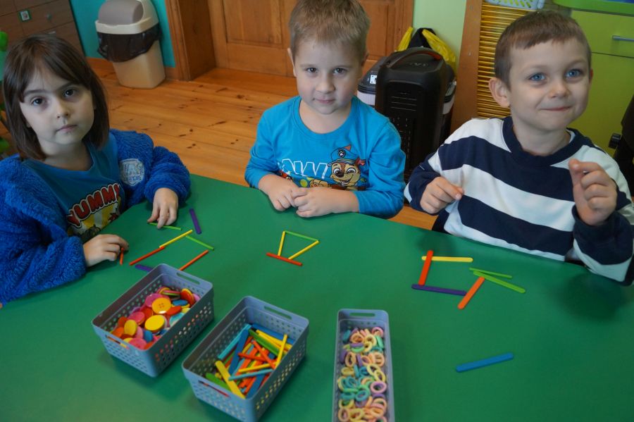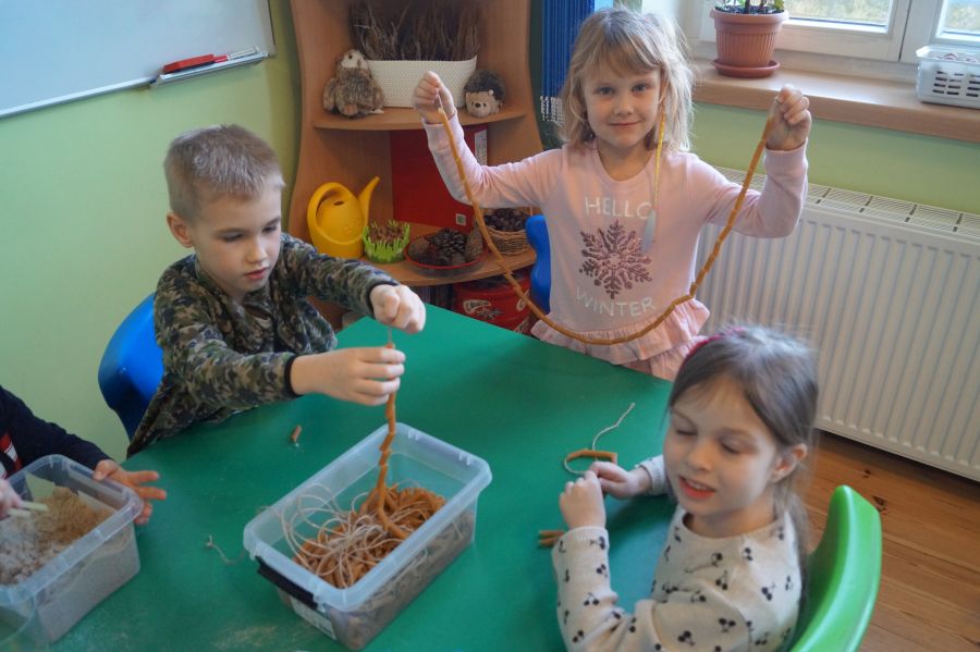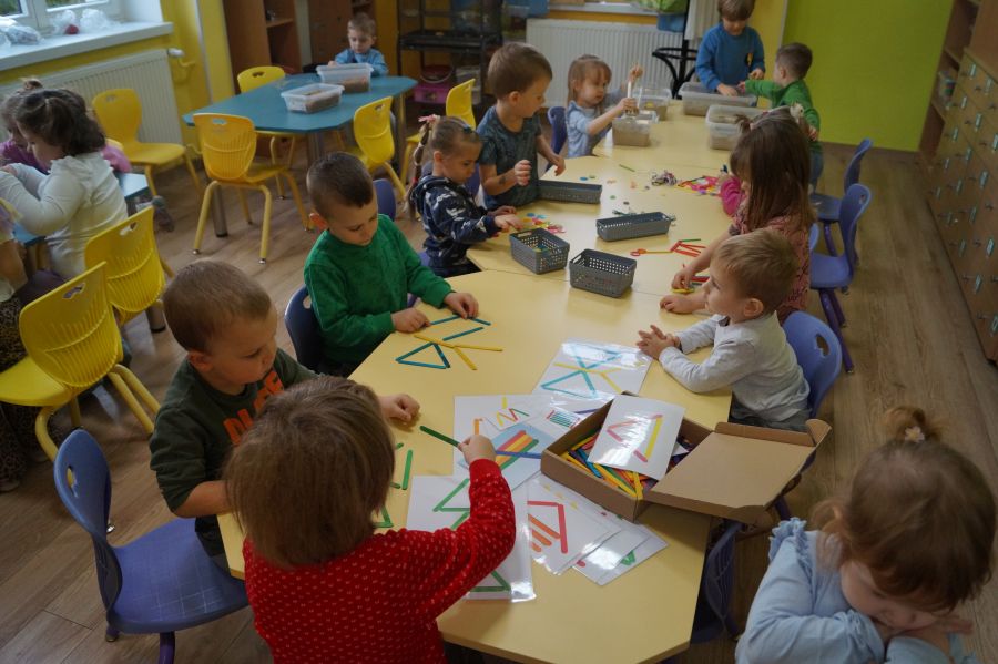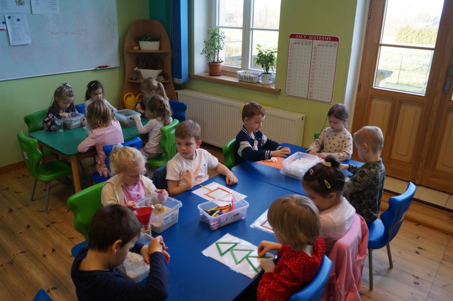 Podczas dzisiejszych zajęć dzieci ze starszej i młodszej grupy przedszkolnej pracowały na kilku stanowiskach rozwijających motorykę małą, koncentrację oraz kreatywność. Wykonywały różnorodne zadania: segregowały kształty ukryte w piasku, tworzyły własne kompozycje z patyczków, guzików i wełny, nawlekały „makaronowe korale”, przesypywały ryż i kaszę, a także układały rytmy z patyczków. Takie aktywności wspierają sprawność dłoni i palców, koordynację wzrokowo–ruchową, logiczne myślenie, a także cierpliwość i samodzielność. Dzieci uczyły się poprzez zabawę, eksperymentowanie i działanie, rozwijając jednocześnie swoją wyobraźnię oraz umiejętność skupienia uwagi.