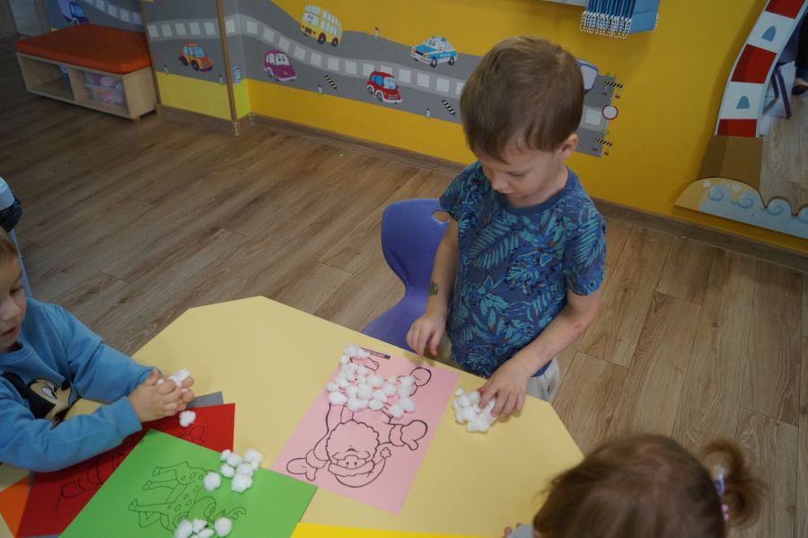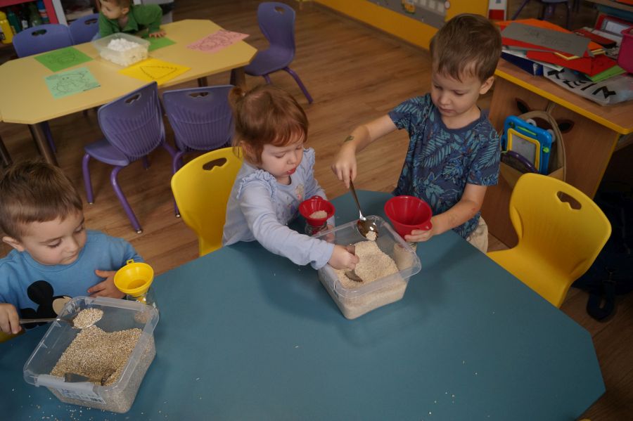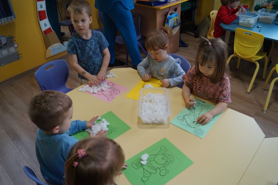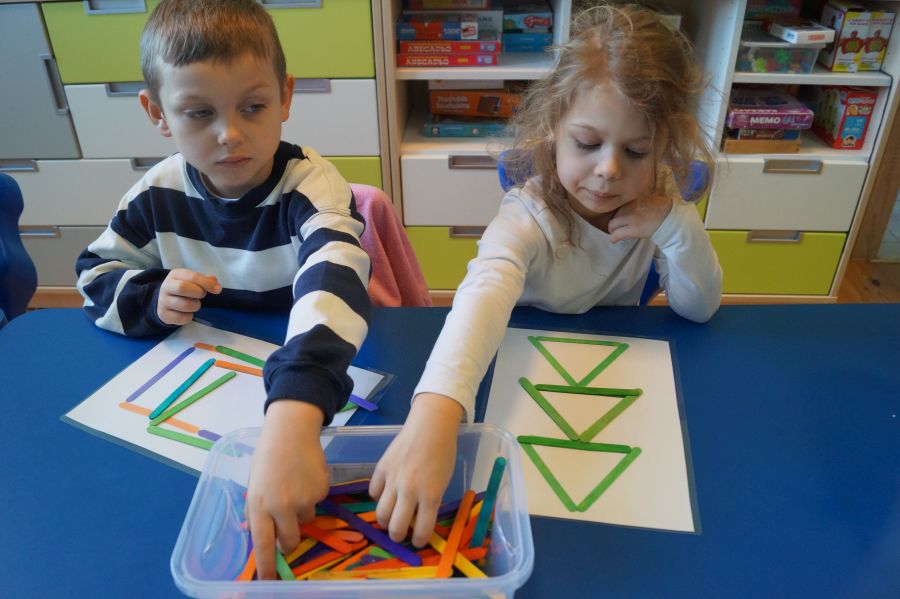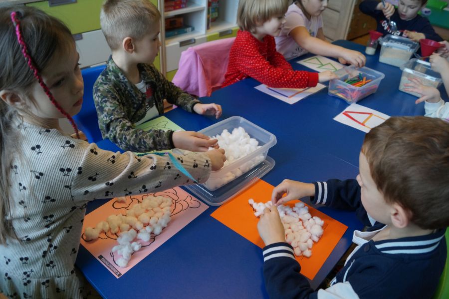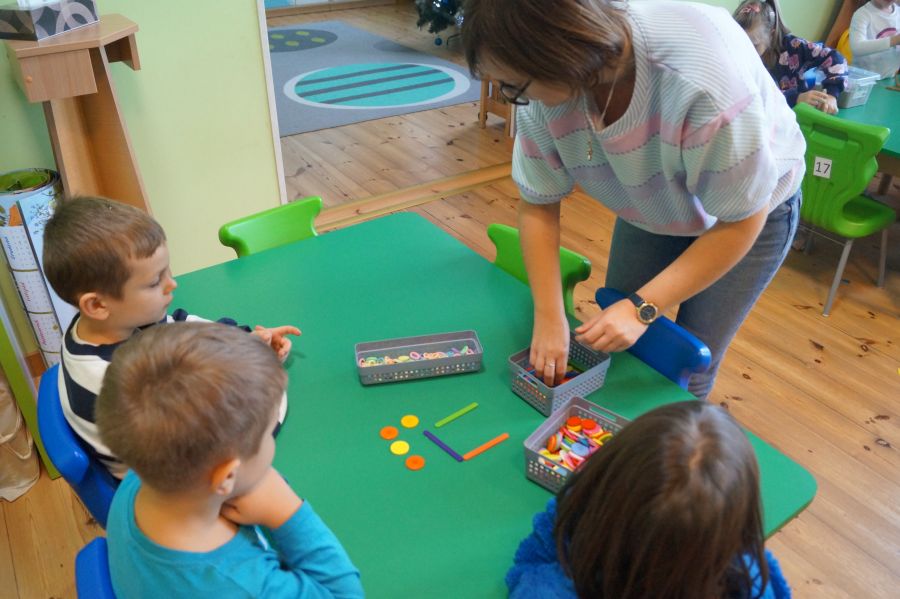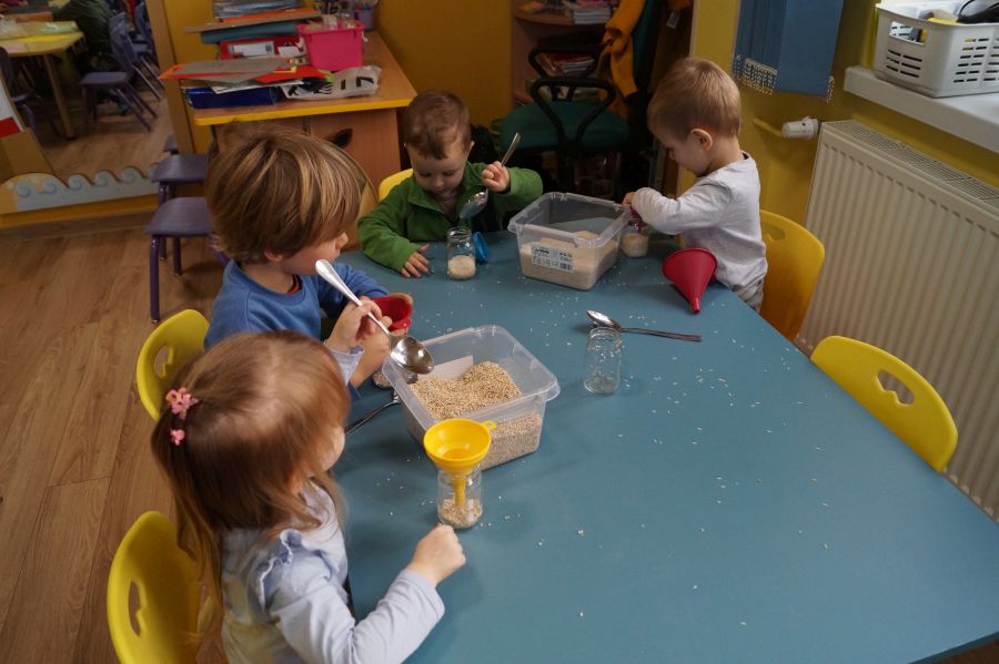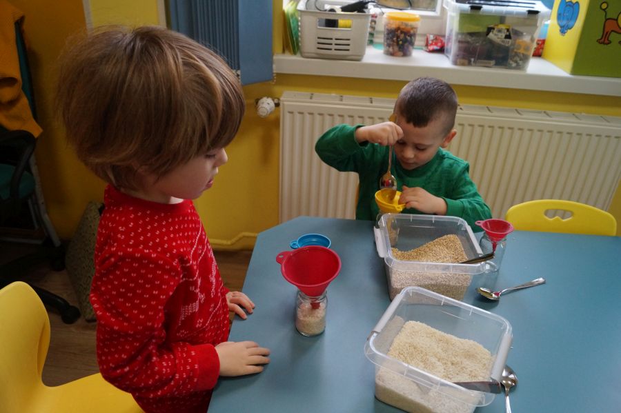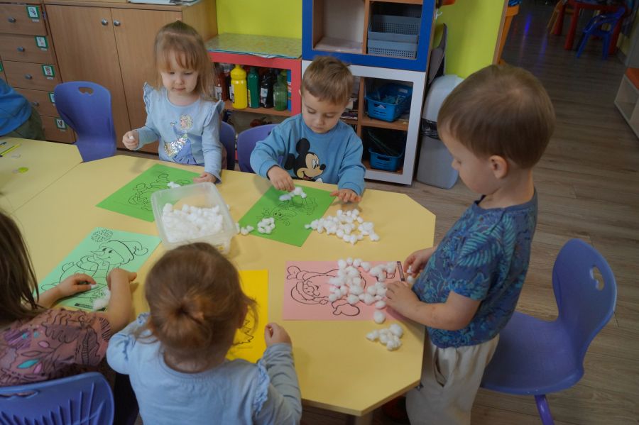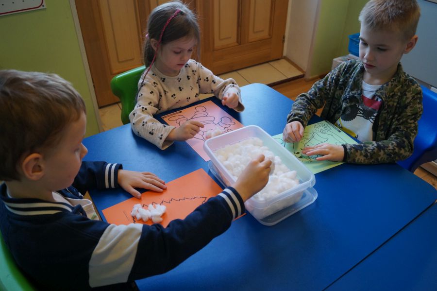 Podczas dzisiejszych zajęć dzieci ze starszej i młodszej grupy przedszkolnej pracowały na kilku stanowiskach rozwijających motorykę małą, koncentrację oraz kreatywność. Wykonywały różnorodne zadania: segregowały kształty ukryte w piasku, tworzyły własne kompozycje z patyczków, guzików i wełny, nawlekały „makaronowe korale”, przesypywały ryż i kaszę, a także układały rytmy z patyczków. Takie aktywności wspierają sprawność dłoni i palców, koordynację wzrokowo–ruchową, logiczne myślenie, a także cierpliwość i samodzielność. Dzieci uczyły się poprzez zabawę, eksperymentowanie i działanie, rozwijając jednocześnie swoją wyobraźnię oraz umiejętność skupienia uwagi.