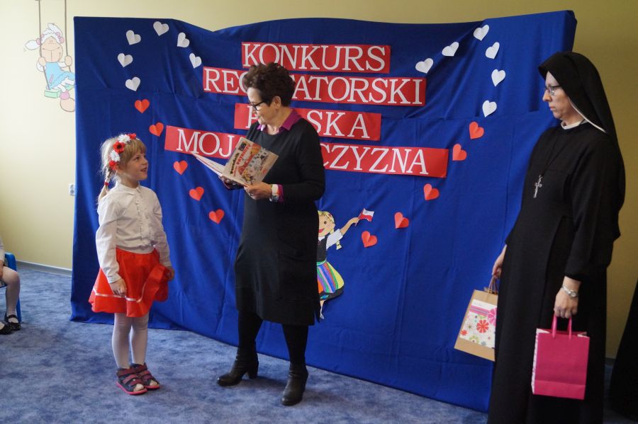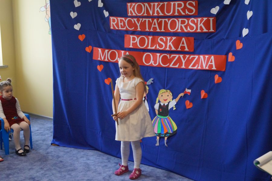 Już po raz siódmy odbył się w naszym przedszkolu międzyprzedszkolny konkurs recytatorski. Tym razem hasło przewodnie brzmiało „Polska, moja Ojczyzna”. W sumie w konkursie wzięło udział 27 uczestników w dwóch grupach wiekowych. Gratulujemy wszystkim dzieciom odwagi i zaangażowania w przygotowanie występu, szczególnie zaś dziewczynkom z naszego przedszkola- Laurze Leszczyńskiej, która zajęła III miejsce w młodszej grupie wiekowej oraz Majce Ziółkowskiej, która zajęła miejsce II w starszej grupie wiekowej.