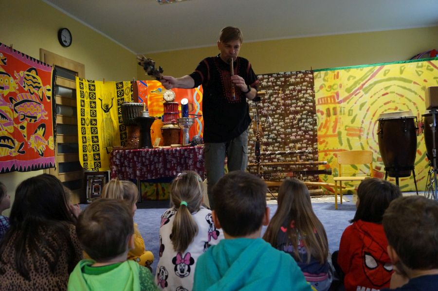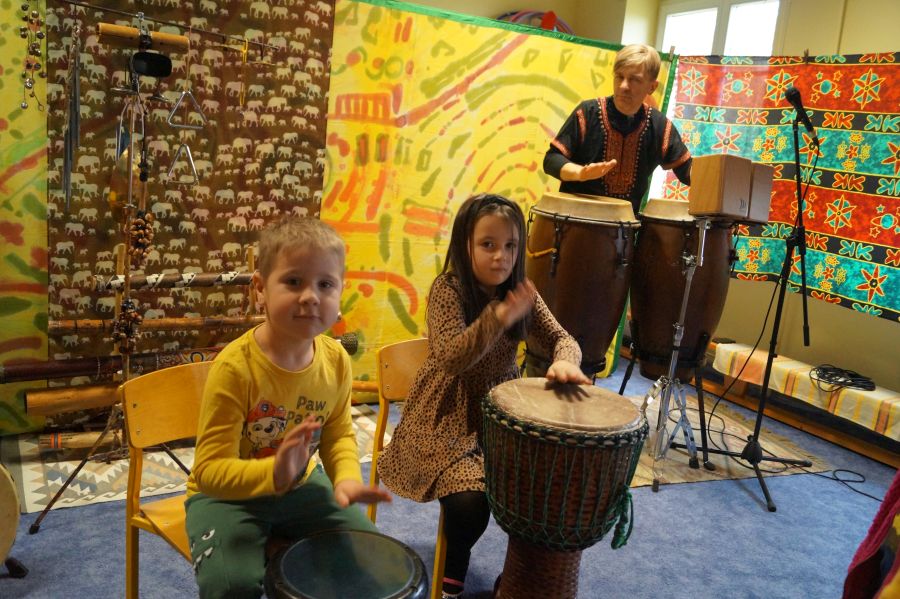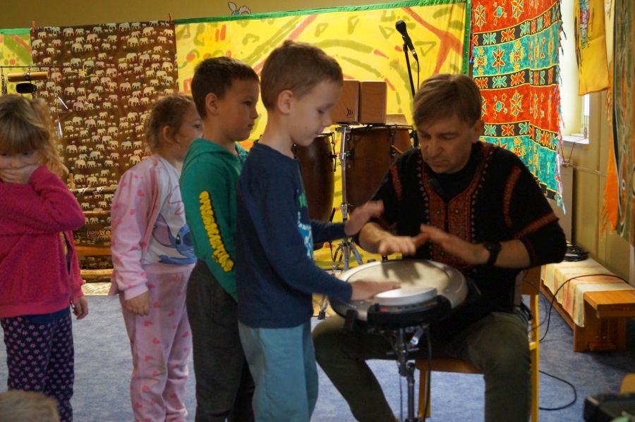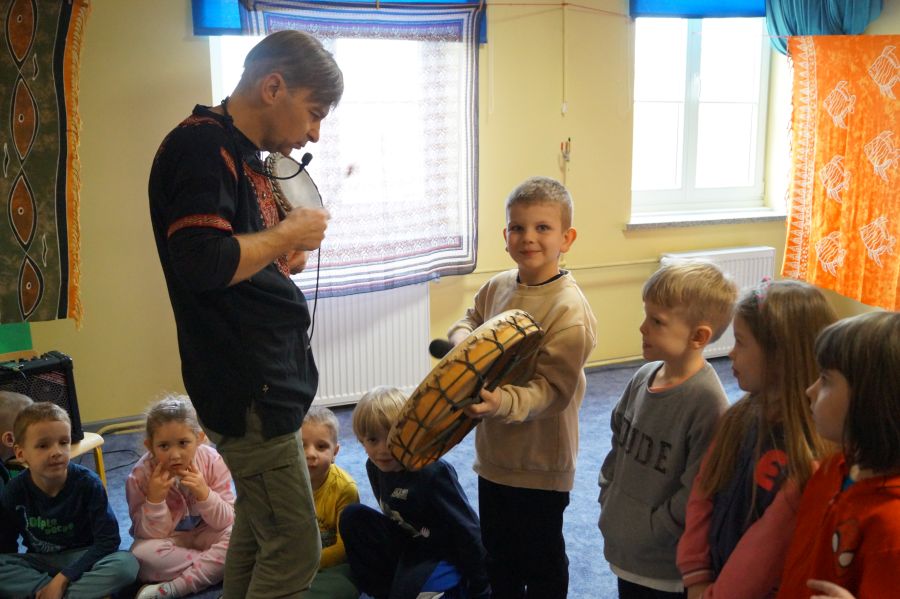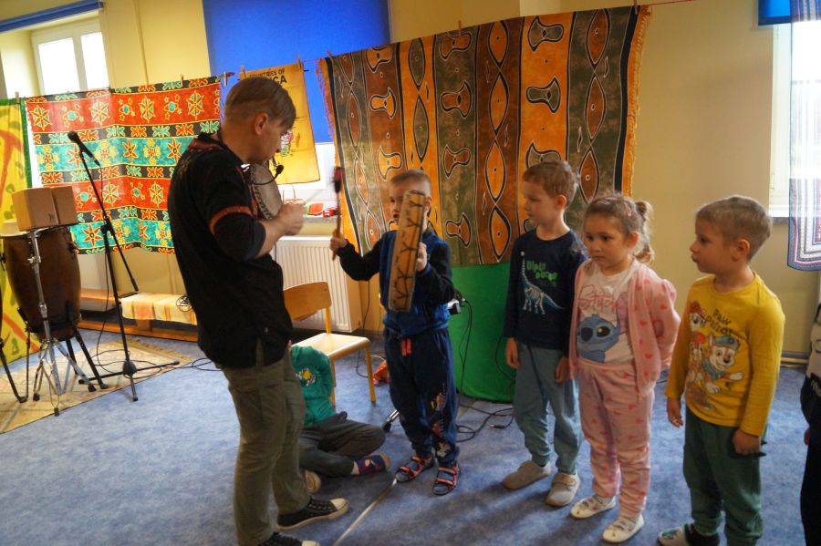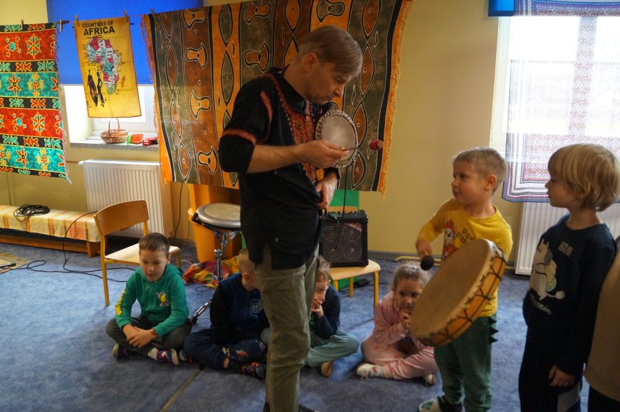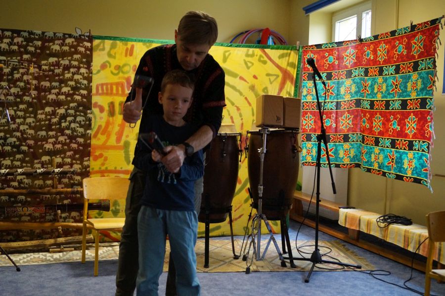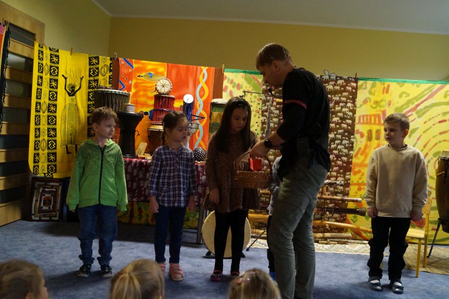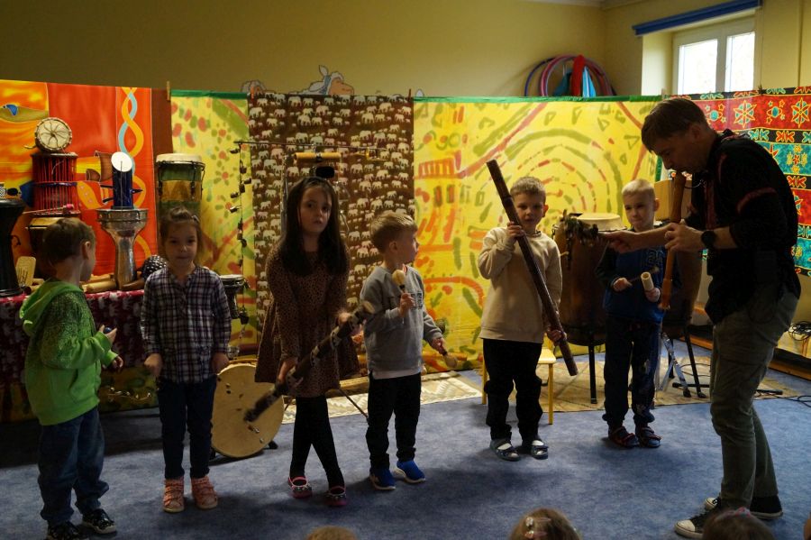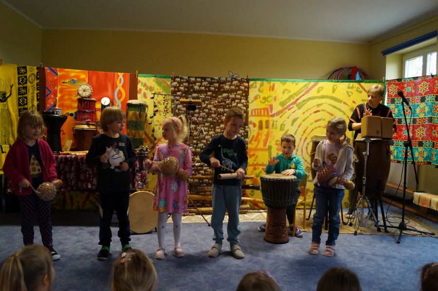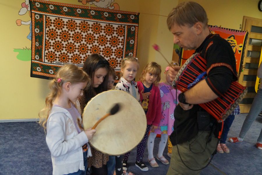 Nasze starsze dzieci już po raz któryś z kolei miały okazję zobaczyć oraz wykorzystać w praktyce instrumentarium z różnych krajów/ kontynentów. Dzieci z radością i zapałem brały udział w spotkaniu.