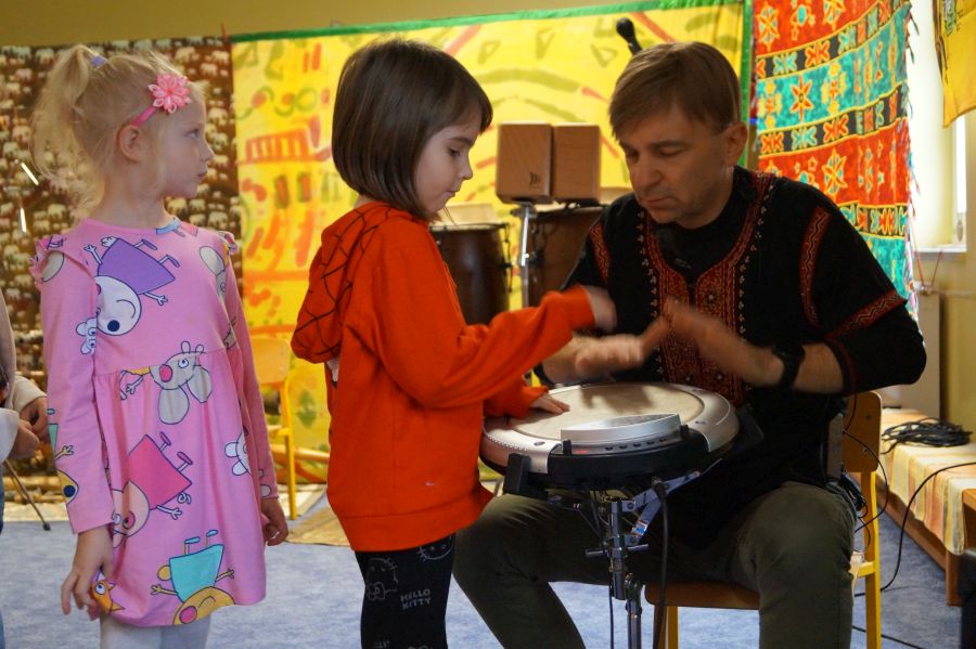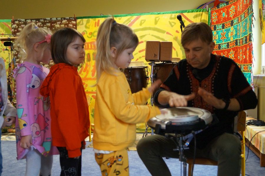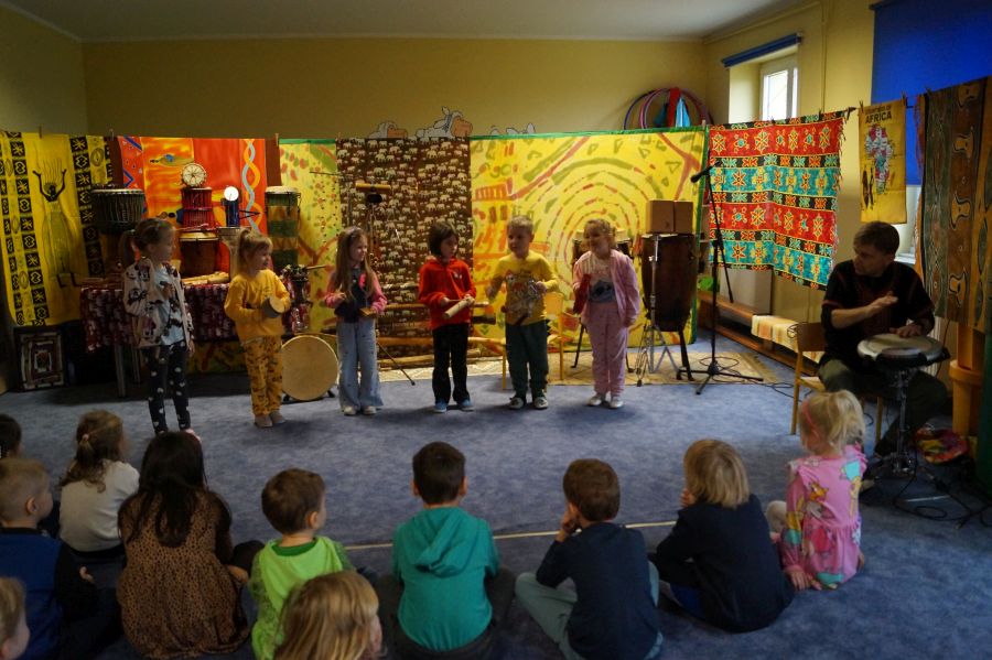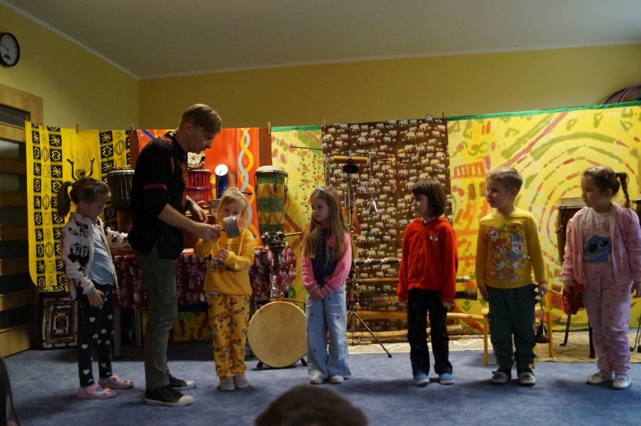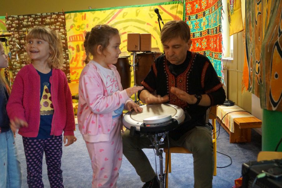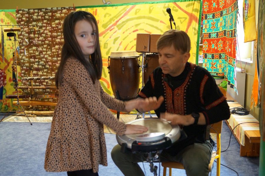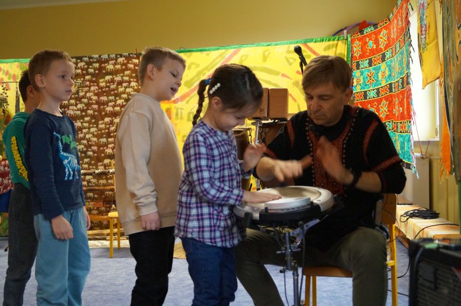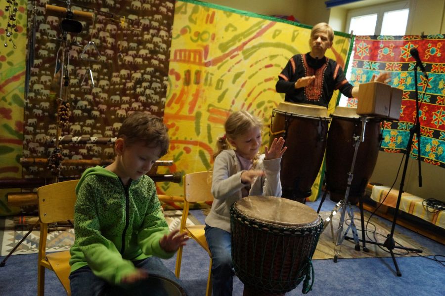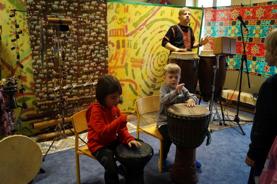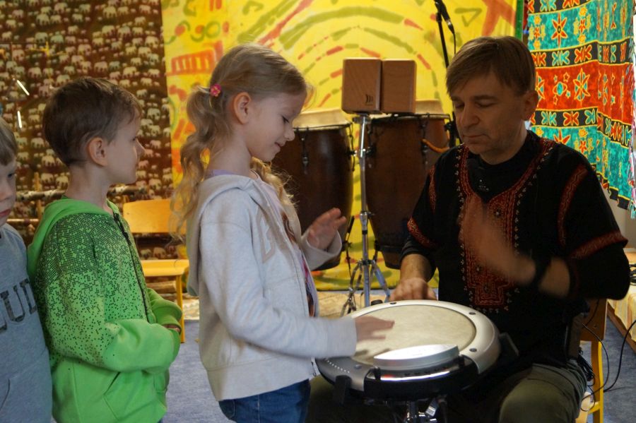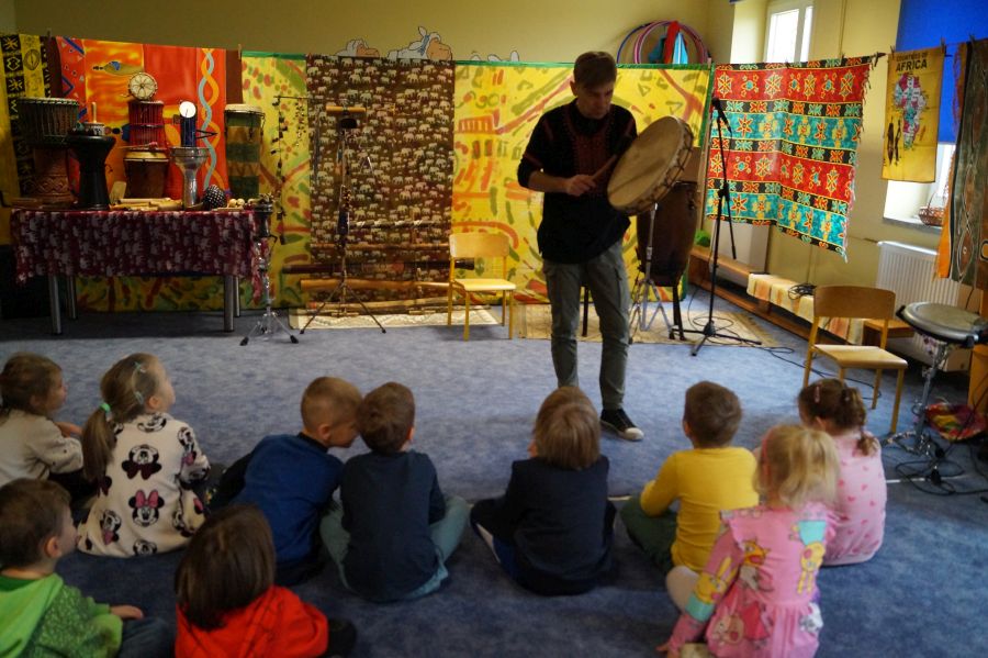 Nasze starsze dzieci już po raz któryś z kolei miały okazję zobaczyć oraz wykorzystać w praktyce instrumentarium z różnych krajów/ kontynentów. Dzieci z radością i zapałem brały udział w spotkaniu.