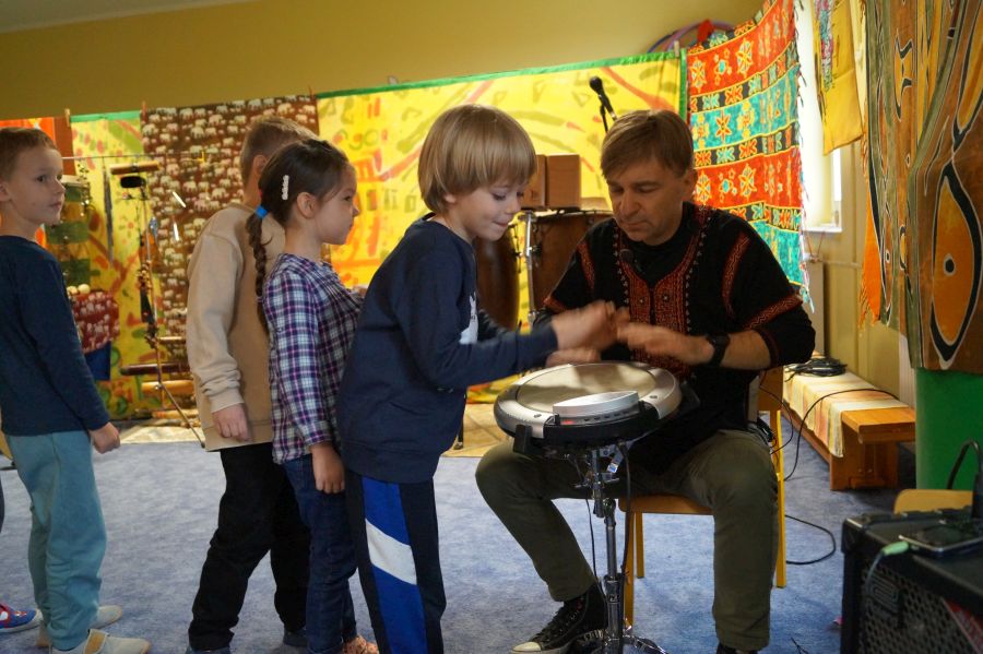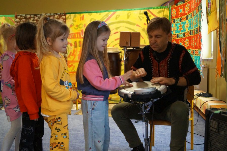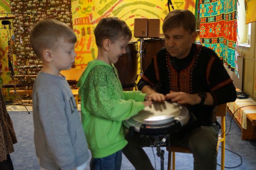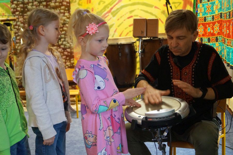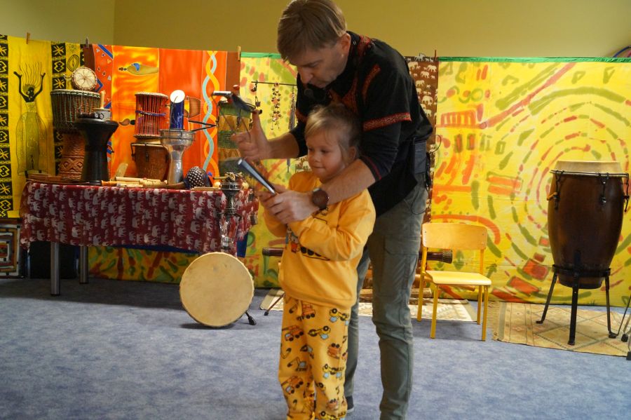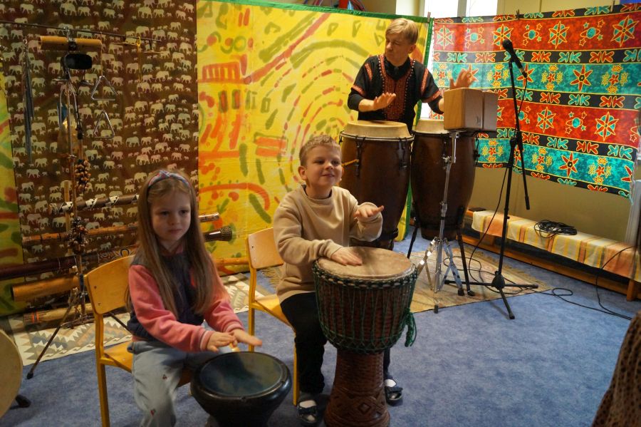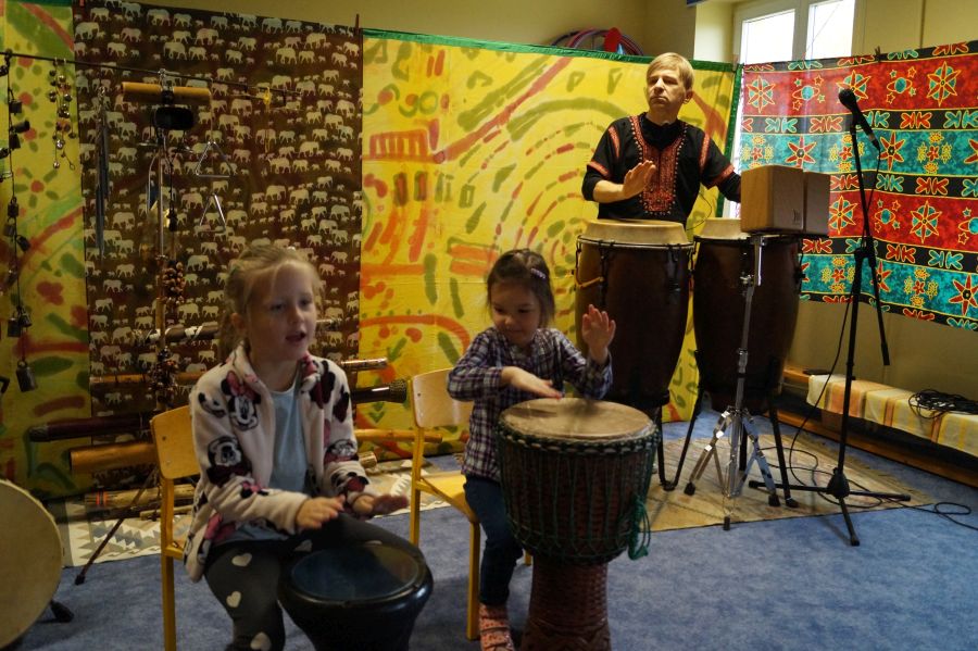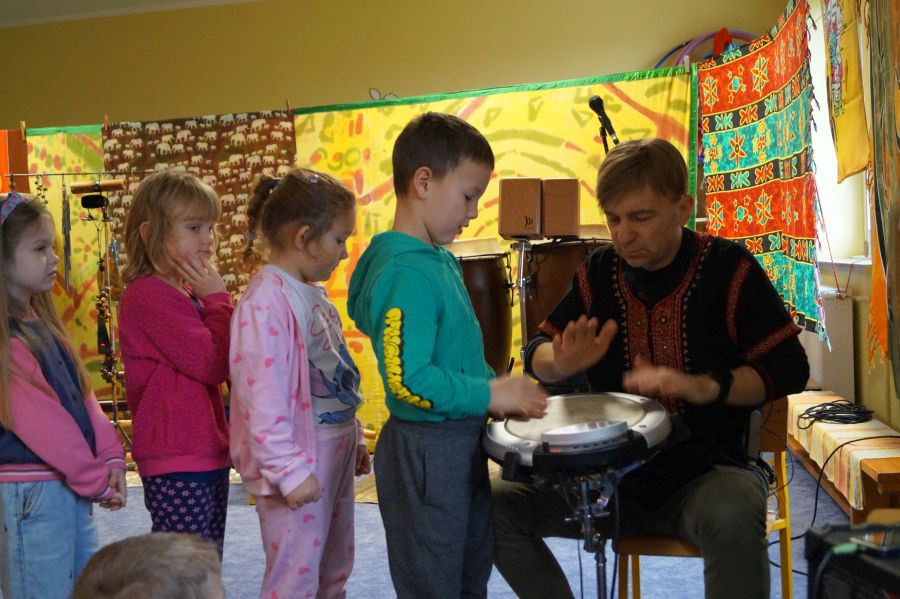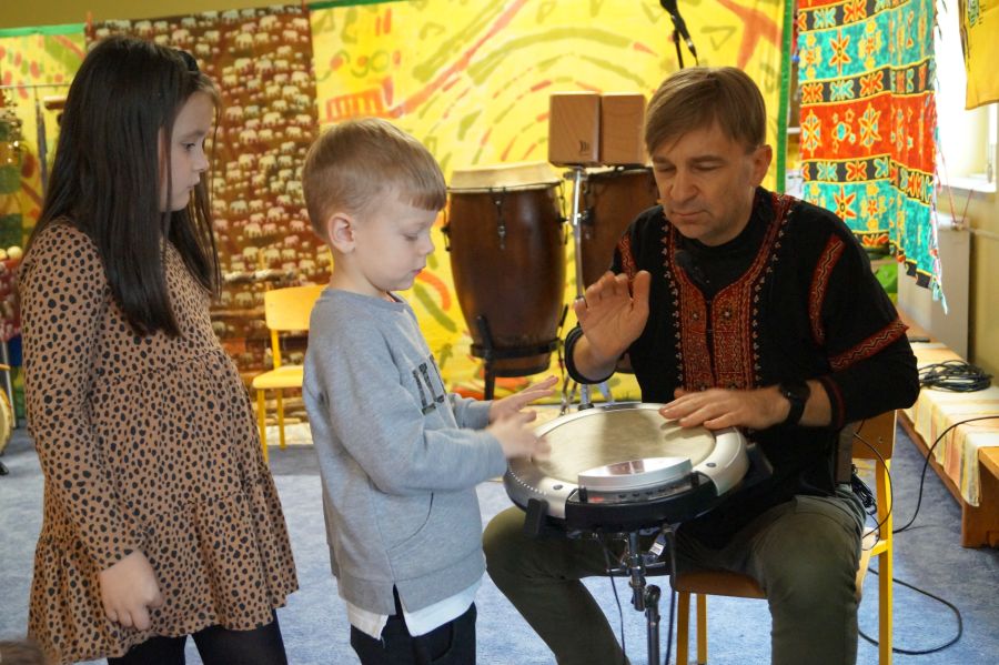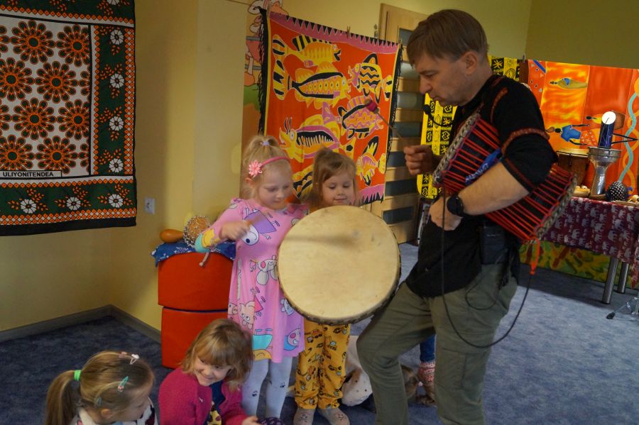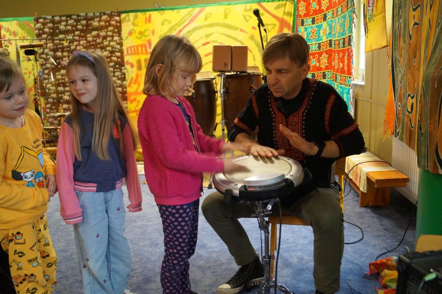 Nasze starsze dzieci już po raz któryś z kolei miały okazję zobaczyć oraz wykorzystać w praktyce instrumentarium z różnych krajów/ kontynentów. Dzieci z radością i zapałem brały udział w spotkaniu.