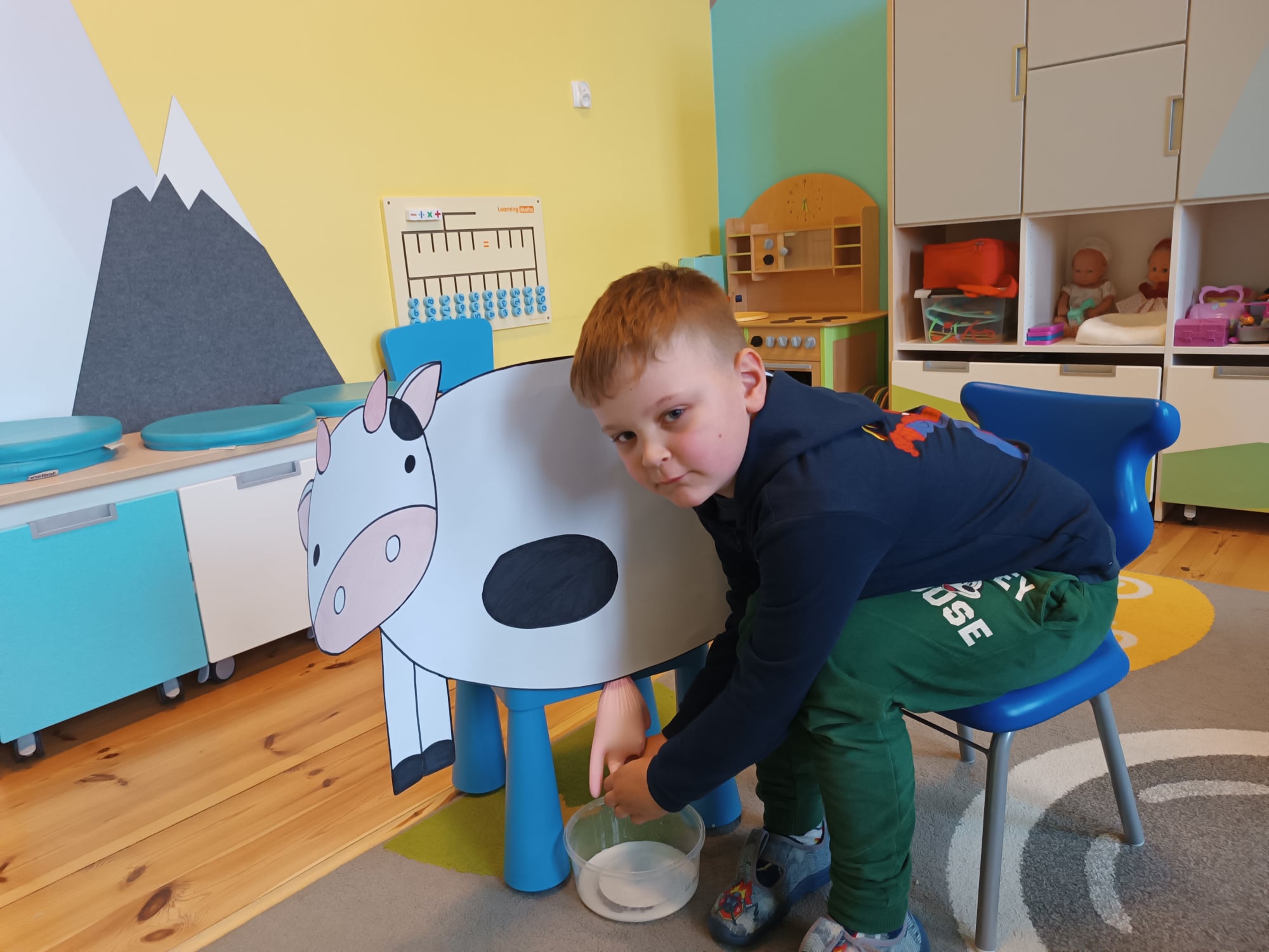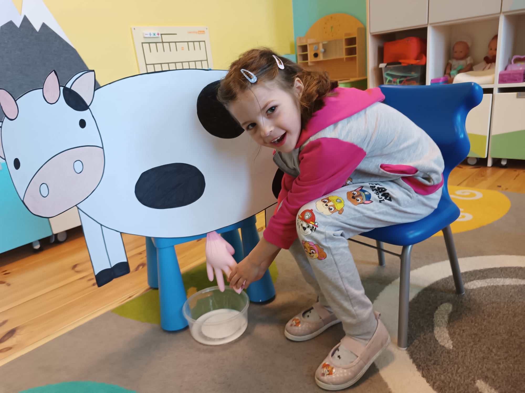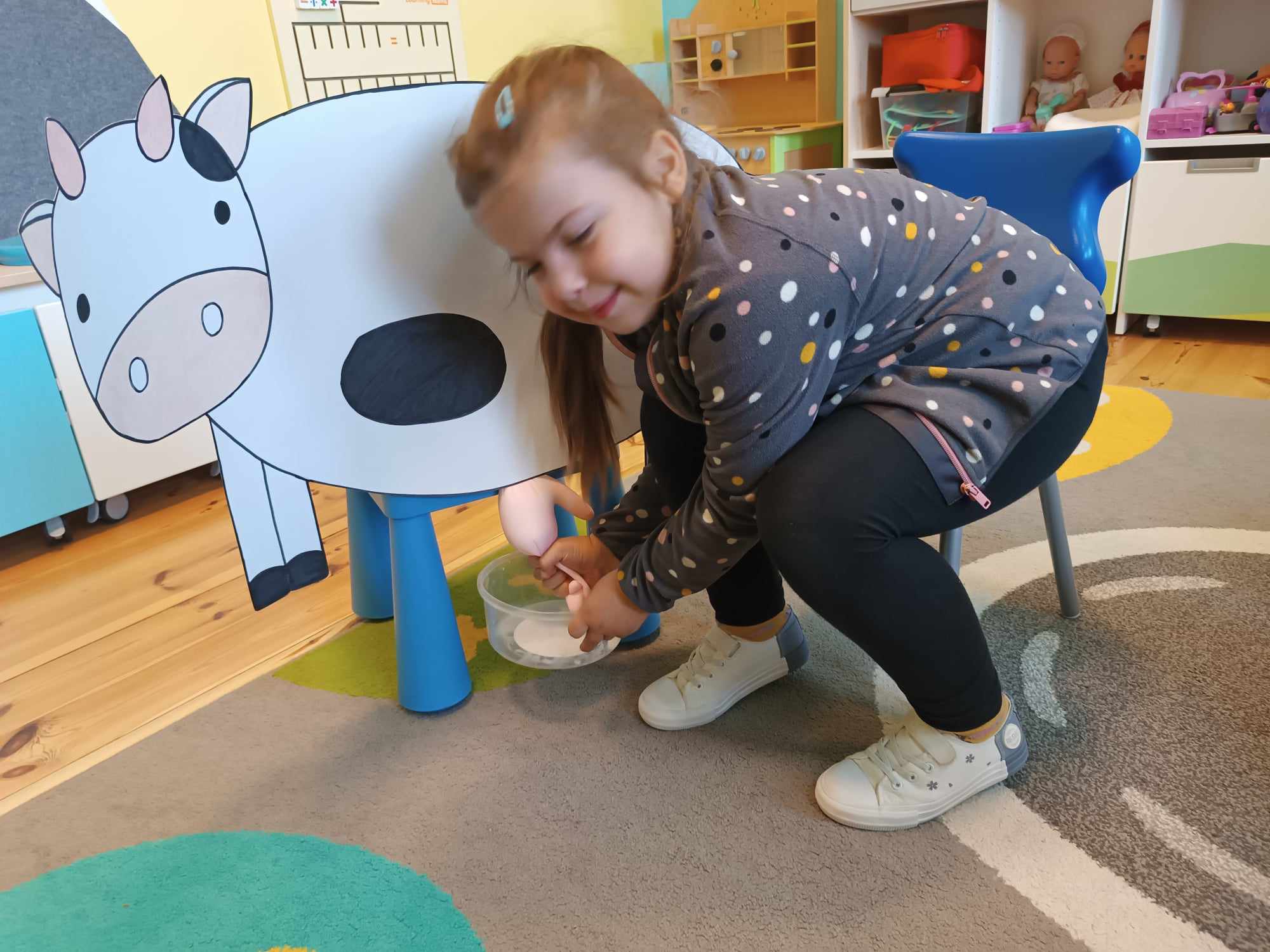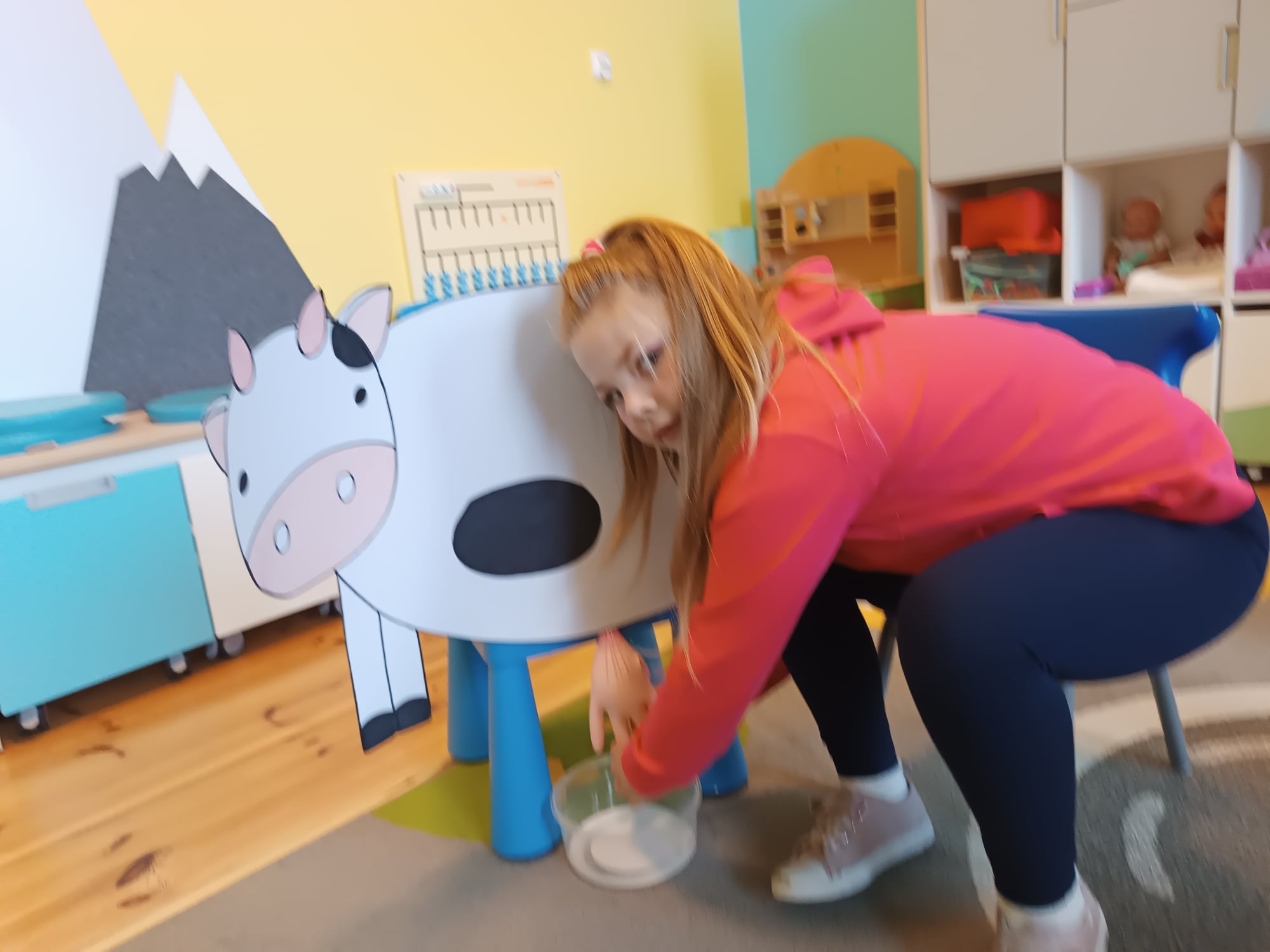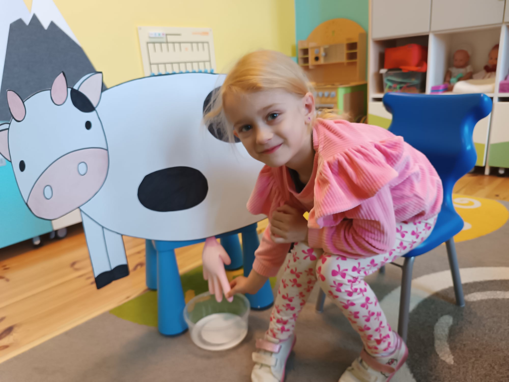 Grupa starsza realizuje w tym tygodniu temat kompleksowy dotyczący zwierząt na wsi. Starszacy utrwalili nazwy zwierząt, nazywali ich młode oraz domy, w których mieszkają. Ponadto dowiedziały się, co nam dają zwierzęta gospodarskie i co możemy zrobić z tym produktów. Na koniec wykonali zadanie praktyczne – dojenie krowy.