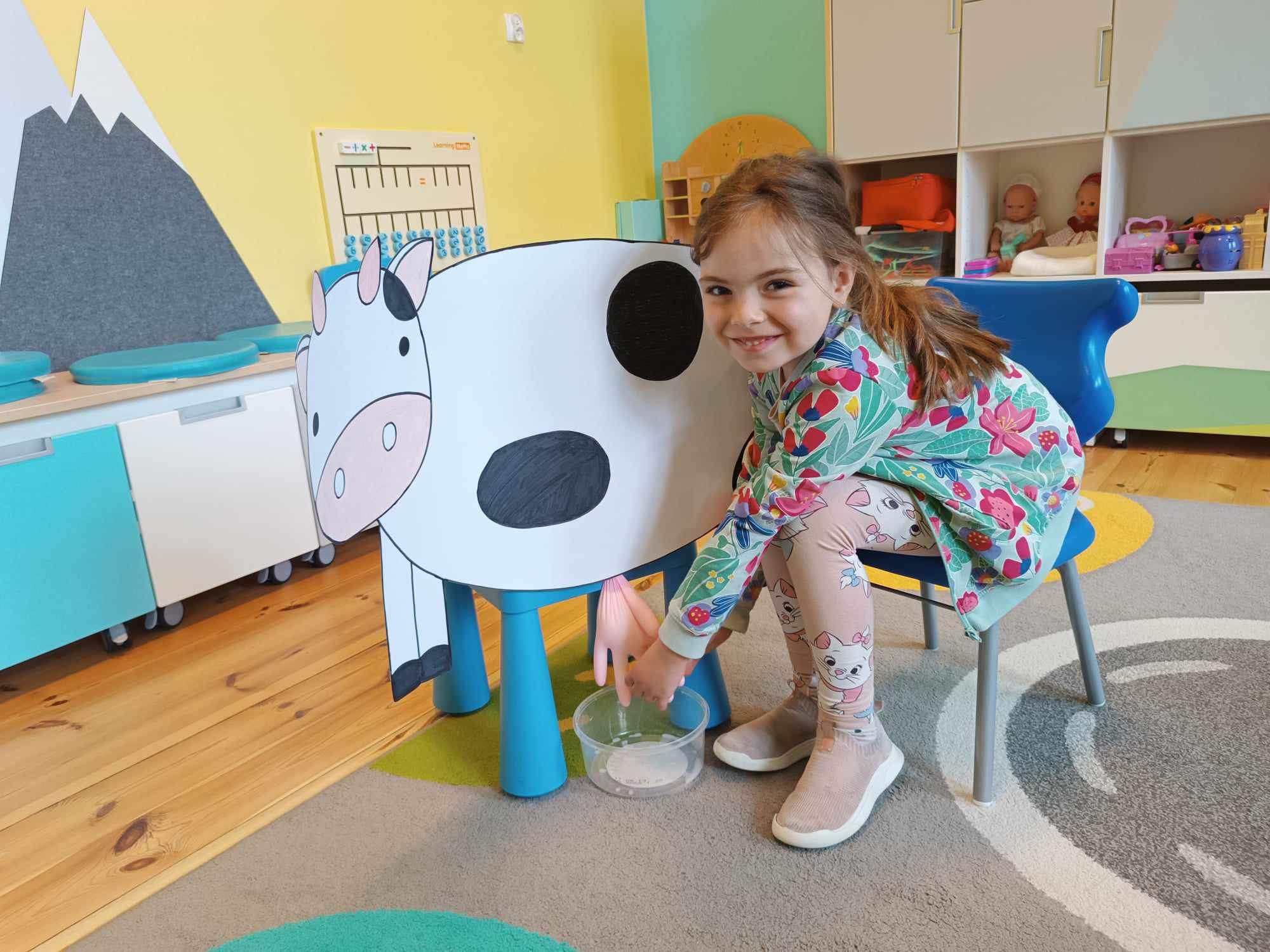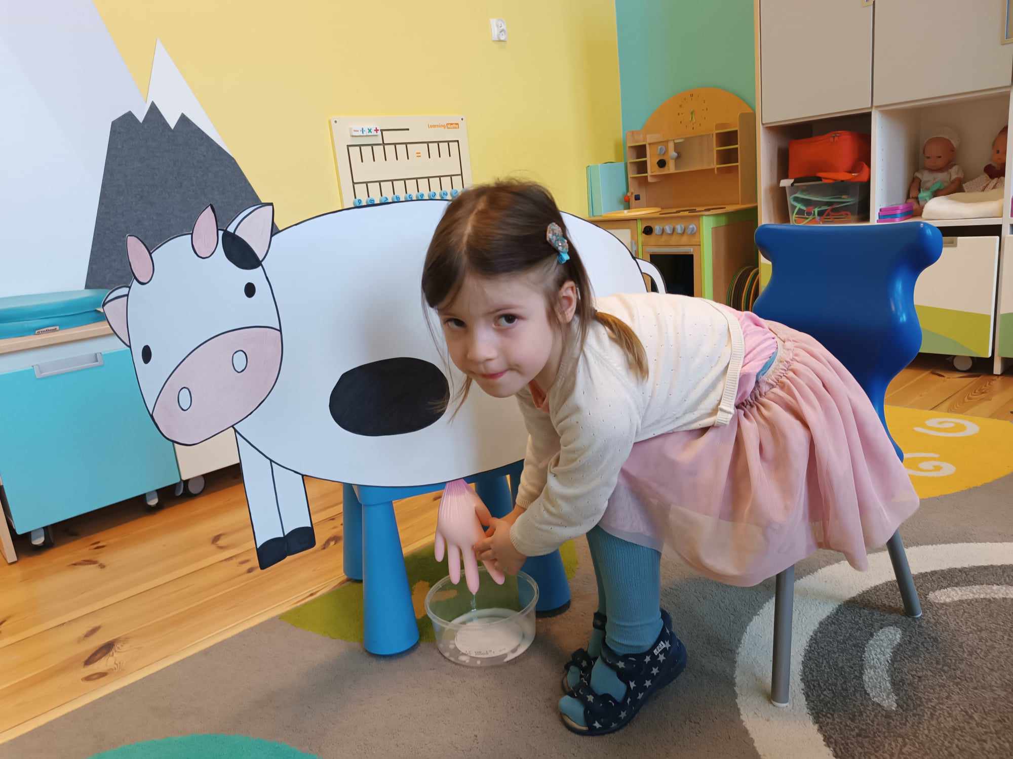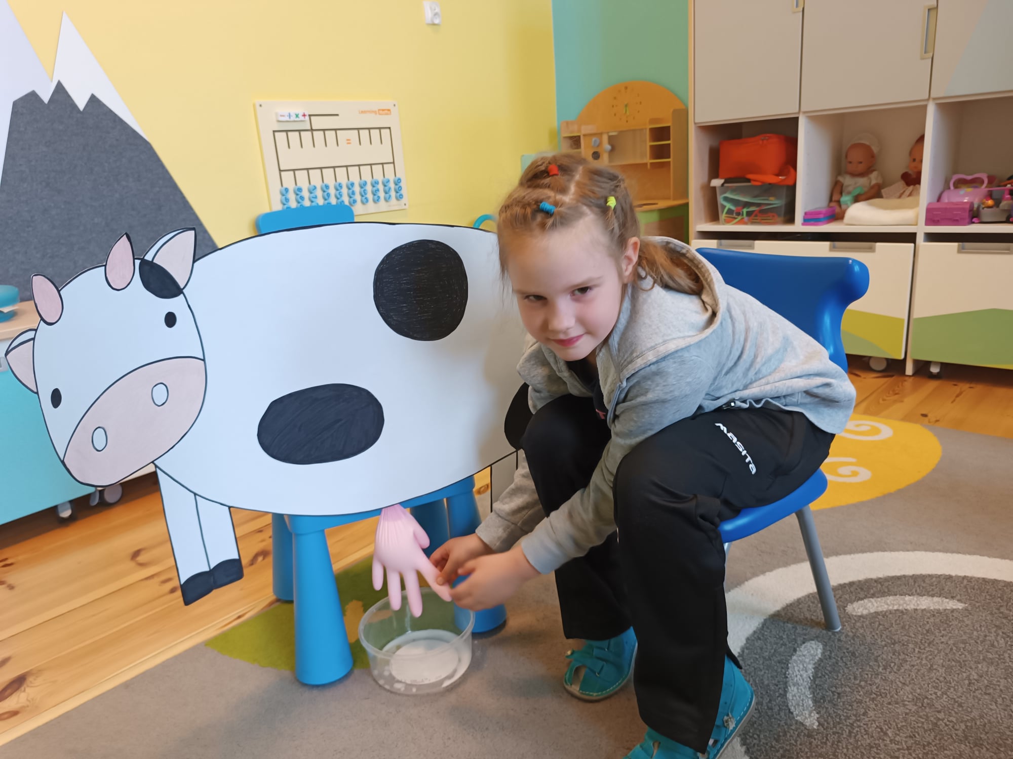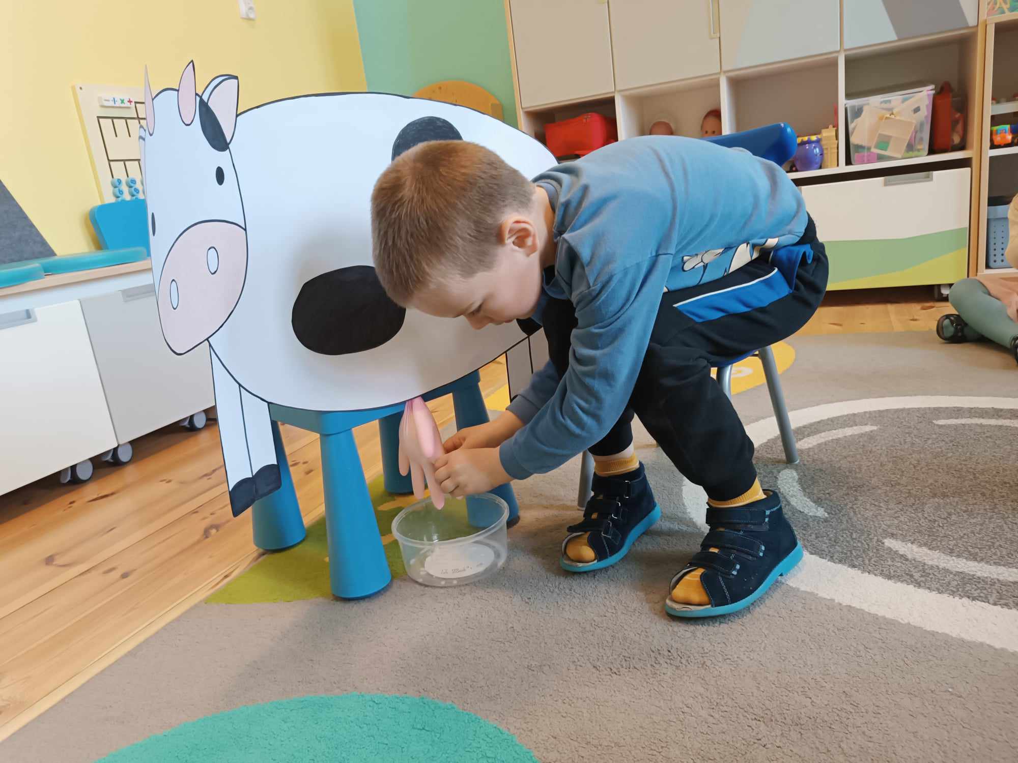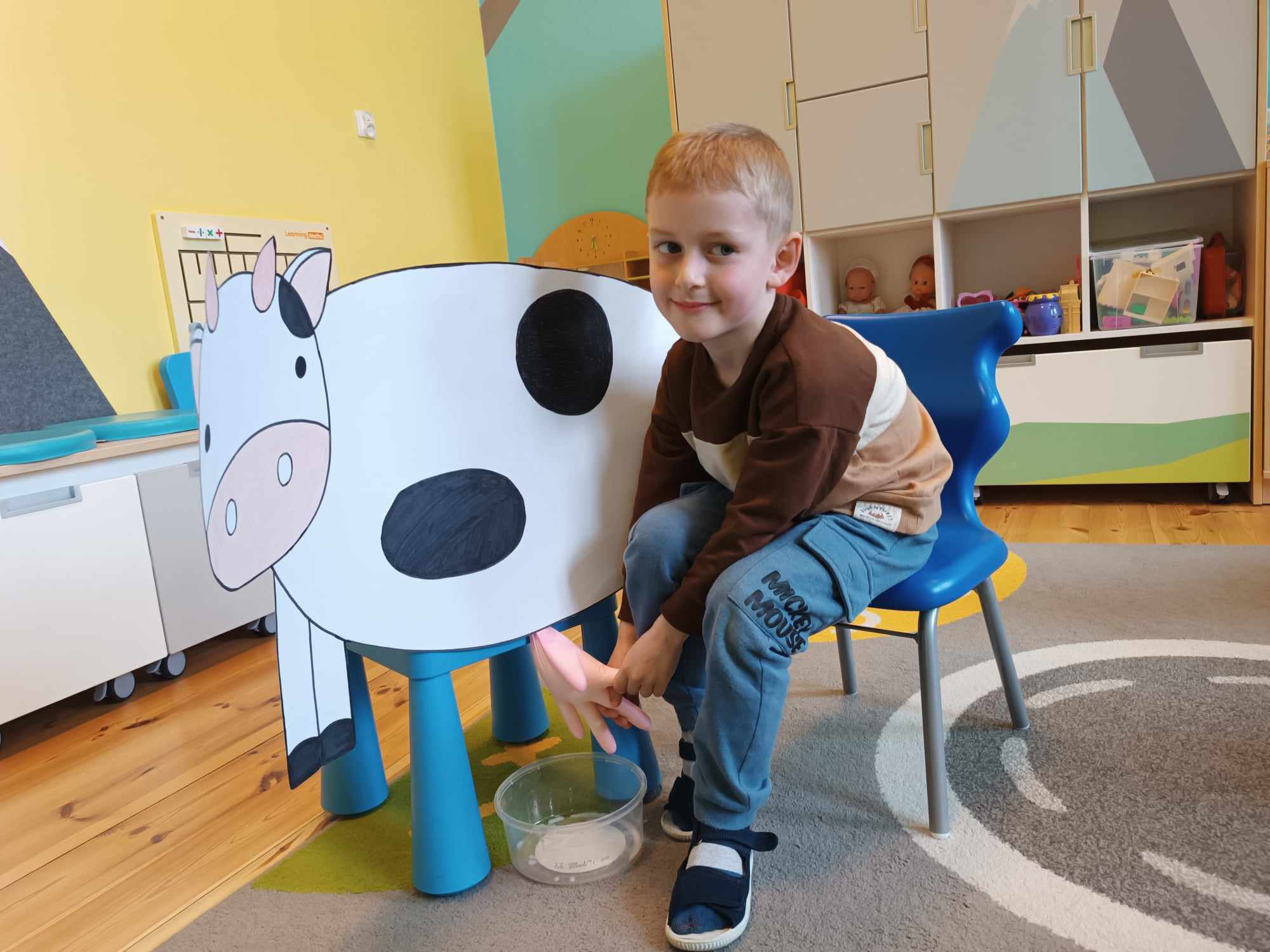Grupa starsza realizuje w tym tygodniu temat kompleksowy dotyczący zwierząt na wsi. Starszacy utrwalili nazwy zwierząt, nazywali ich młode oraz domy, w których mieszkają. Ponadto dowiedziały się, co nam dają zwierzęta gospodarskie i co możemy zrobić z tym produktów. Na koniec wykonali zadanie praktyczne – dojenie krowy.