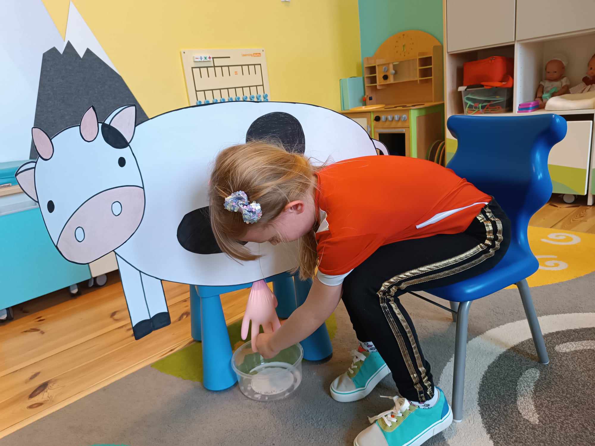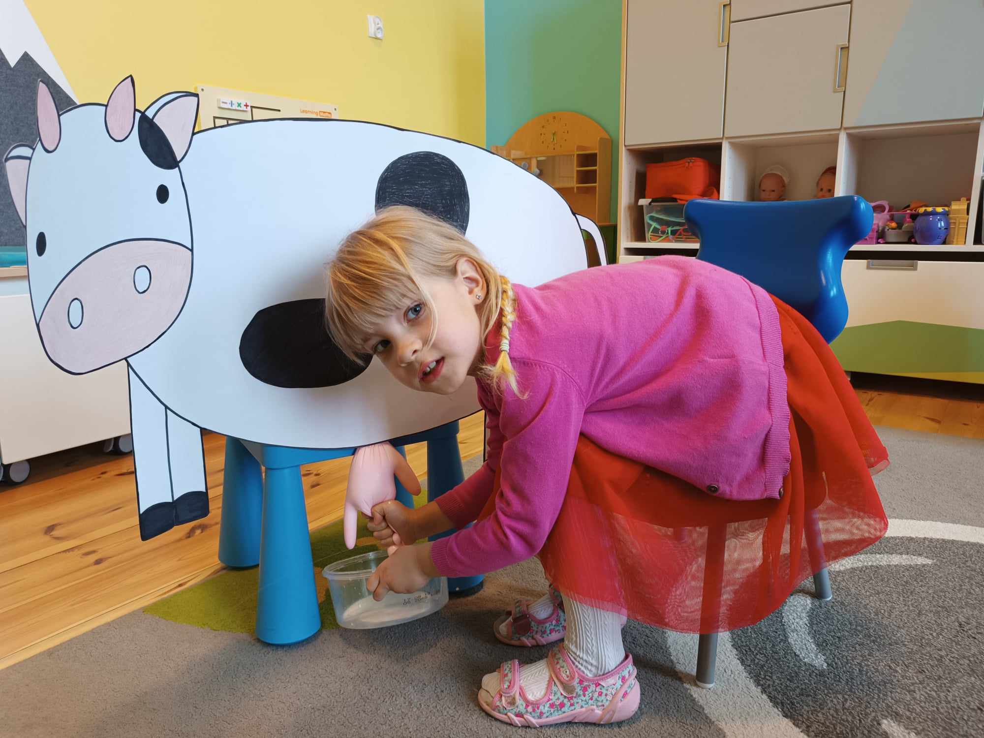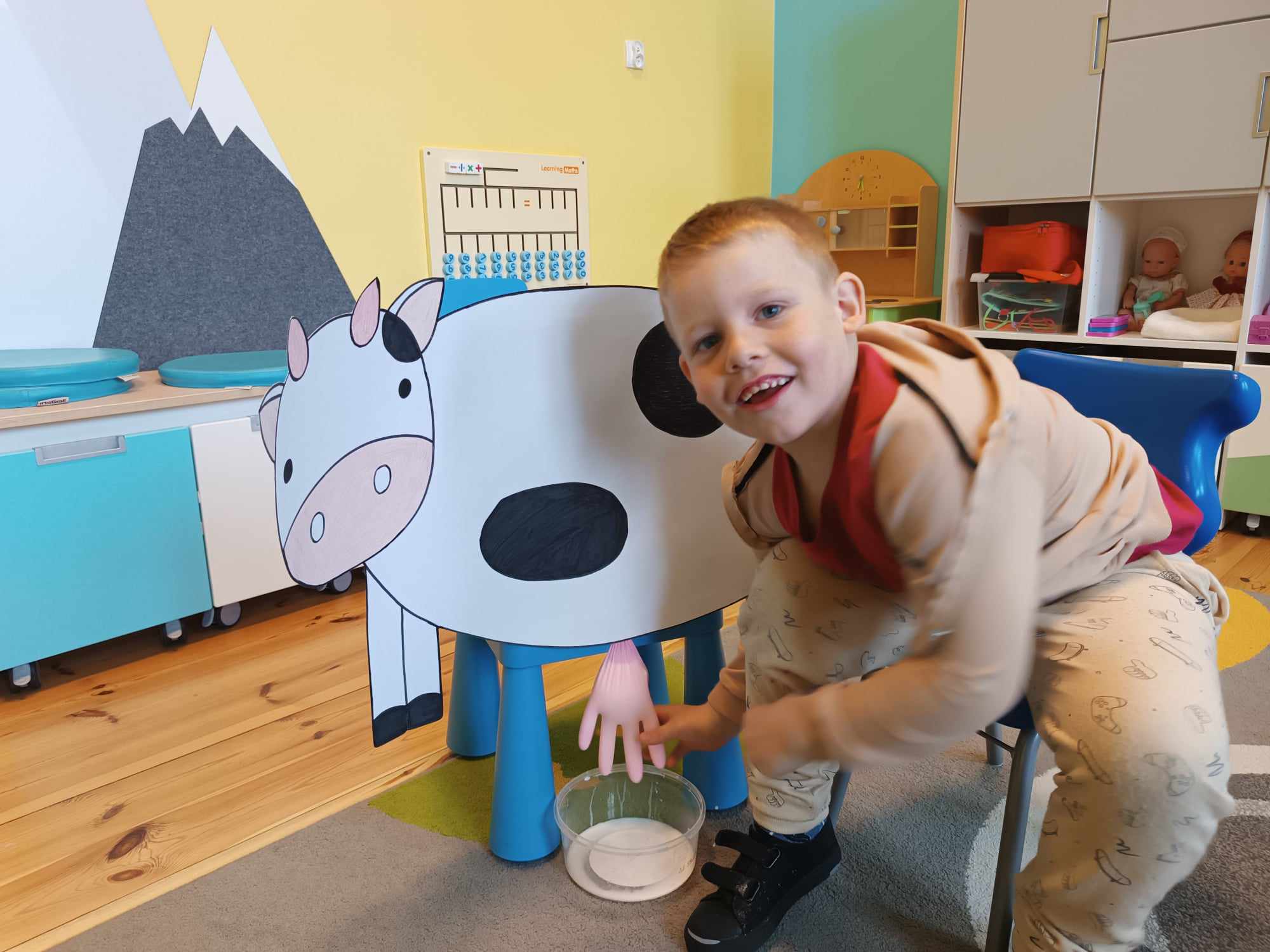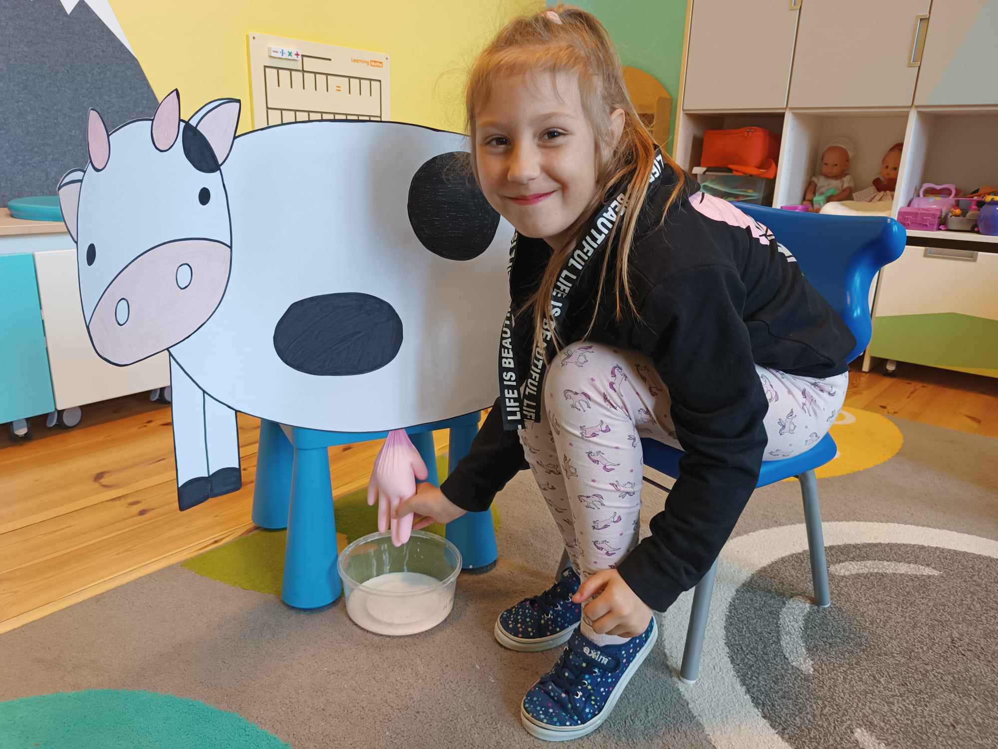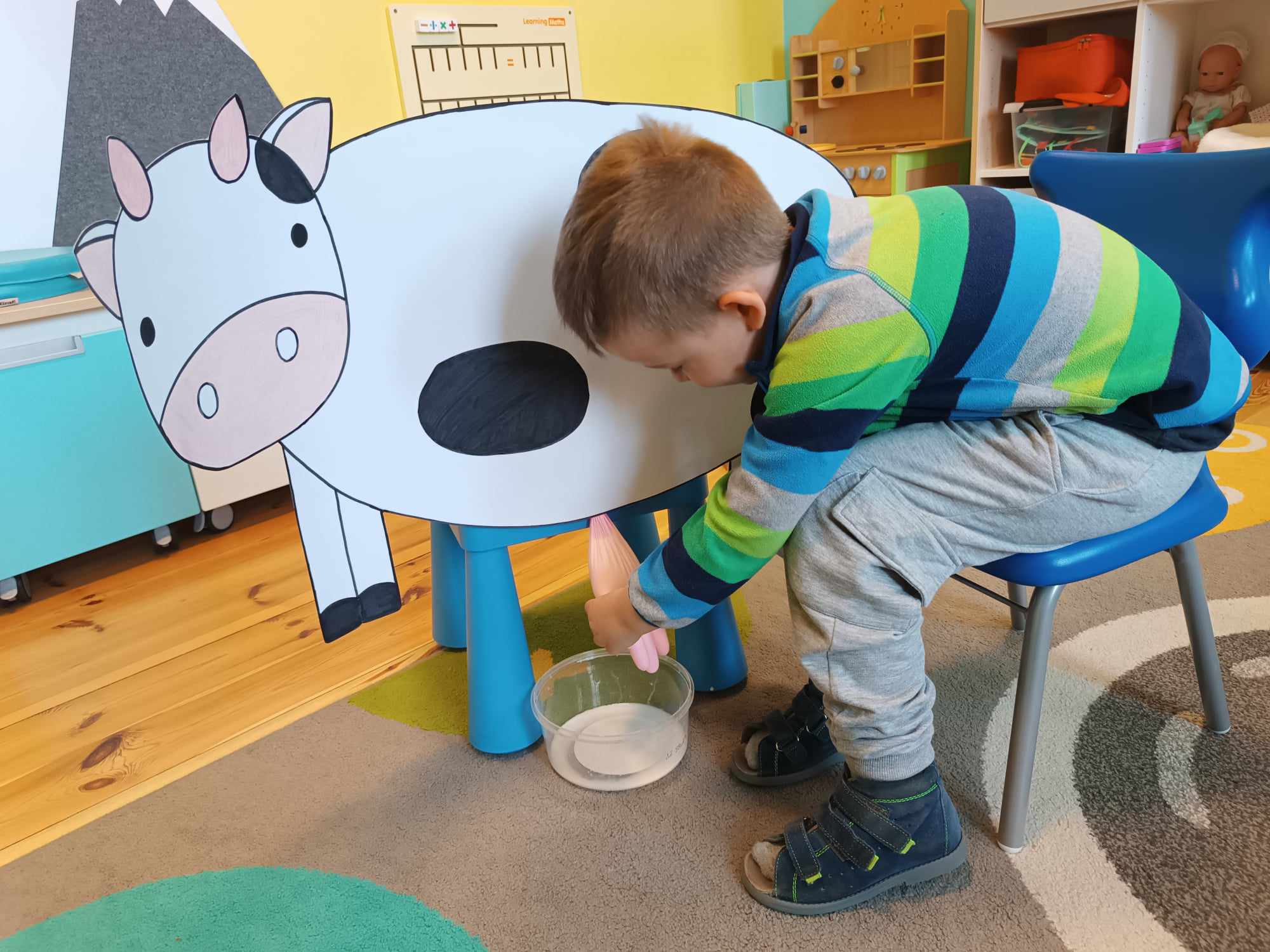 Grupa starsza realizuje w tym tygodniu temat kompleksowy dotyczący zwierząt na wsi. Starszacy utrwalili nazwy zwierząt, nazywali ich młode oraz domy, w których mieszkają. Ponadto dowiedziały się, co nam dają zwierzęta gospodarskie i co możemy zrobić z tym produktów. Na koniec wykonali zadanie praktyczne – dojenie krowy.