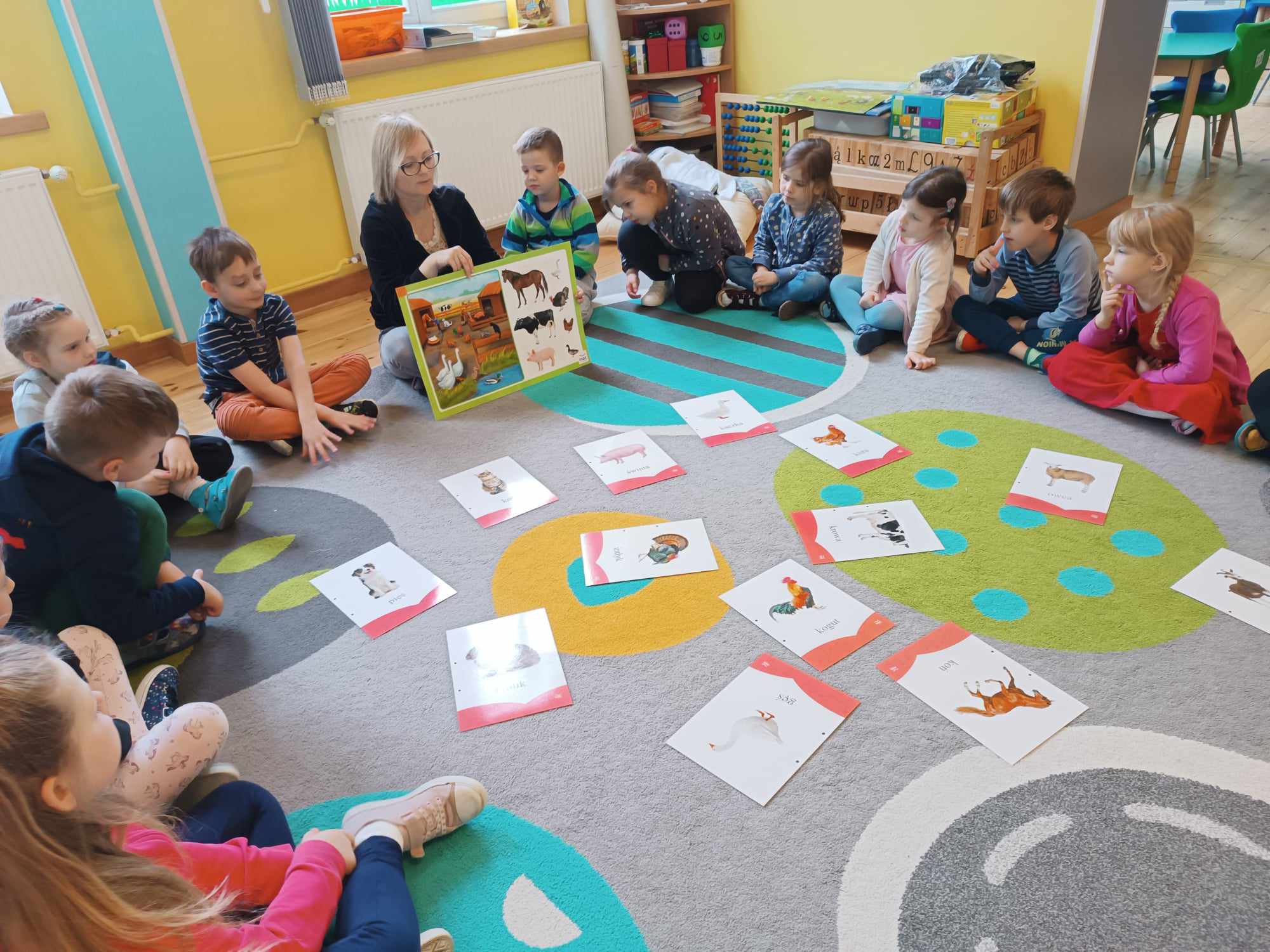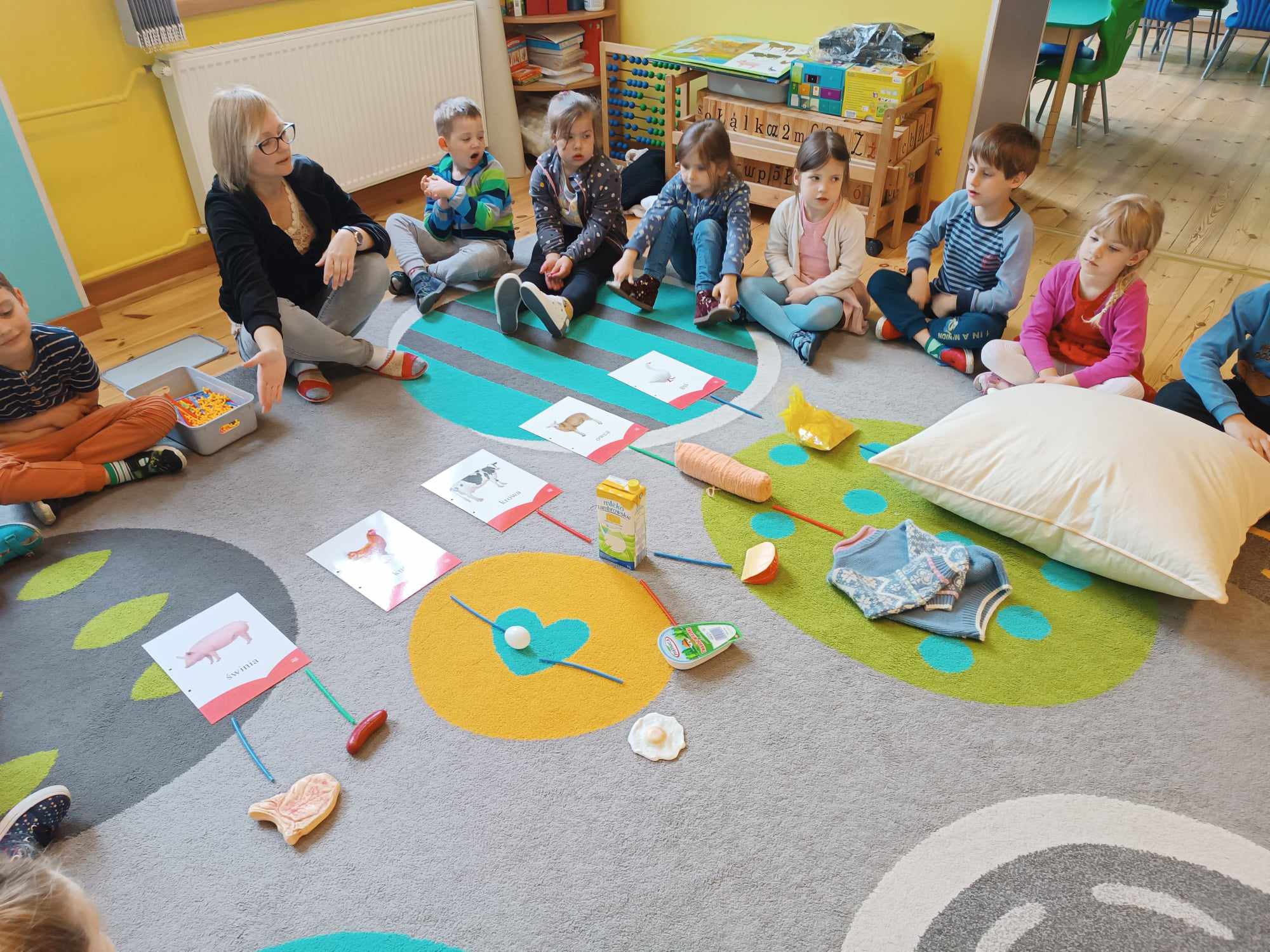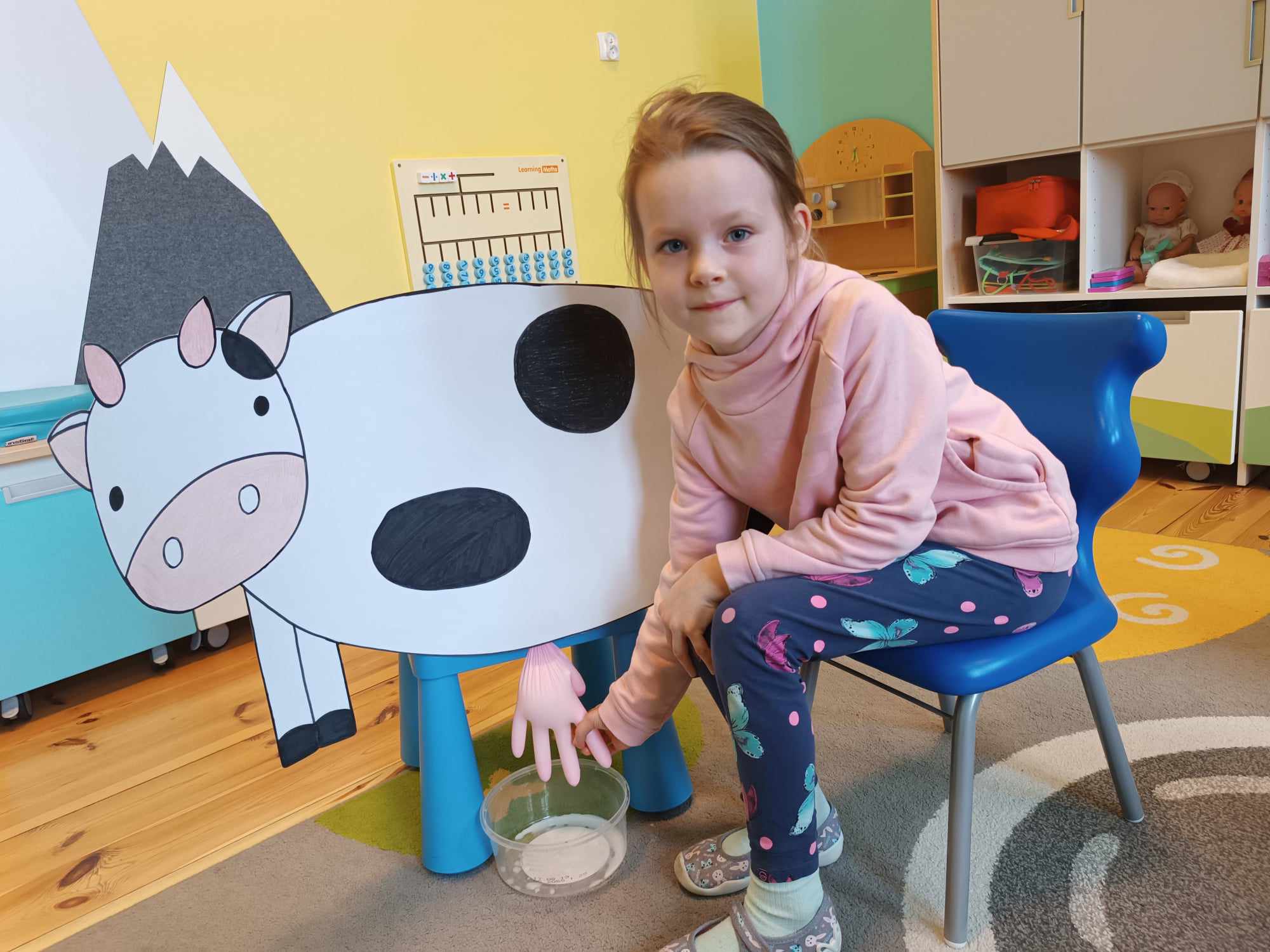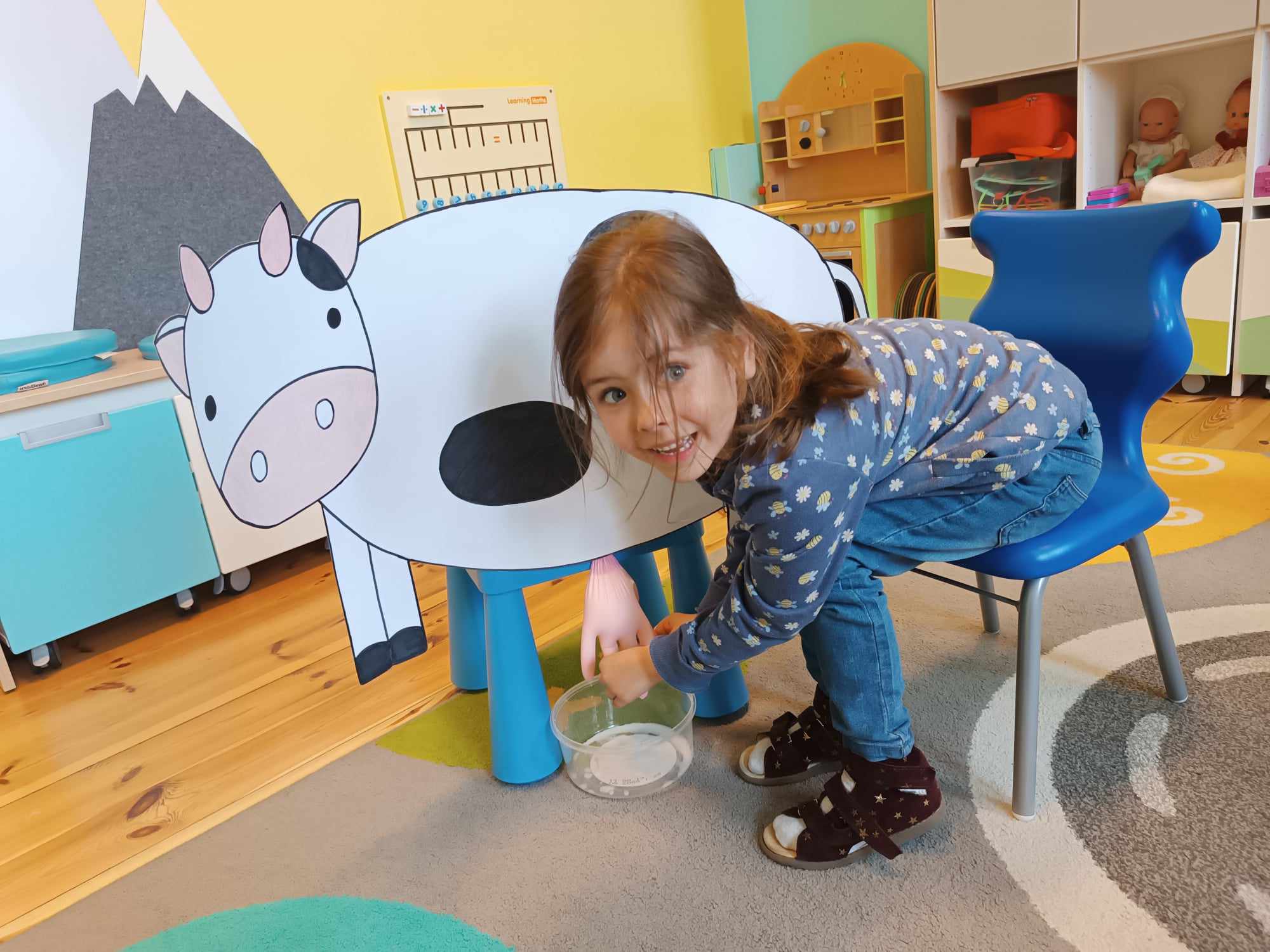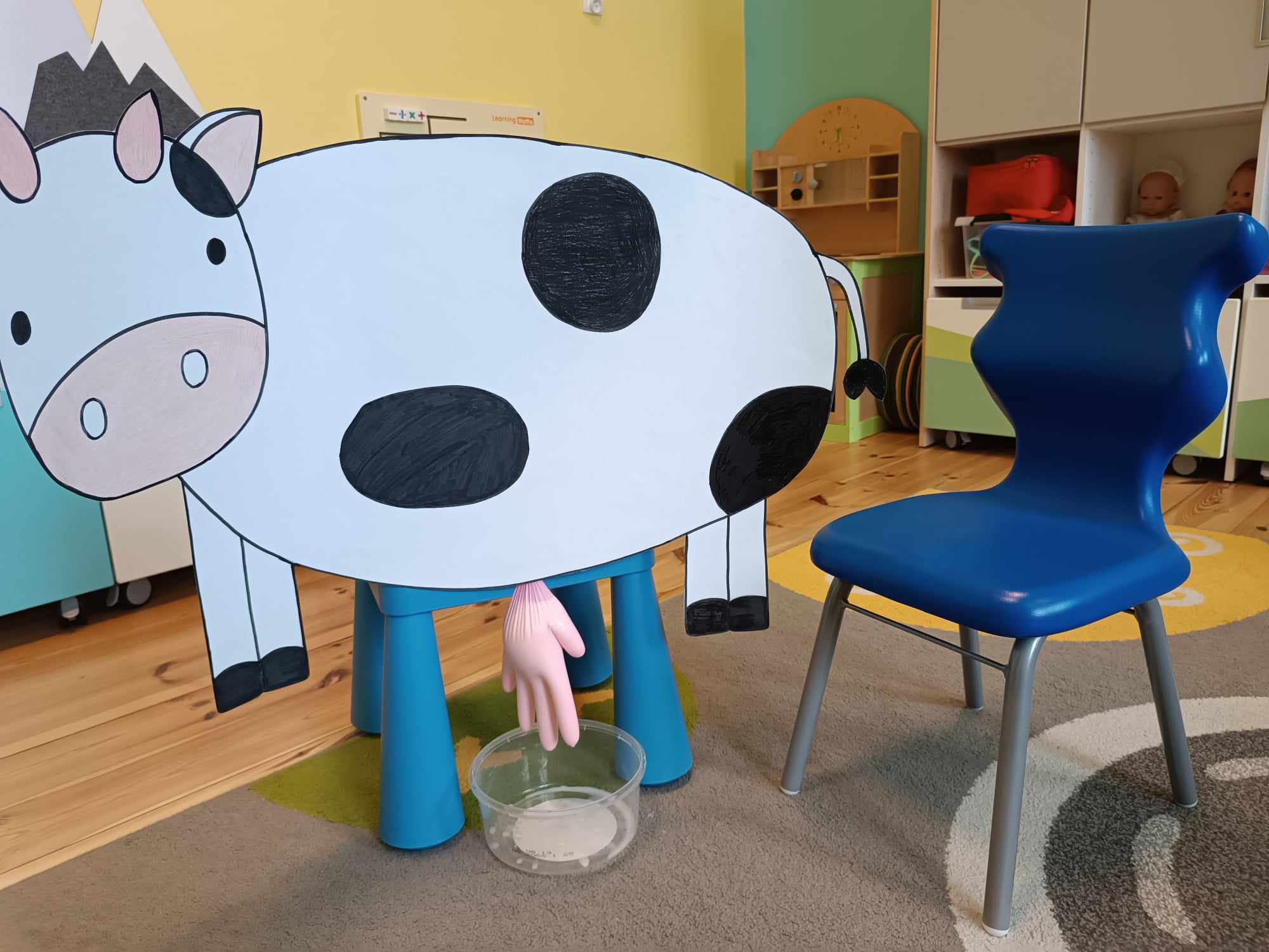 Grupa starsza realizuje w tym tygodniu temat kompleksowy dotyczący zwierząt na wsi. Starszacy utrwalili nazwy zwierząt, nazywali ich młode oraz domy, w których mieszkają. Ponadto dowiedziały się, co nam dają zwierzęta gospodarskie i co możemy zrobić z tym produktów. Na koniec wykonali zadanie praktyczne – dojenie krowy.