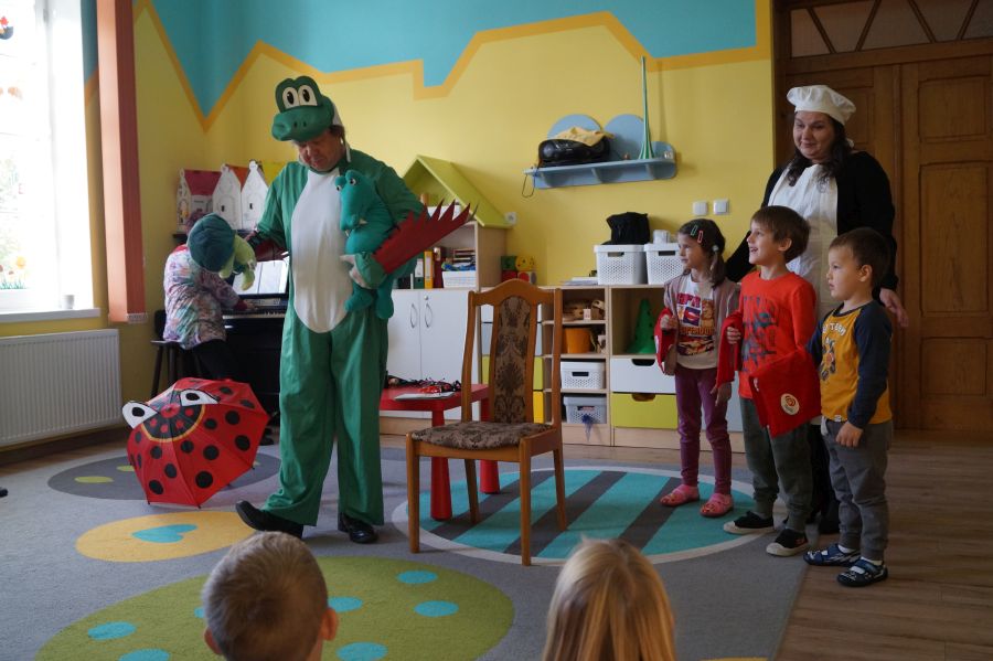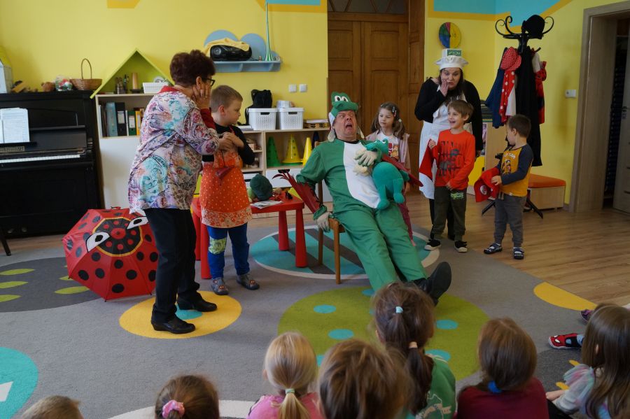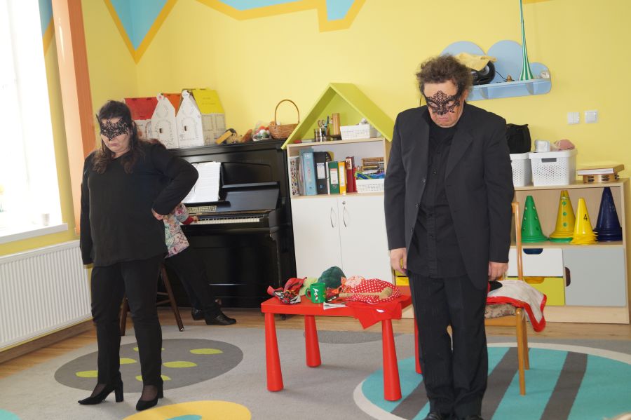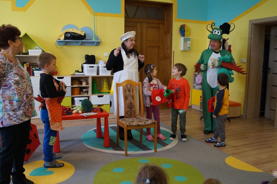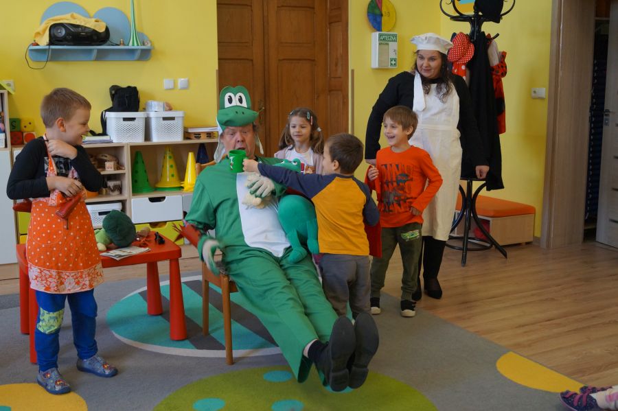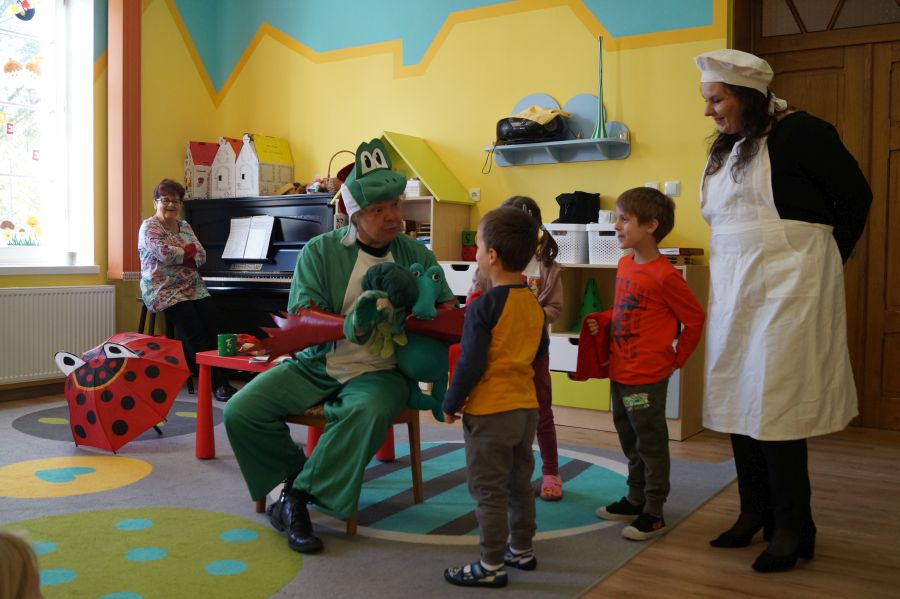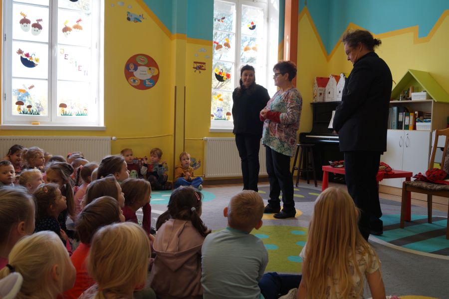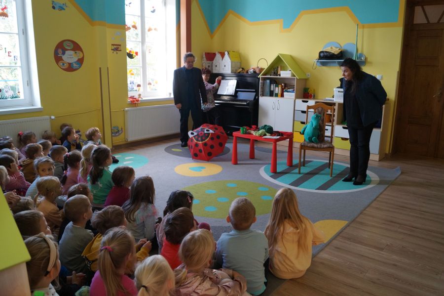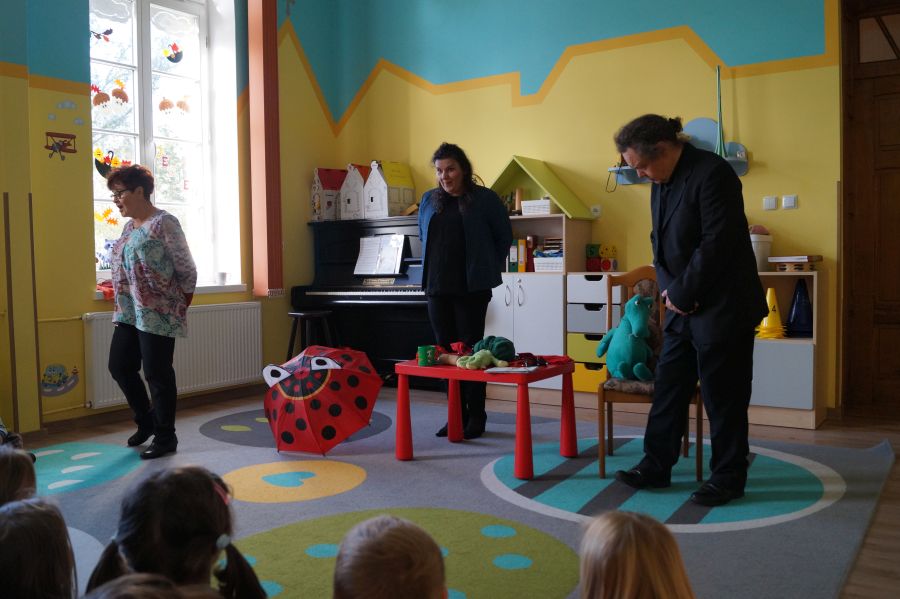 Do przedszkola zawitali bardzo mili goście- pani Mirka Gawryłkiewicz wraz z państwem Dyngosz. Dzieci usłyszały kilka muzycznych opowieści. Mogły też wcielić się w bajkowe postacie.