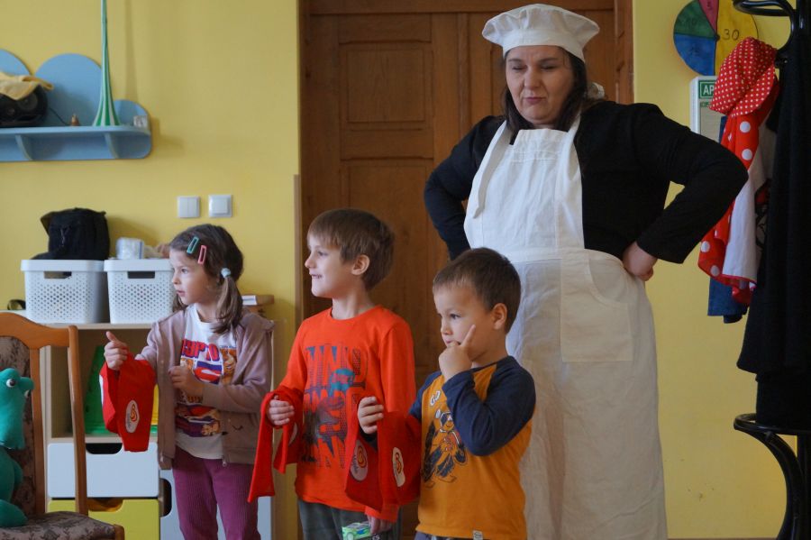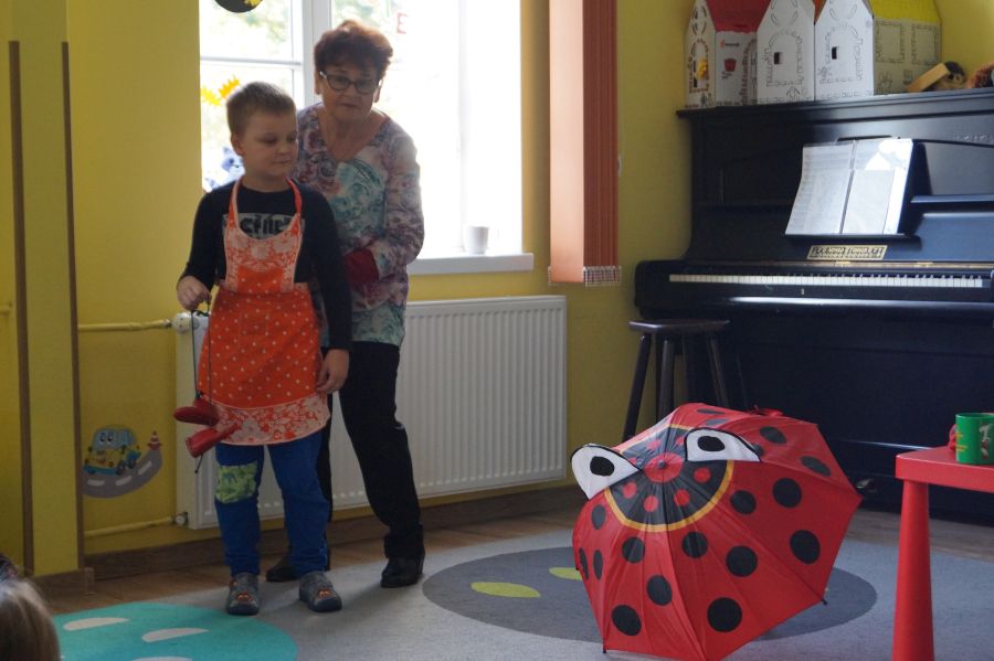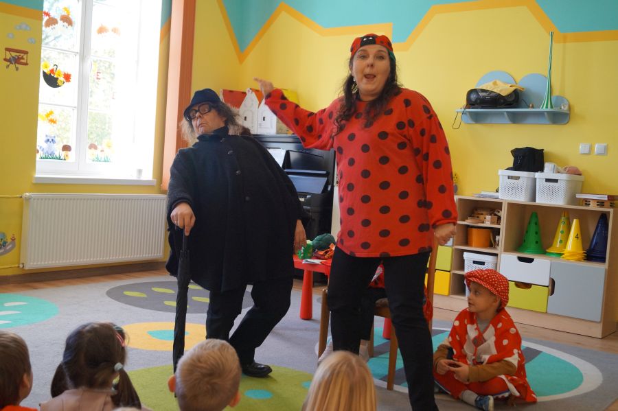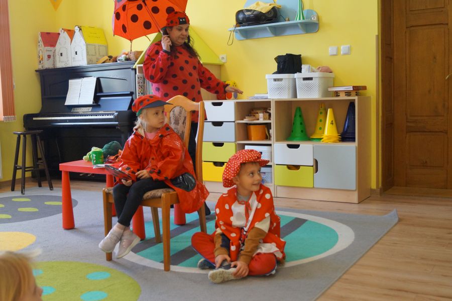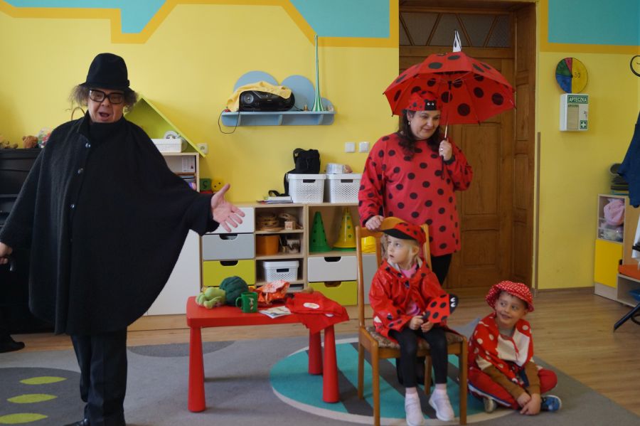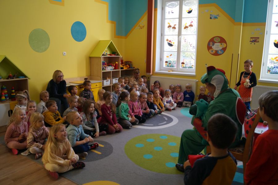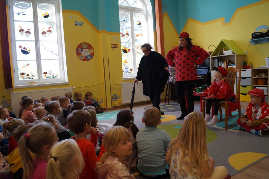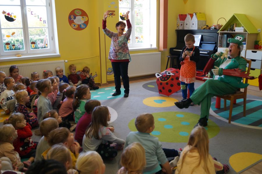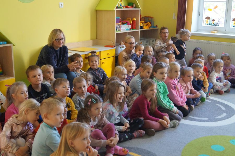 Do przedszkola zawitali bardzo mili goście- pani Mirka Gawryłkiewicz wraz z państwem Dyngosz. Dzieci usłyszały kilka muzycznych opowieści. Mogły też wcielić się w bajkowe postacie.