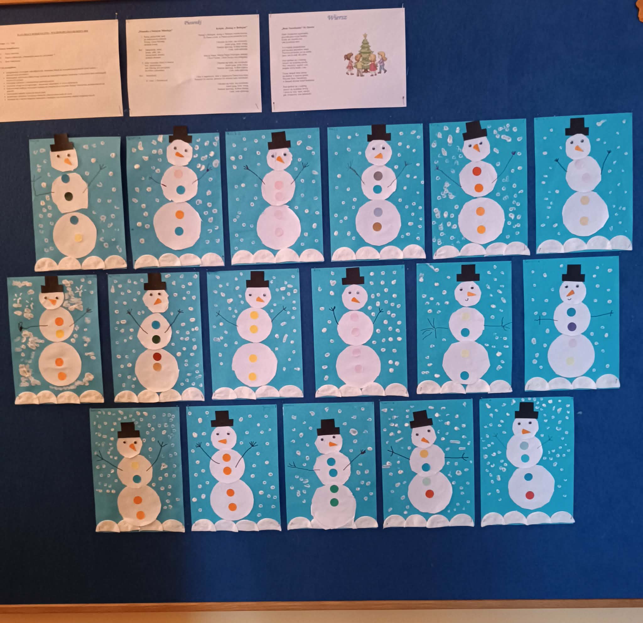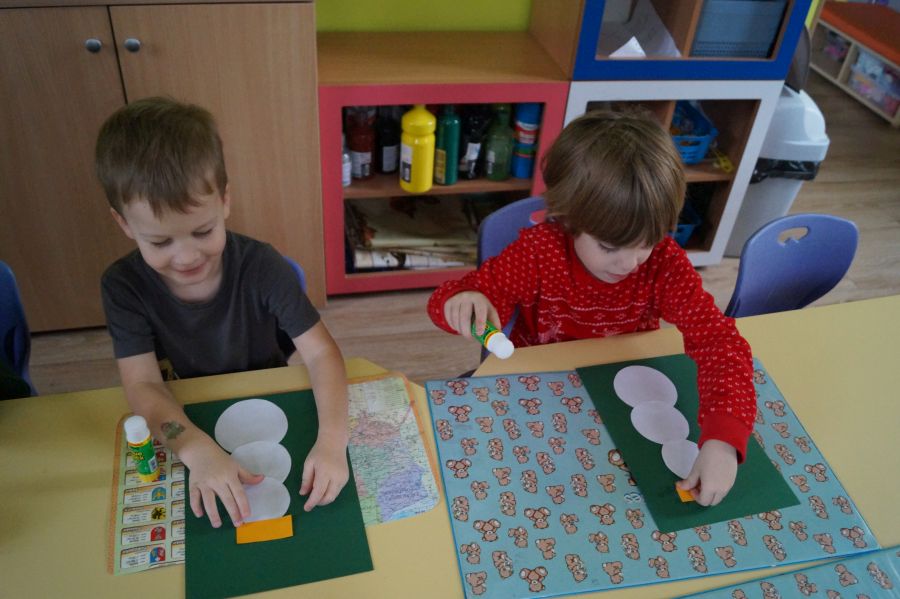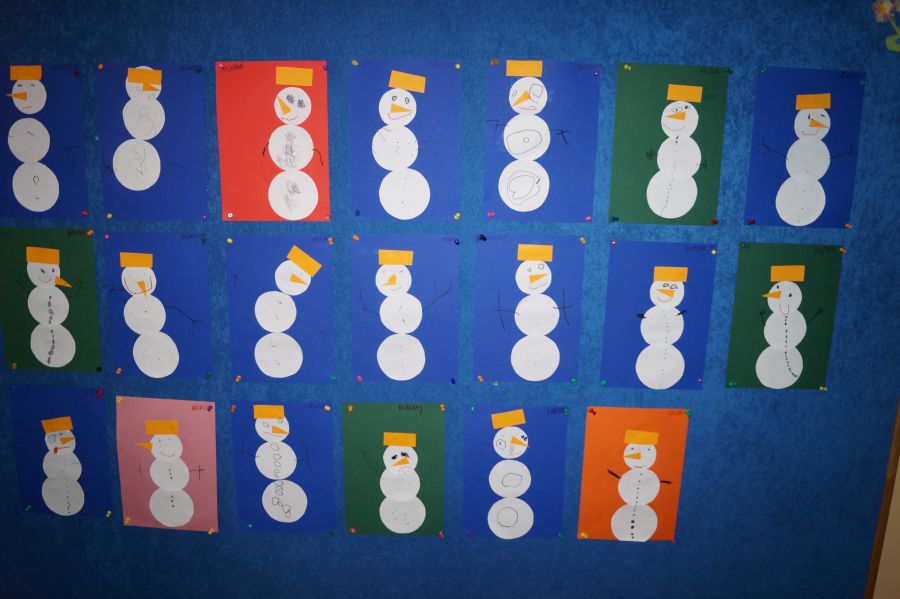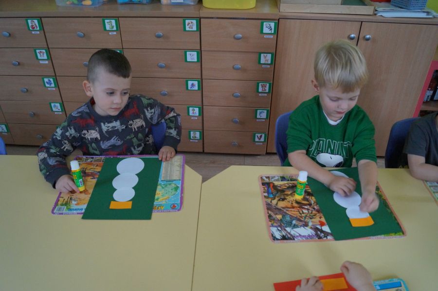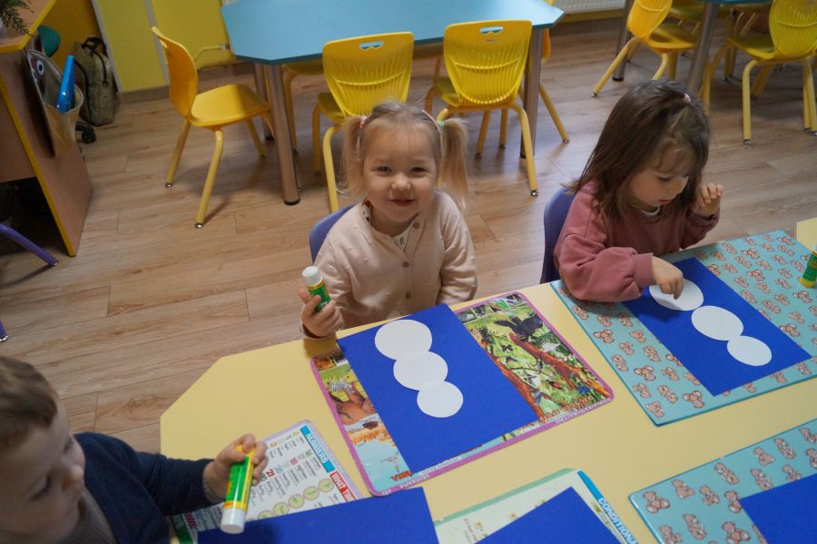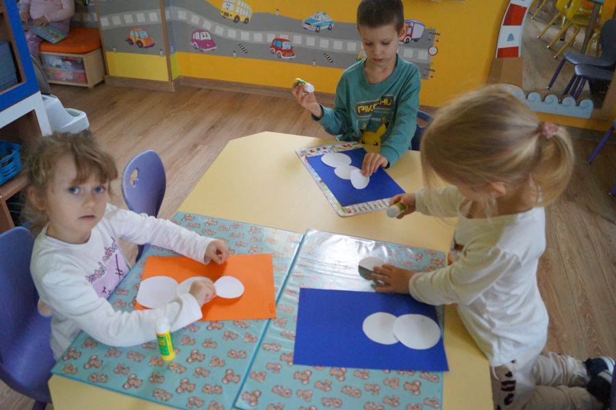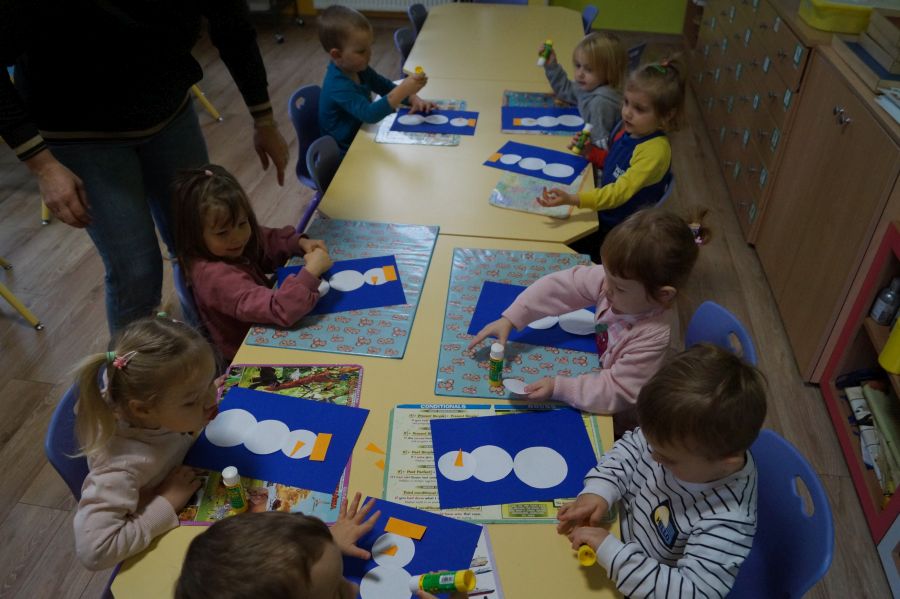 Podczas dzisiejszych zajęć matematyczno- plastycznych – „Bałwanek” dzieci rozwijały swoją kreatywność oraz umiejętności matematyczne, tworząc bałwanki z figur geometrycznych. Każde dziecko otrzymało kartkę kolorowego papieru oraz zestaw papierowych figur, z których – według własnego pomysłu – komponowało swojego bałwanka. Przedszkolaki doklejały koła, trójkąty i prostokąty, a następnie dorysowywały detale: oczy, guziki, uśmiechy. Niektóre dzieci ozdabiały swoje prace dodatkowymi elementami, takimi jak miotła. Gotowe prace zostały wyeksponowane na przedszkolnym korytarzu, gdzie każdy może podziwiać zimową galerię pełną pomysłowości i radości.