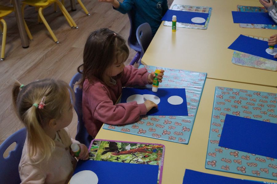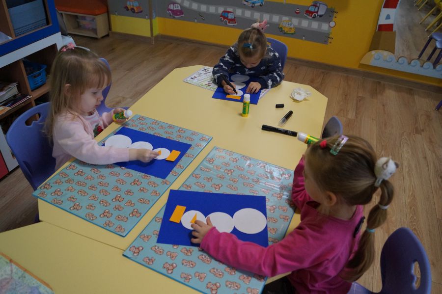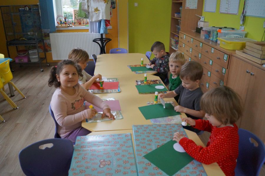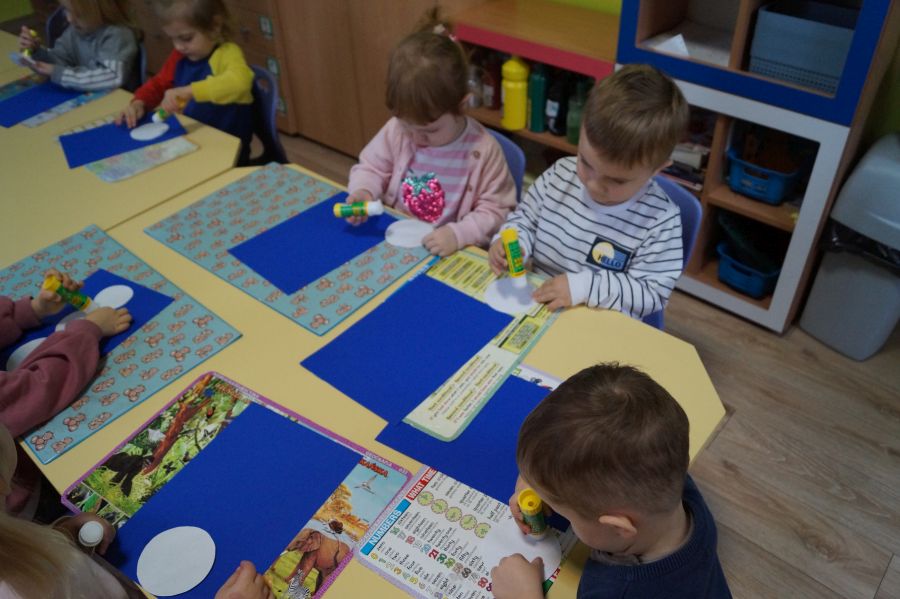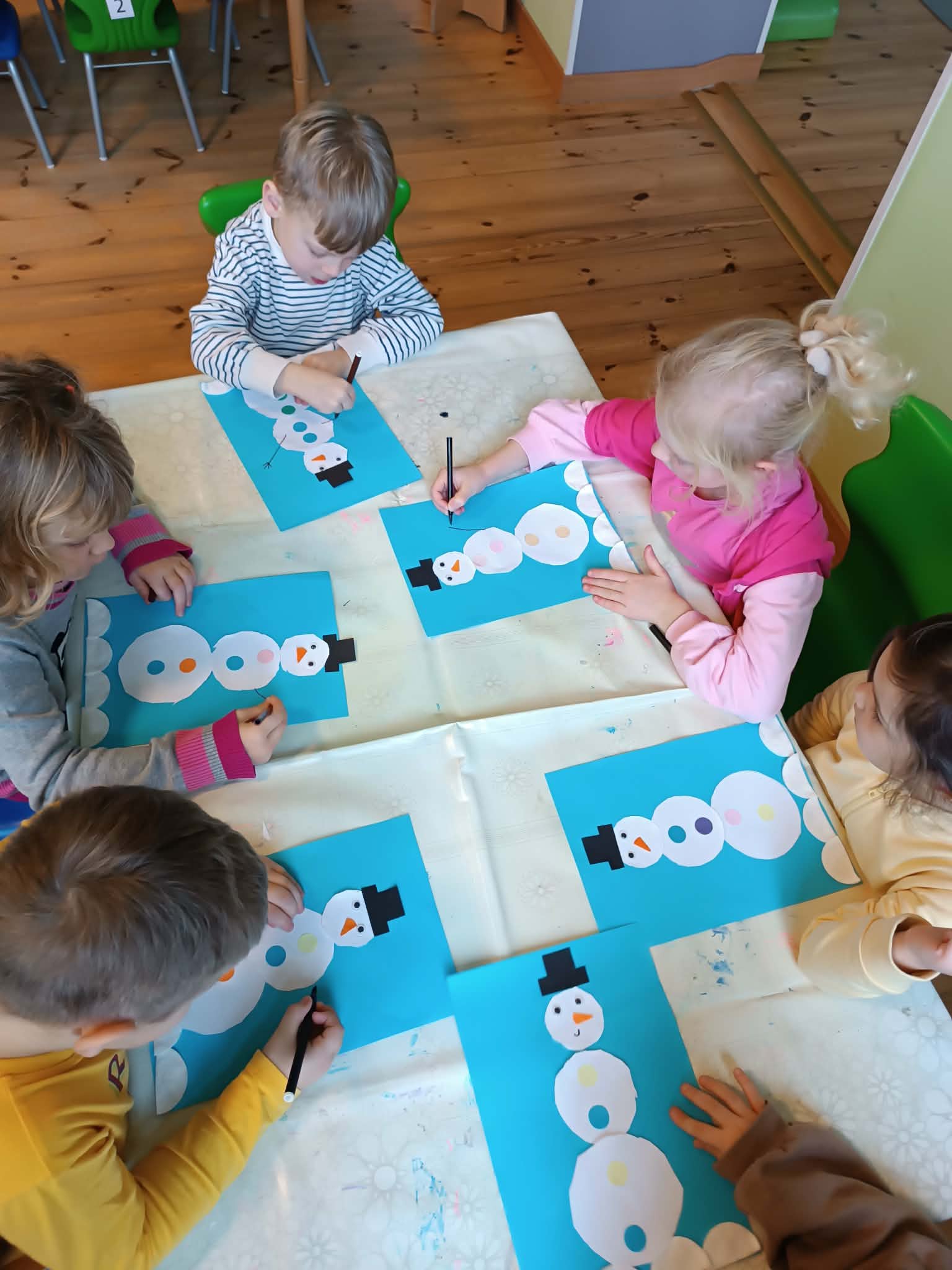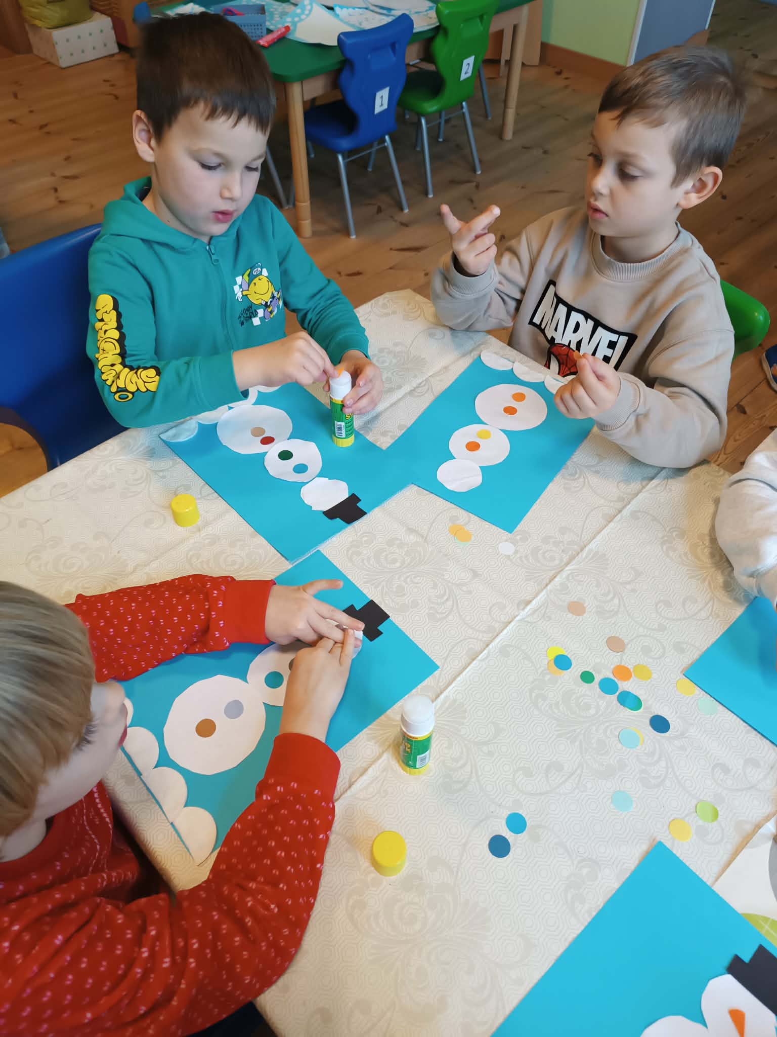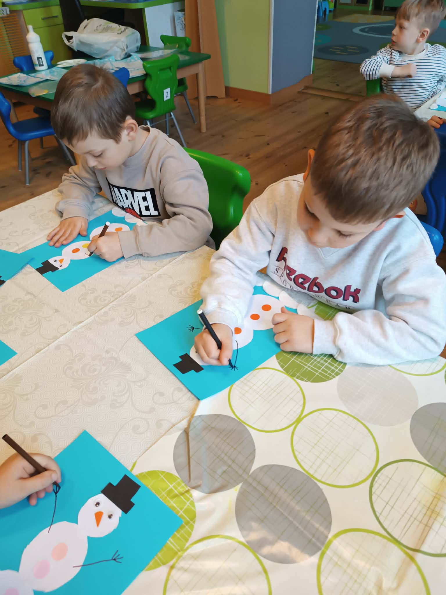 Podczas dzisiejszych zajęć matematyczno- plastycznych – „Bałwanek” dzieci rozwijały swoją kreatywność oraz umiejętności matematyczne, tworząc bałwanki z figur geometrycznych. Każde dziecko otrzymało kartkę kolorowego papieru oraz zestaw papierowych figur, z których – według własnego pomysłu – komponowało swojego bałwanka. Przedszkolaki doklejały koła, trójkąty i prostokąty, a następnie dorysowywały detale: oczy, guziki, uśmiechy. Niektóre dzieci ozdabiały swoje prace dodatkowymi elementami, takimi jak miotła. Gotowe prace zostały wyeksponowane na przedszkolnym korytarzu, gdzie każdy może podziwiać zimową galerię pełną pomysłowości i radości.