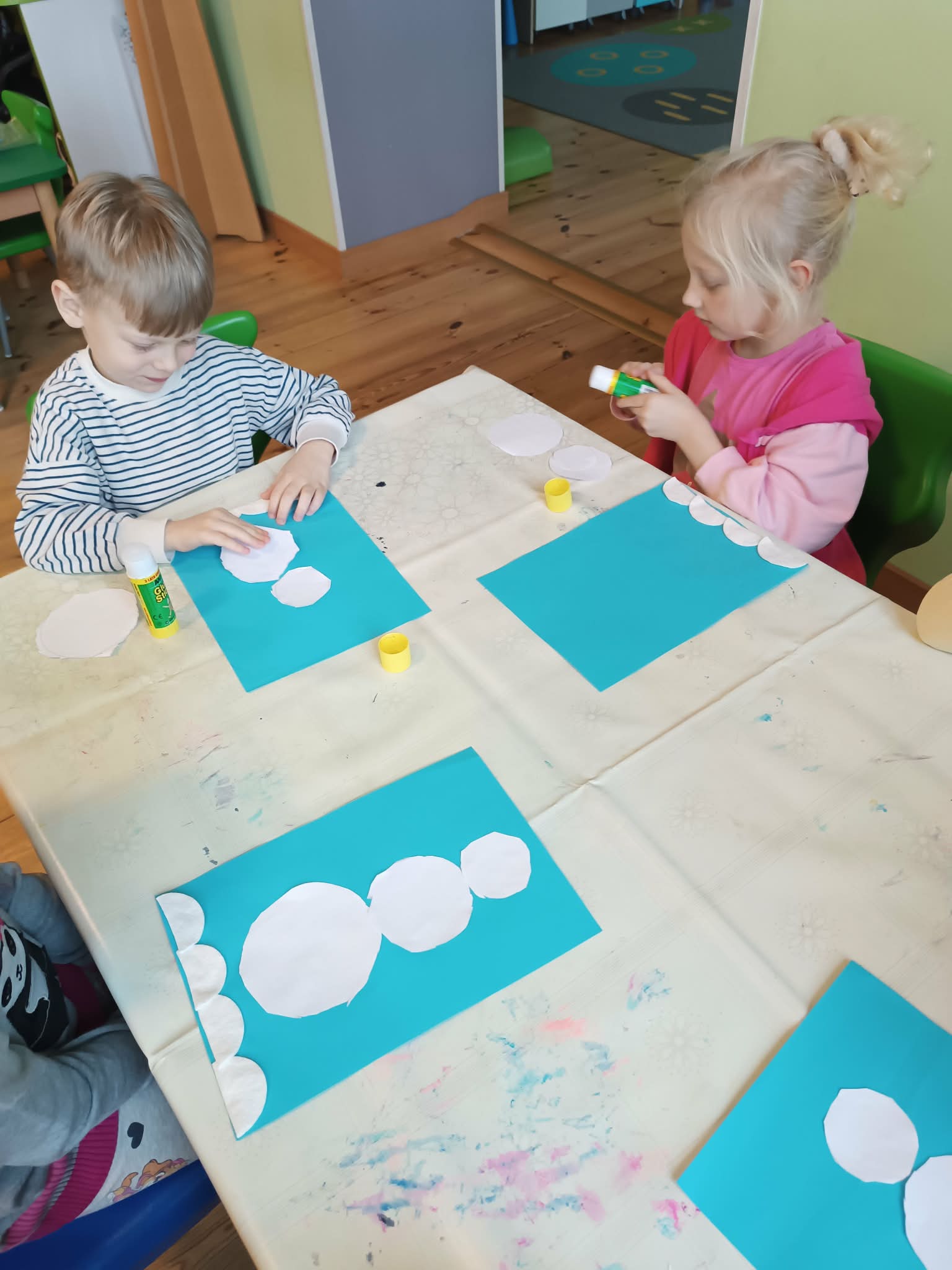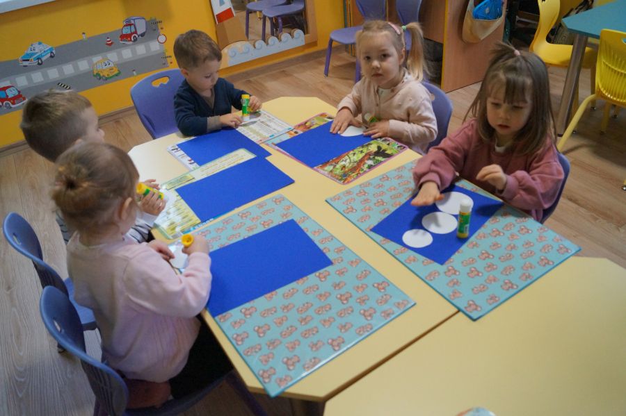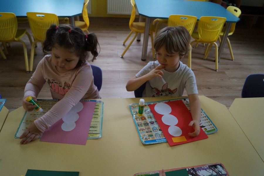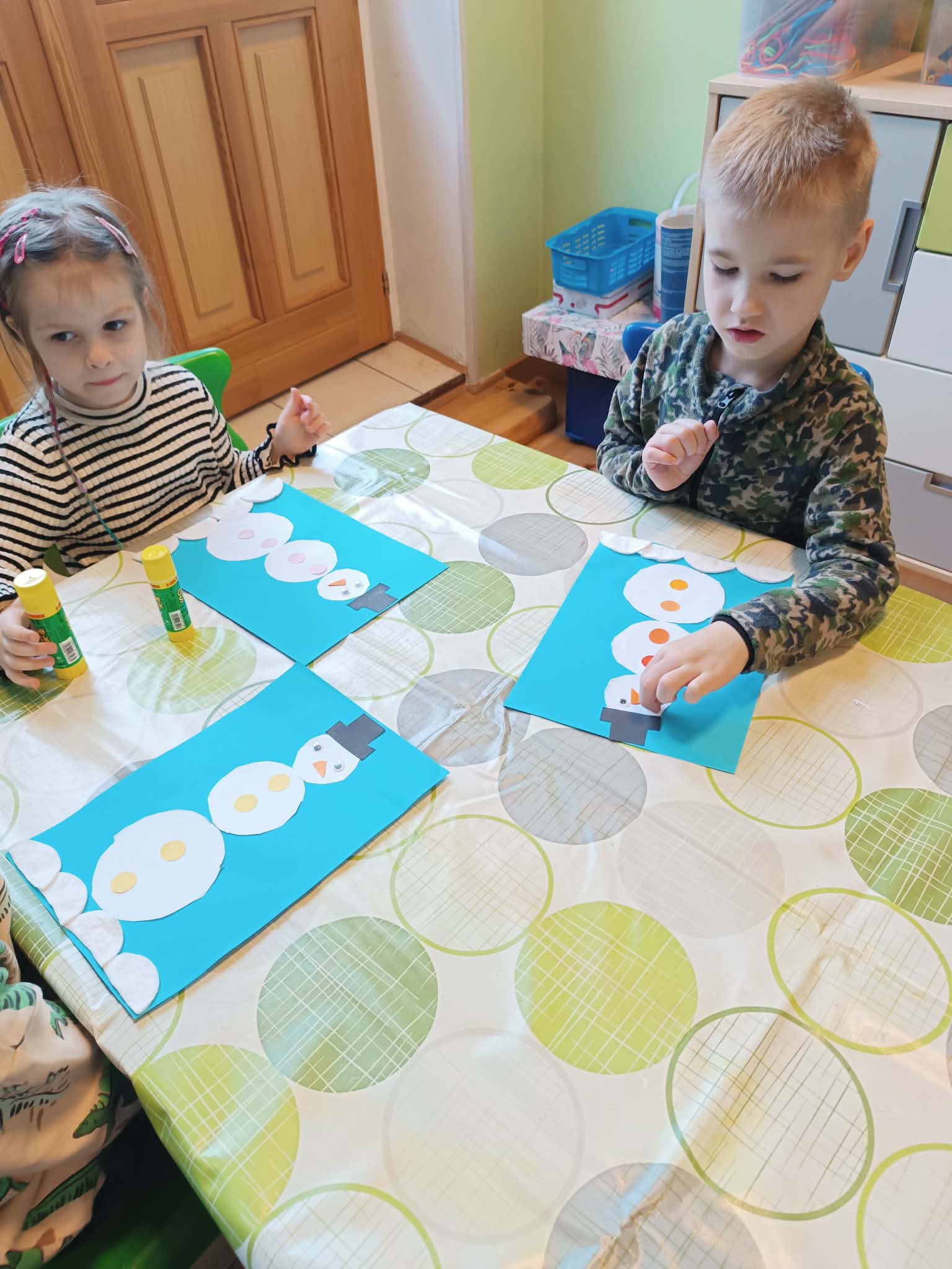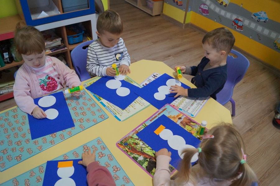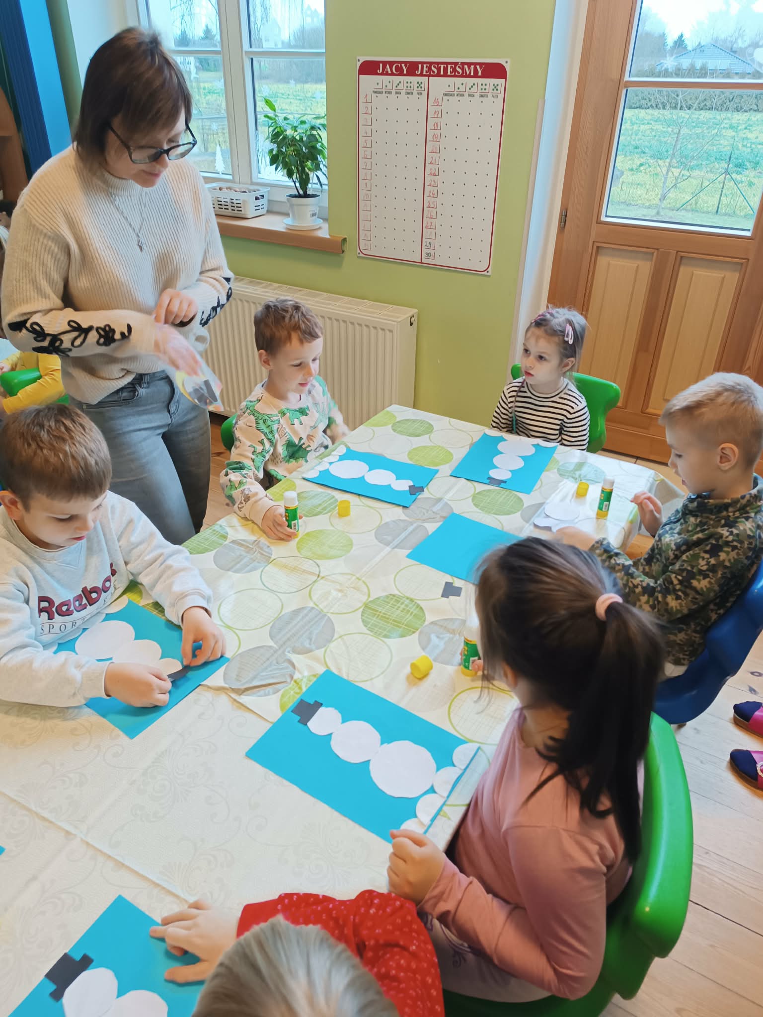 Podczas dzisiejszych zajęć matematyczno- plastycznych – „Bałwanek” dzieci rozwijały swoją kreatywność oraz umiejętności matematyczne, tworząc bałwanki z figur geometrycznych. Każde dziecko otrzymało kartkę kolorowego papieru oraz zestaw papierowych figur, z których – według własnego pomysłu – komponowało swojego bałwanka. Przedszkolaki doklejały koła, trójkąty i prostokąty, a następnie dorysowywały detale: oczy, guziki, uśmiechy. Niektóre dzieci ozdabiały swoje prace dodatkowymi elementami, takimi jak miotła. Gotowe prace zostały wyeksponowane na przedszkolnym korytarzu, gdzie każdy może podziwiać zimową galerię pełną pomysłowości i radości.