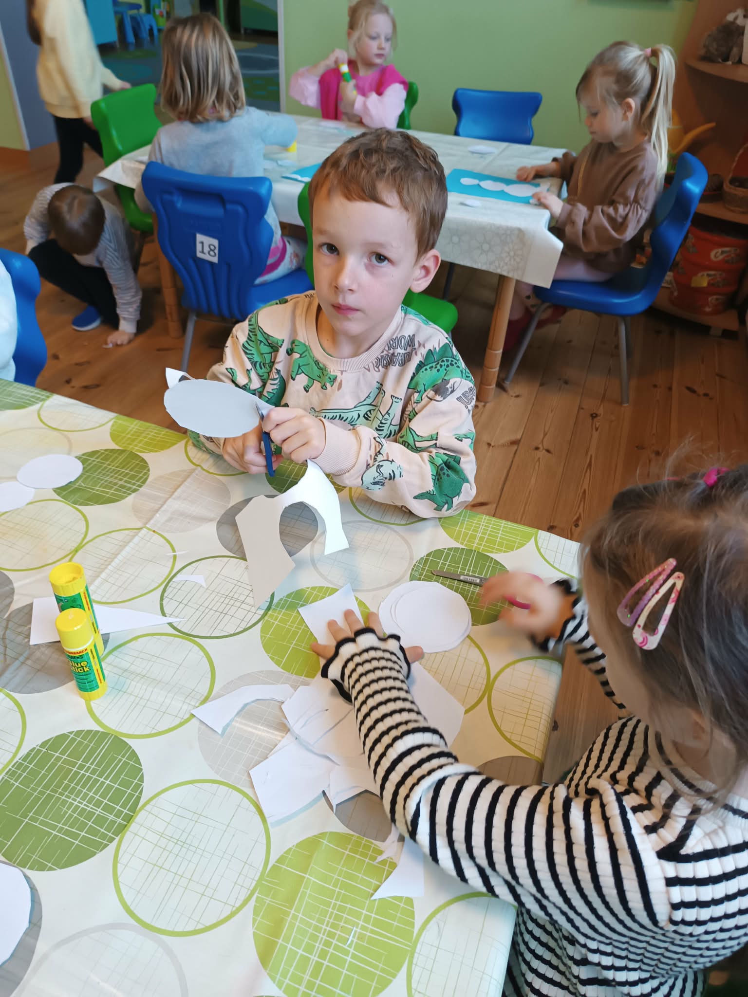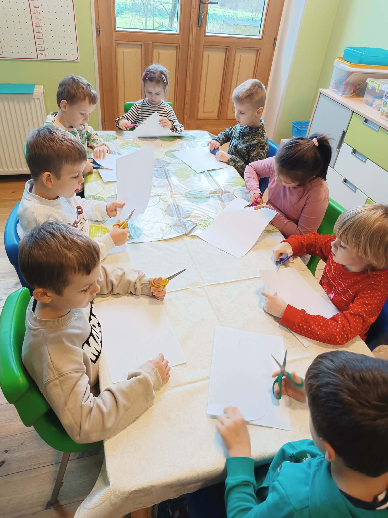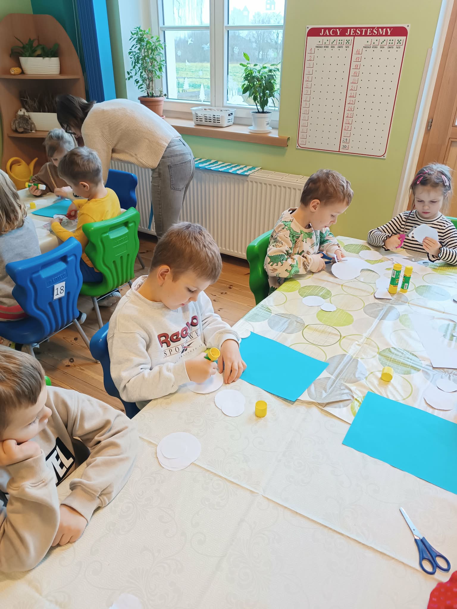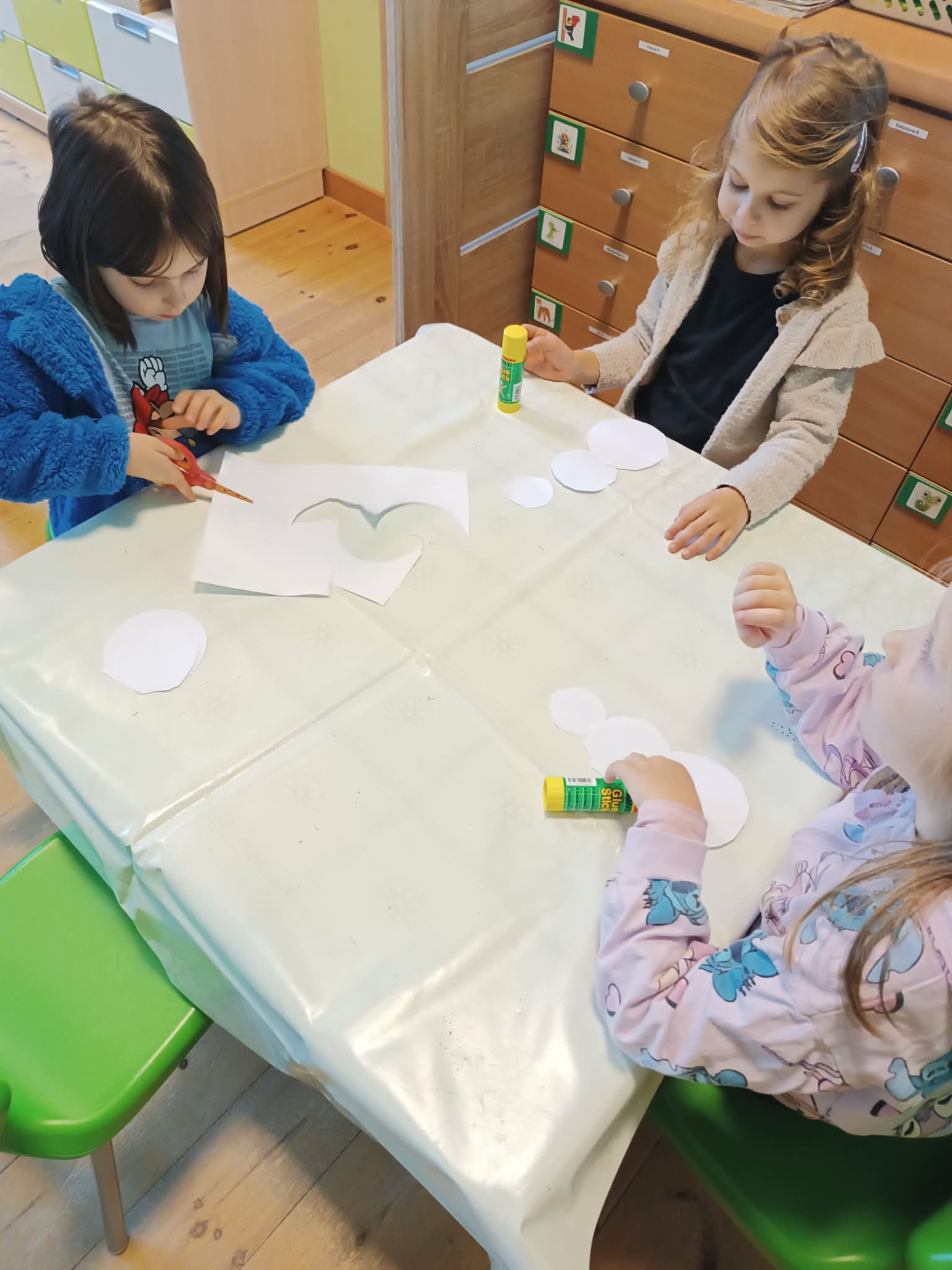 Podczas dzisiejszych zajęć matematyczno- plastycznych – „Bałwanek” dzieci rozwijały swoją kreatywność oraz umiejętności matematyczne, tworząc bałwanki z figur geometrycznych. Każde dziecko otrzymało kartkę kolorowego papieru oraz zestaw papierowych figur, z których – według własnego pomysłu – komponowało swojego bałwanka. Przedszkolaki doklejały koła, trójkąty i prostokąty, a następnie dorysowywały detale: oczy, guziki, uśmiechy. Niektóre dzieci ozdabiały swoje prace dodatkowymi elementami, takimi jak miotła. Gotowe prace zostały wyeksponowane na przedszkolnym korytarzu, gdzie każdy może podziwiać zimową galerię pełną pomysłowości i radości.