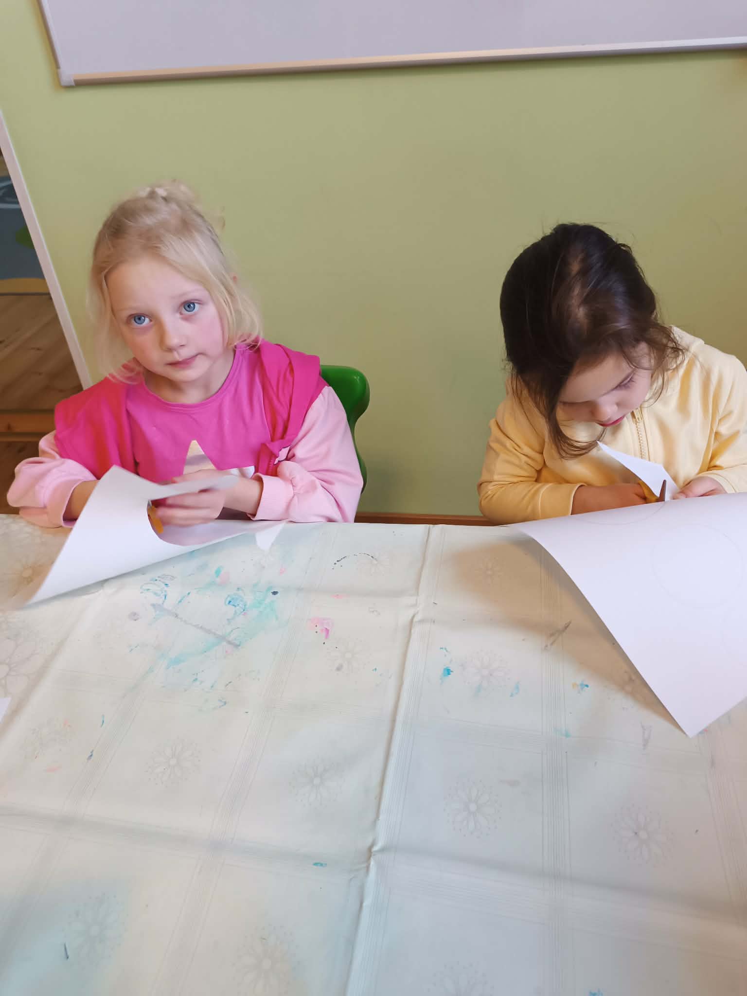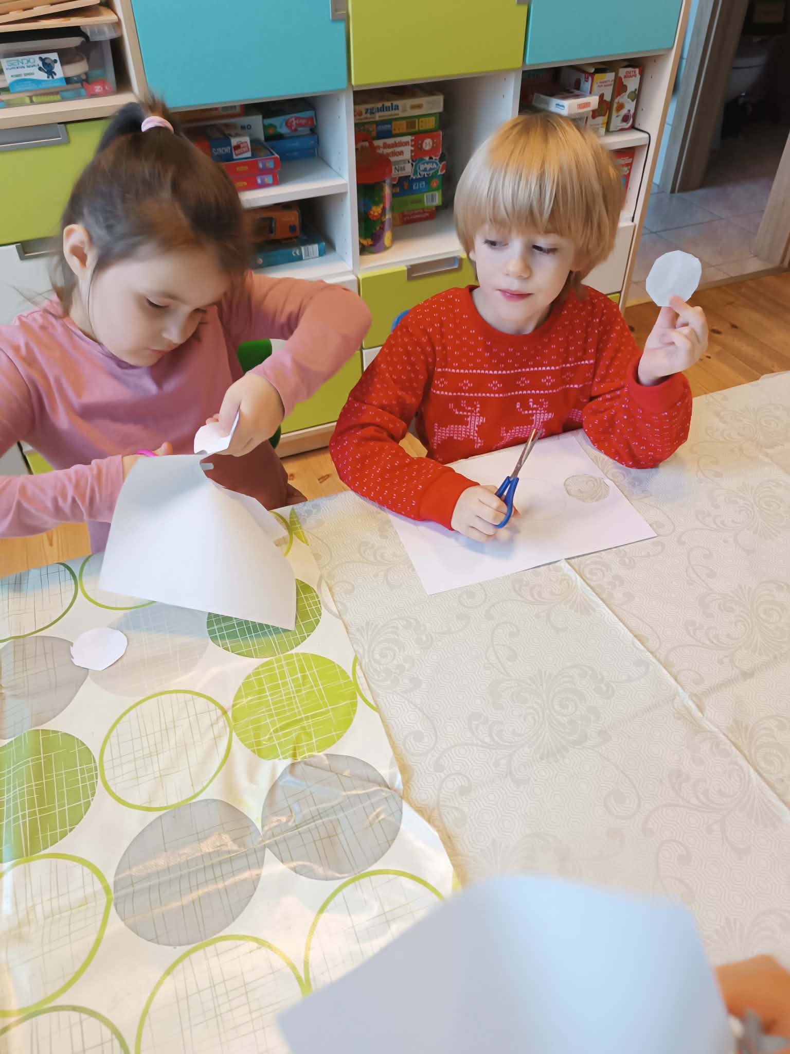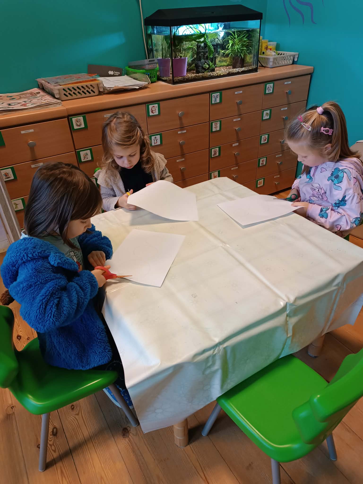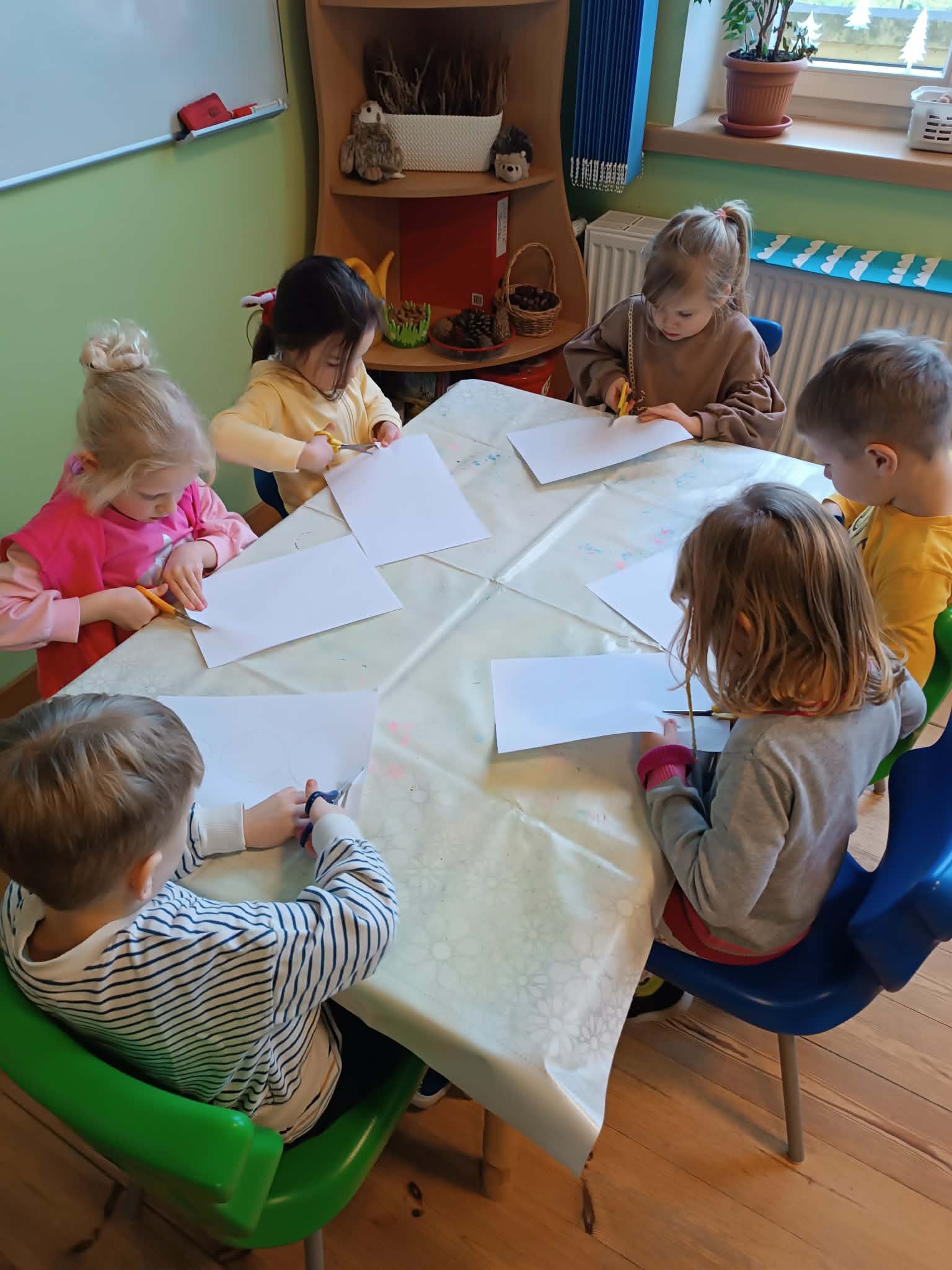Podczas dzisiejszych zajęć matematyczno- plastycznych – „Bałwanek” dzieci rozwijały swoją kreatywność oraz umiejętności matematyczne, tworząc bałwanki z figur geometrycznych. Każde dziecko otrzymało kartkę kolorowego papieru oraz zestaw papierowych figur, z których – według własnego pomysłu – komponowało swojego bałwanka. Przedszkolaki doklejały koła, trójkąty i prostokąty, a następnie dorysowywały detale: oczy, guziki, uśmiechy. Niektóre dzieci ozdabiały swoje prace dodatkowymi elementami, takimi jak miotła. Gotowe prace zostały wyeksponowane na przedszkolnym korytarzu, gdzie każdy może podziwiać zimową galerię pełną pomysłowości i radości.