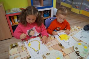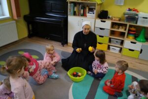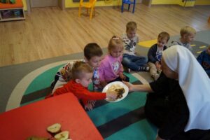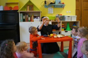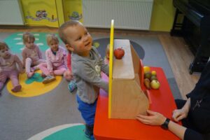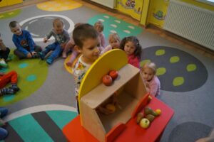 Dzieci młodsze dobrze wiedzą, że owoce są smaczne i zdrowe, znają ich nazwy, smaki, kolory…podczas zajęć miały okazję poznać nowe ciekawostki oraz utrwalić swoją wiedzę. Ćwiczyliśmy również koordynację wzrokowo- ruchową podczas malowania farbami.