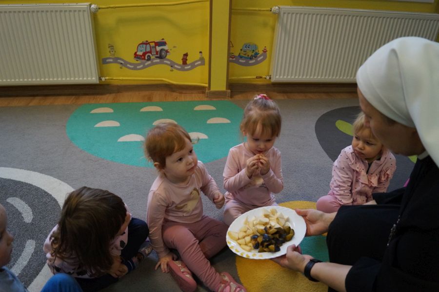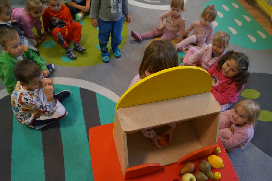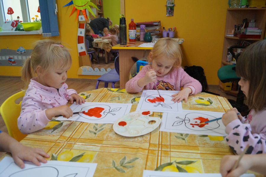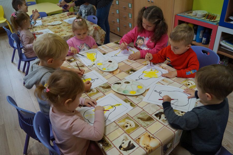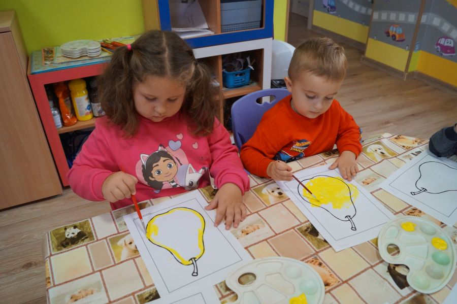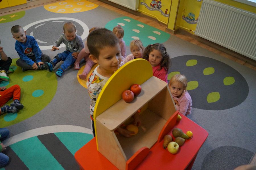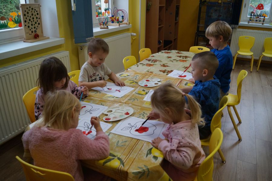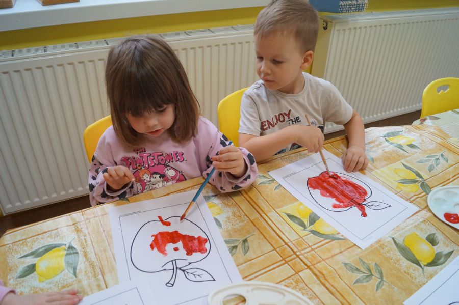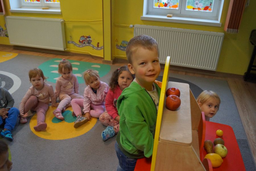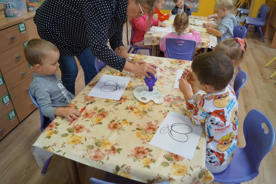 Dzieci młodsze dobrze wiedzą, że owoce są smaczne i zdrowe, znają ich nazwy, smaki, kolory…podczas zajęć miały okazję poznać nowe ciekawostki oraz utrwalić swoją wiedzę. Ćwiczyliśmy również koordynację wzrokowo- ruchową podczas malowania farbami.