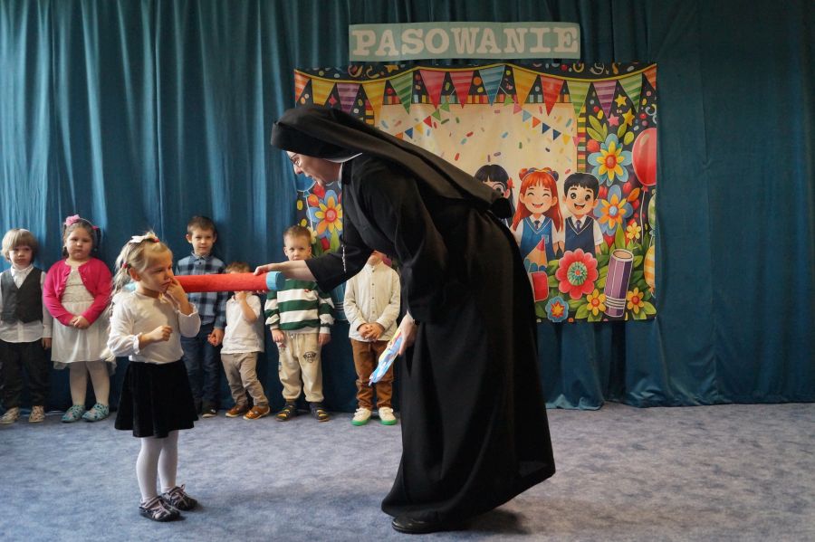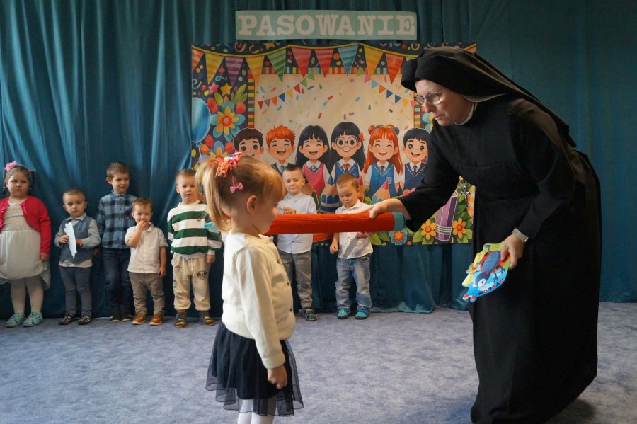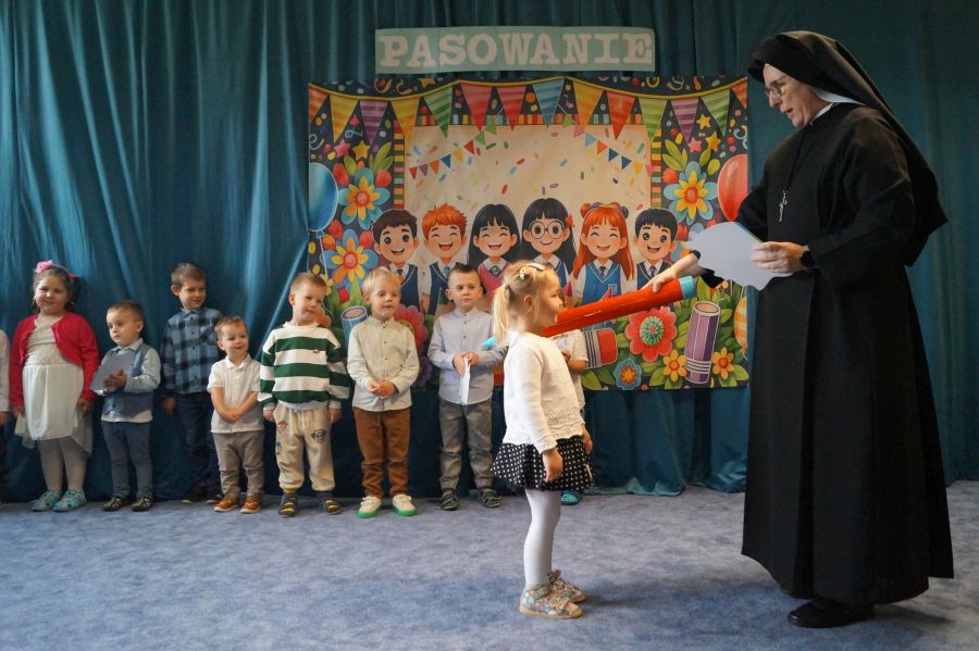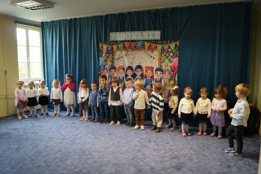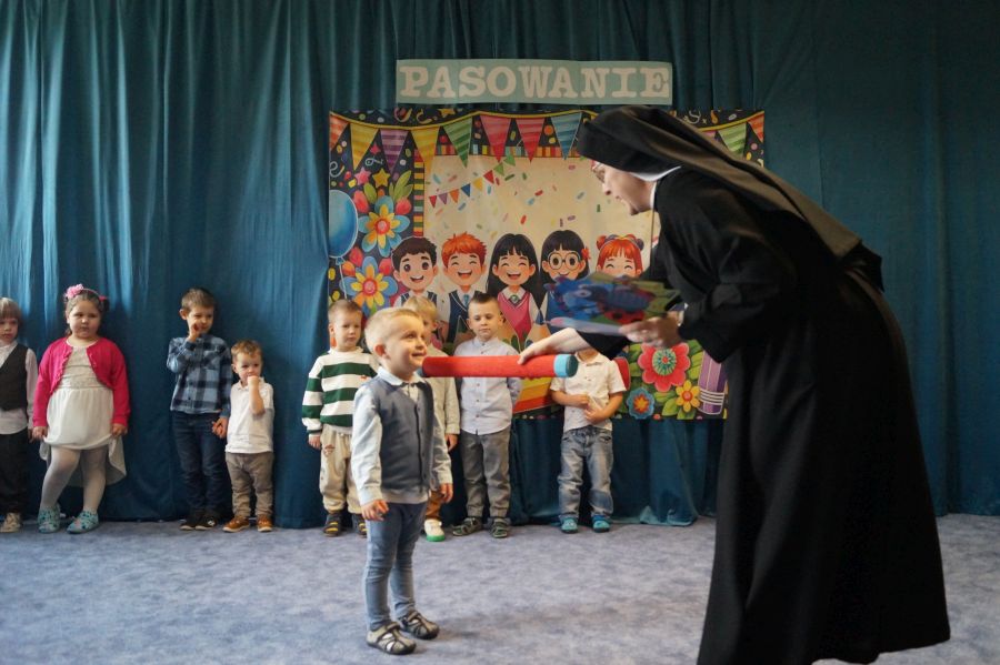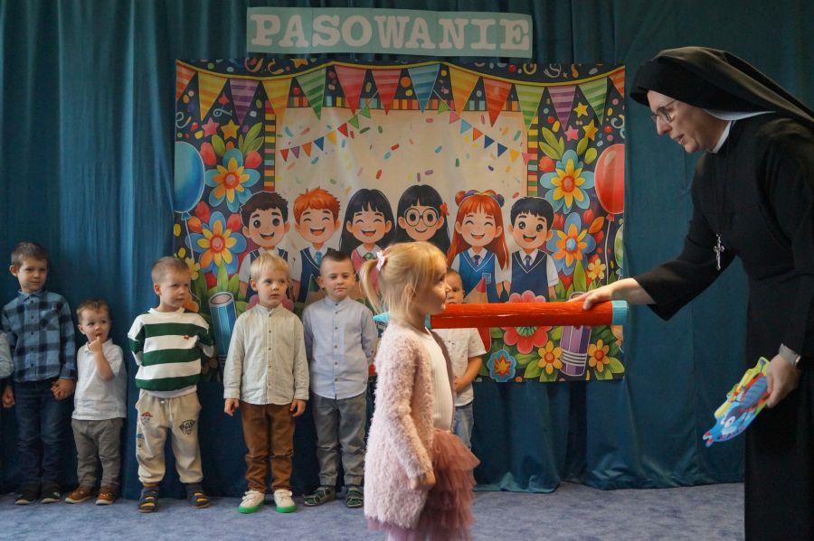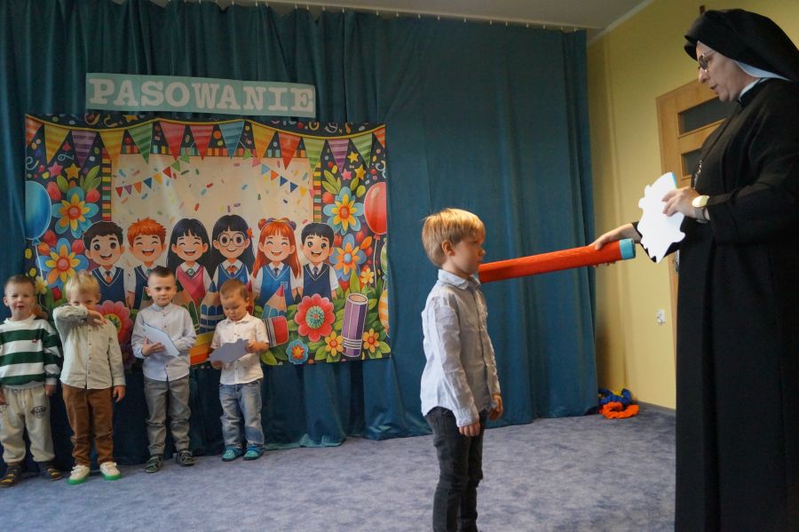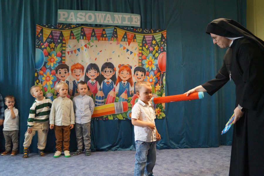 W naszym przedszkolu wielkie święto. Jeden z najważniejszych dni w życiu przedszkolaka czyli pasowanie- oficjalne włączenie dziecka do społeczności przedszkola. Nasze maluchy świetnie się zaprezentowały przed rodzicami, dziadkami i Siostrą Dyrektor, która na zakończenie dokonała uroczystego pasowania.