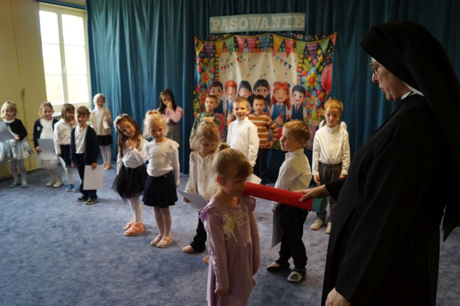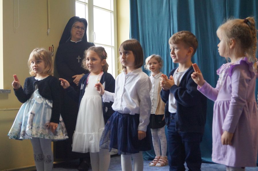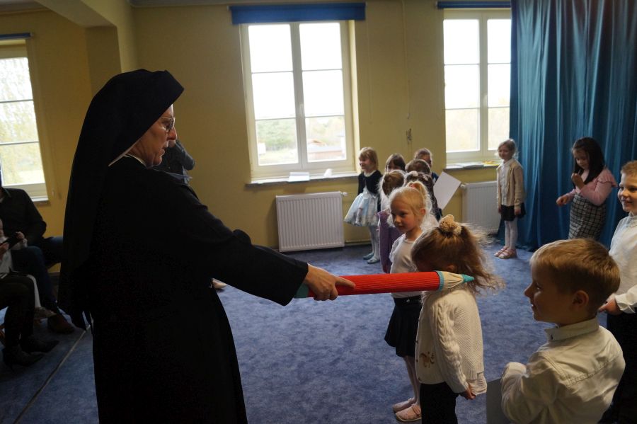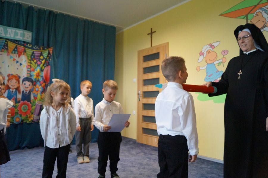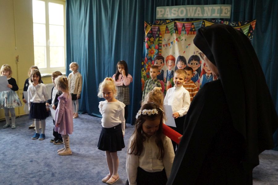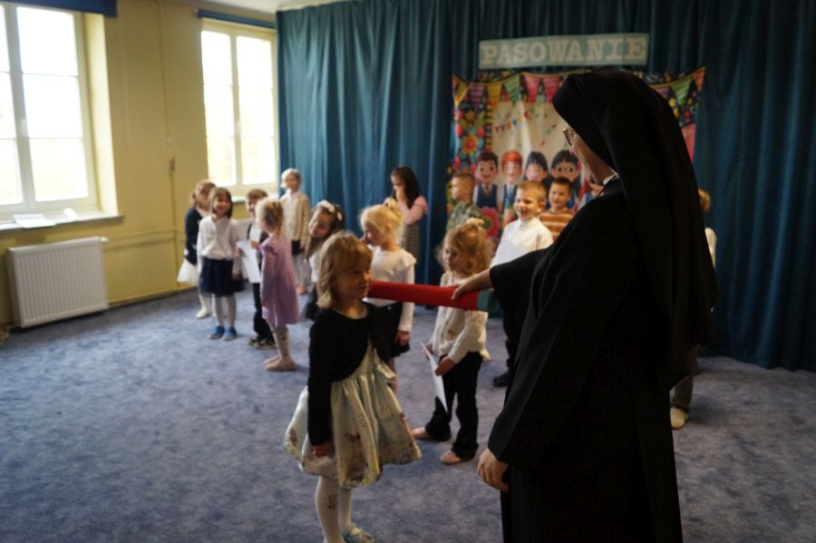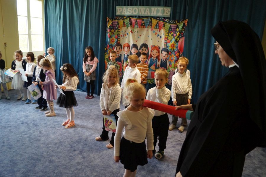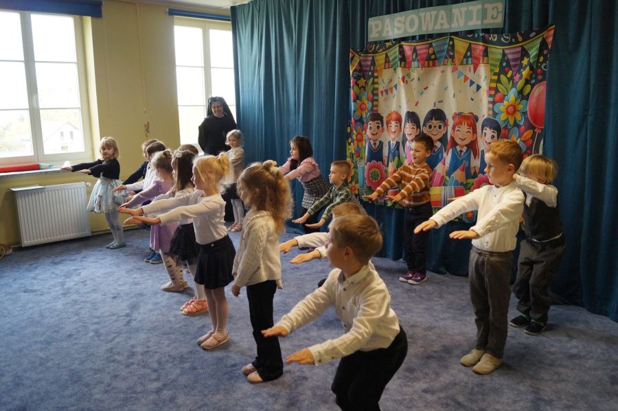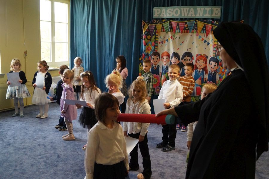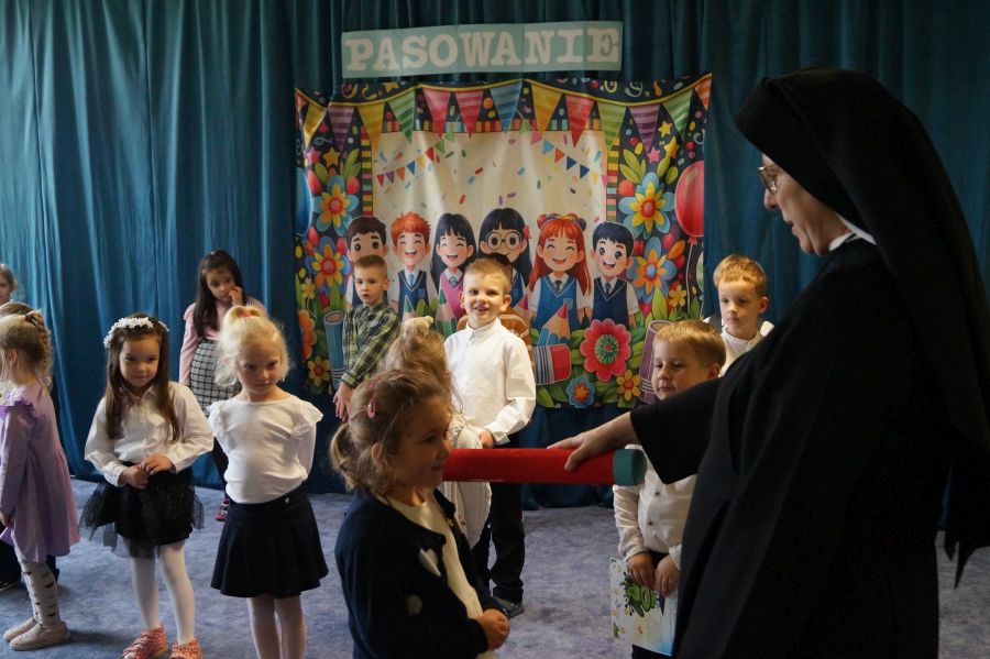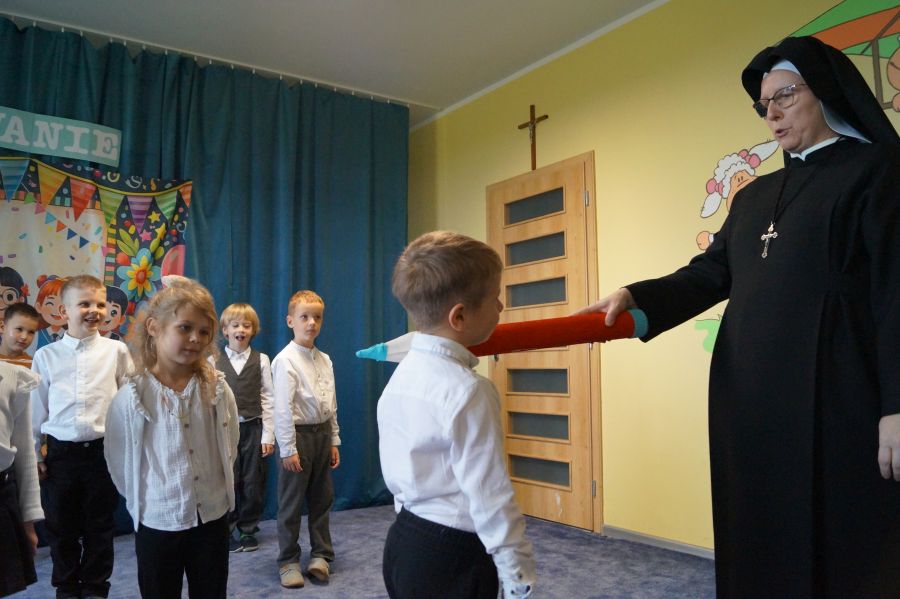 Grupa starsza świętowała dzisiaj pasowanie dzieci na starszaków. Przedszkolacy byli bardzo podekscytowani czekającymi ich zadaniami. Oczywiście dzieci świetnie sobie poradziły i Siostra Dyrektor mogła dokonać aktu pasowania.