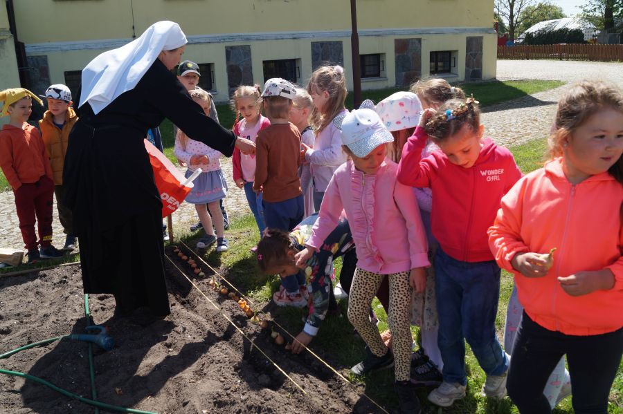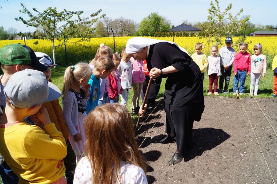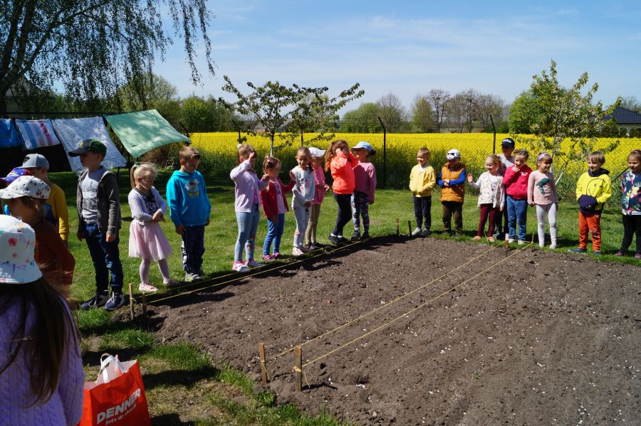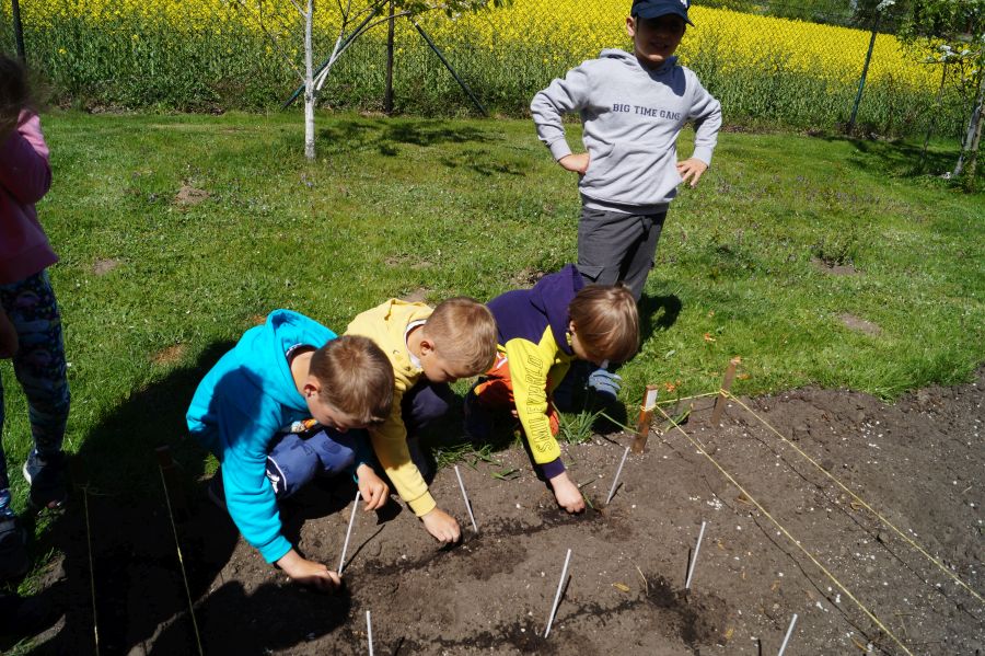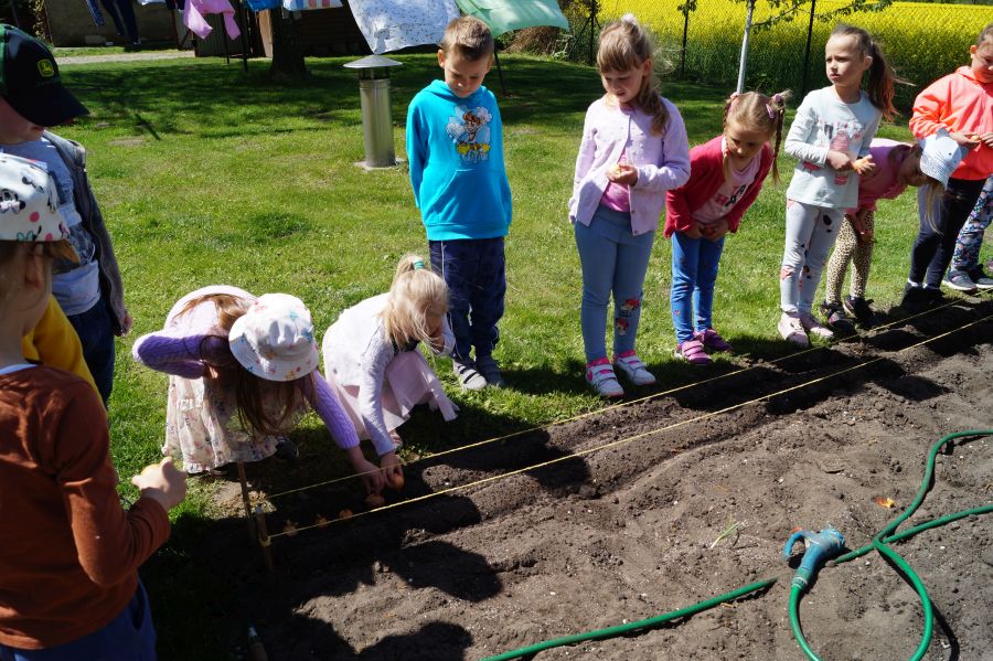 Dzieci z grupy starszej podjęły prace w ogrodzie warzywnym. Najpierw przyswoiły sobie wiedzę na temat uprawy różnych warzyw, a następnie sadziły cebulkę oraz fasolkę szparagową.