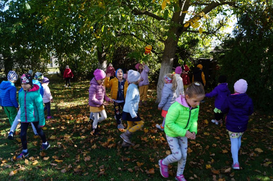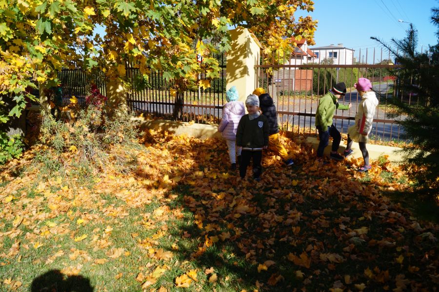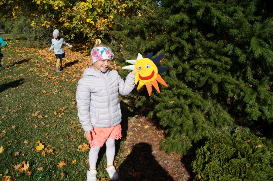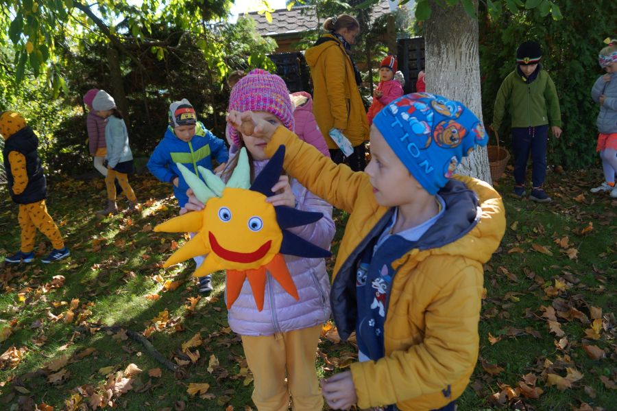 Grupa starsza wyruszyła razem ze słonkiem na poszukiwanie darów jesieni. Dzieci prawie zamieniły się w wiewiórki, tak szybko i sprawnie zbierały orzechy w naszym ogrodzie. Maskotkę słonka uszyła specjalnie dla nas mama Amelki C. z „Bratków”. Pani Aniu bardzo dziękujemy za pomoc i podzielenie się swoim talentem.