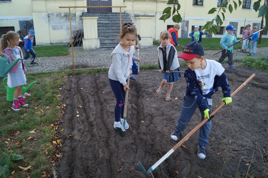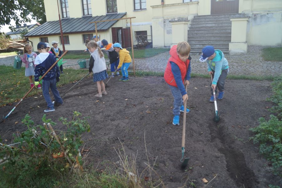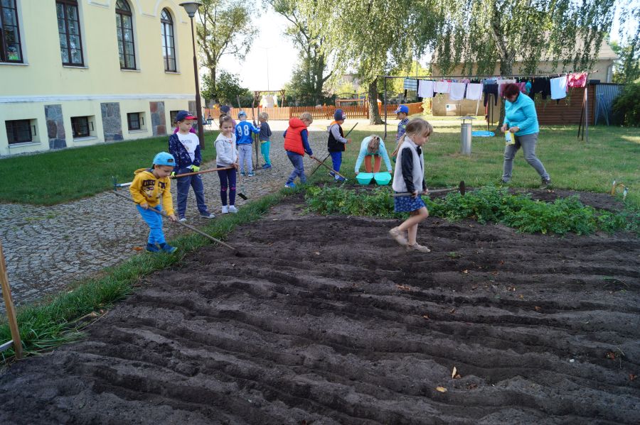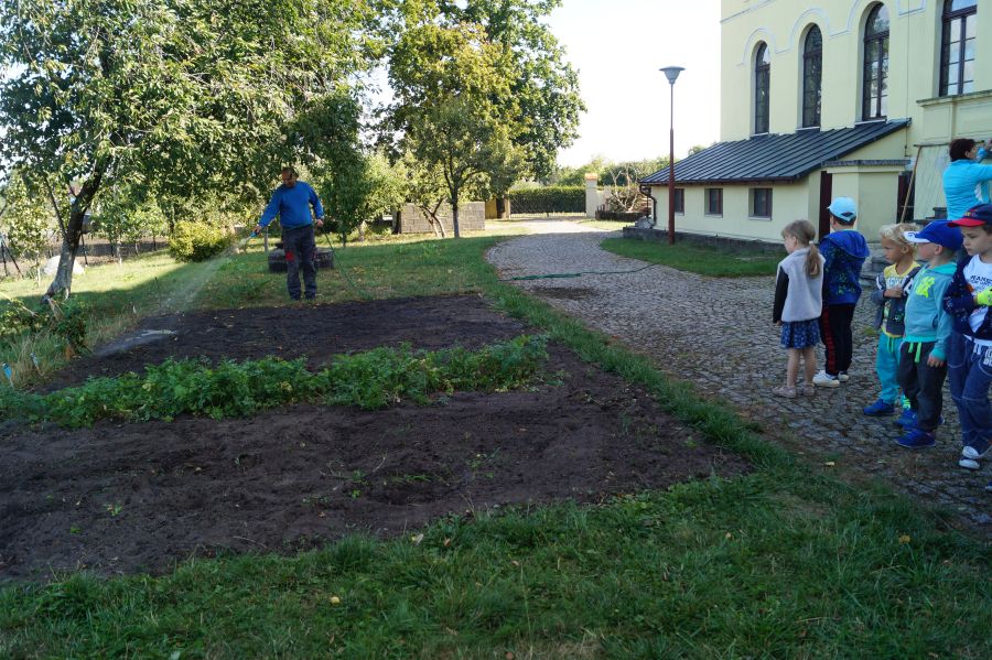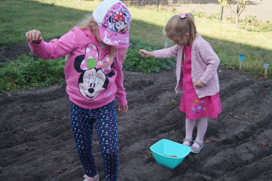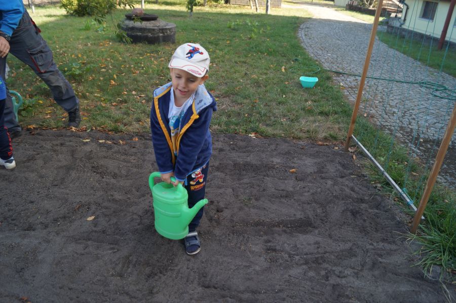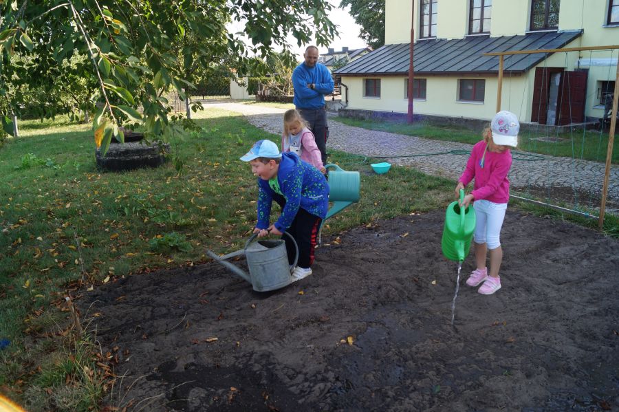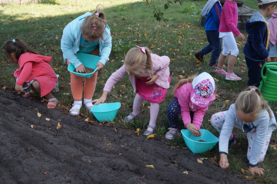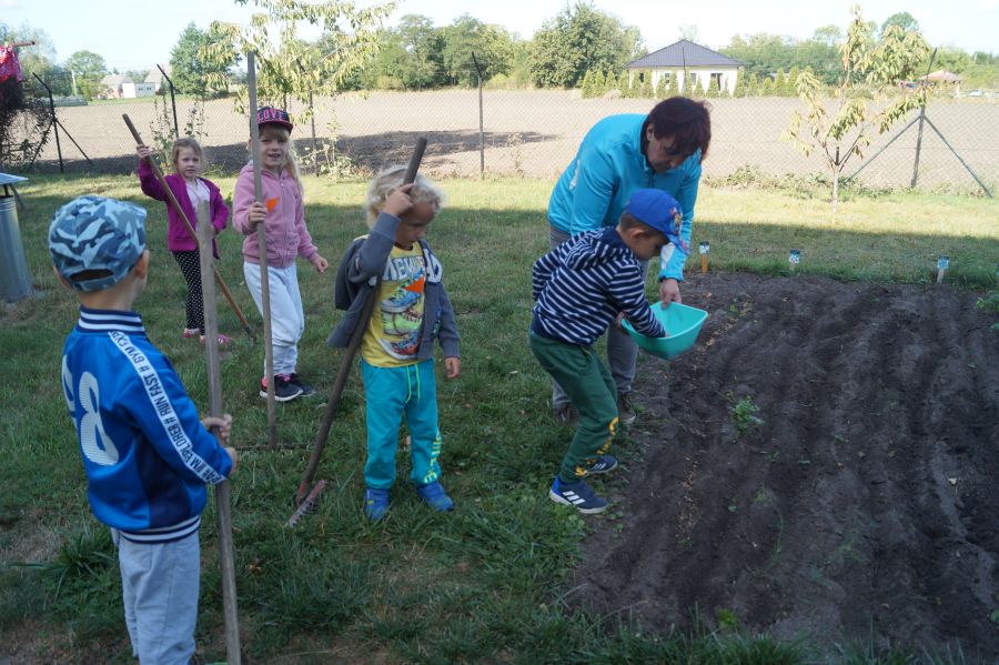 Kolejnym etapem pracy w grupie starszej, według metody projektu było wysianie poplonu, aby naturalnie użyźnić naszą działkę dydaktyczną. Dzieci podzieliły się na cztery grupy, aby każdy mógł wykonać część prac. Wspomógł nas trochę pan Zbyszek oraz pani Lidia. Teraz cierpliwie czekamy, co będzie dalej