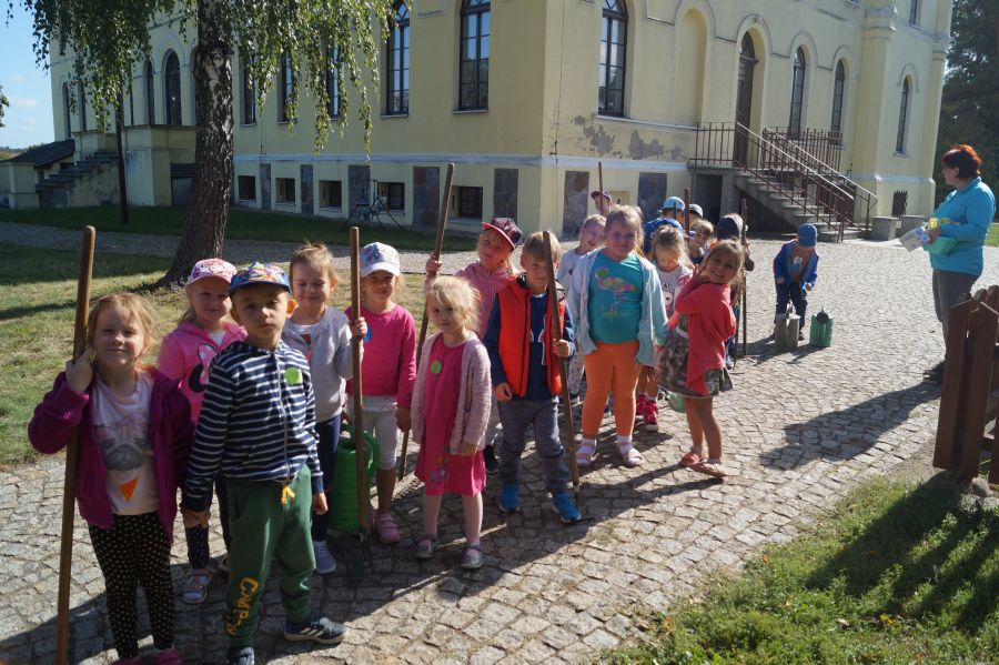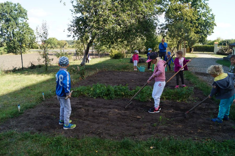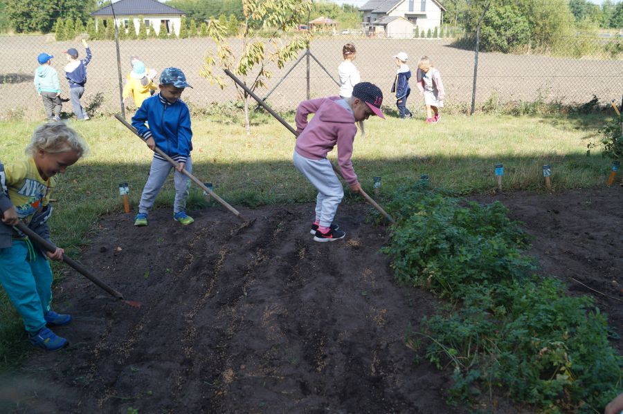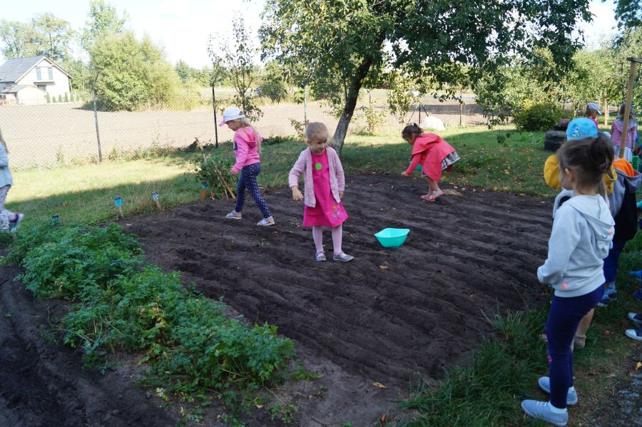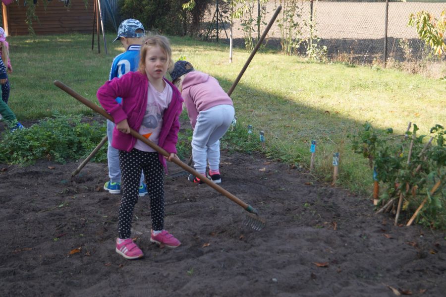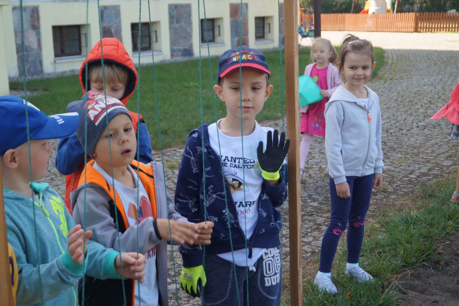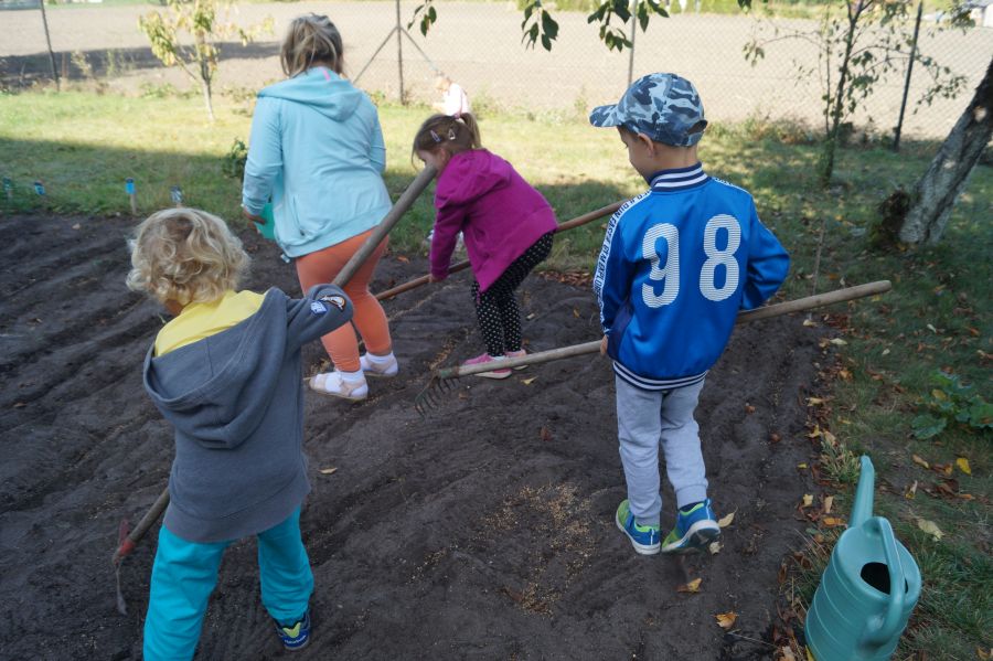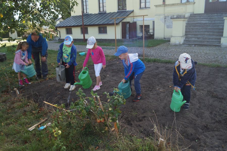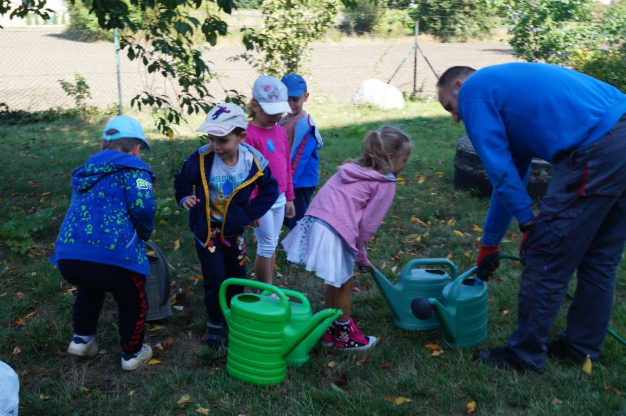 Kolejnym etapem pracy w grupie starszej, według metody projektu było wysianie poplonu, aby naturalnie użyźnić naszą działkę dydaktyczną. Dzieci podzieliły się na cztery grupy, aby każdy mógł wykonać część prac. Wspomógł nas trochę pan Zbyszek oraz pani Lidia. Teraz cierpliwie czekamy, co będzie dalej