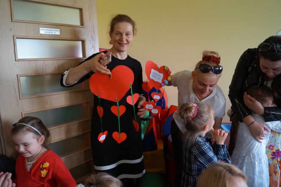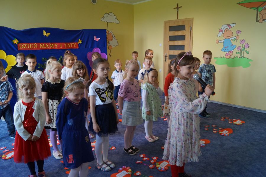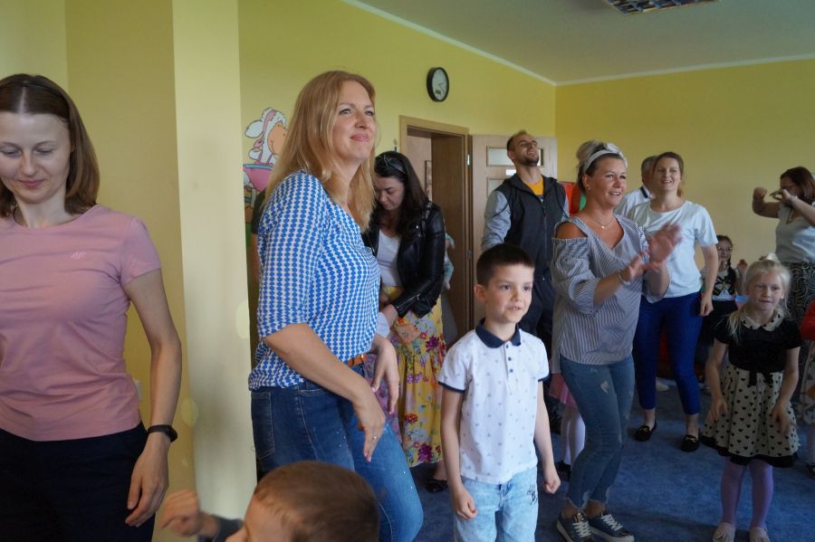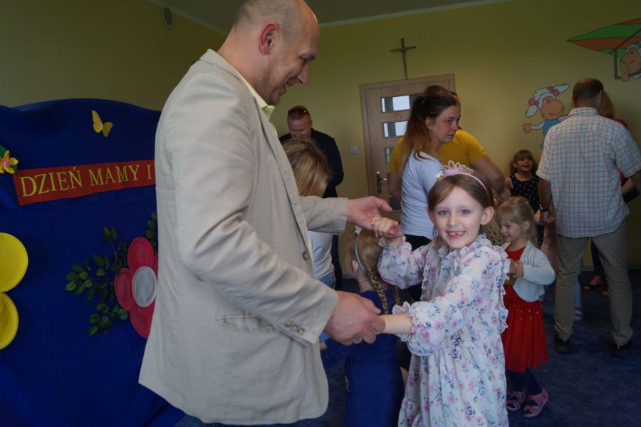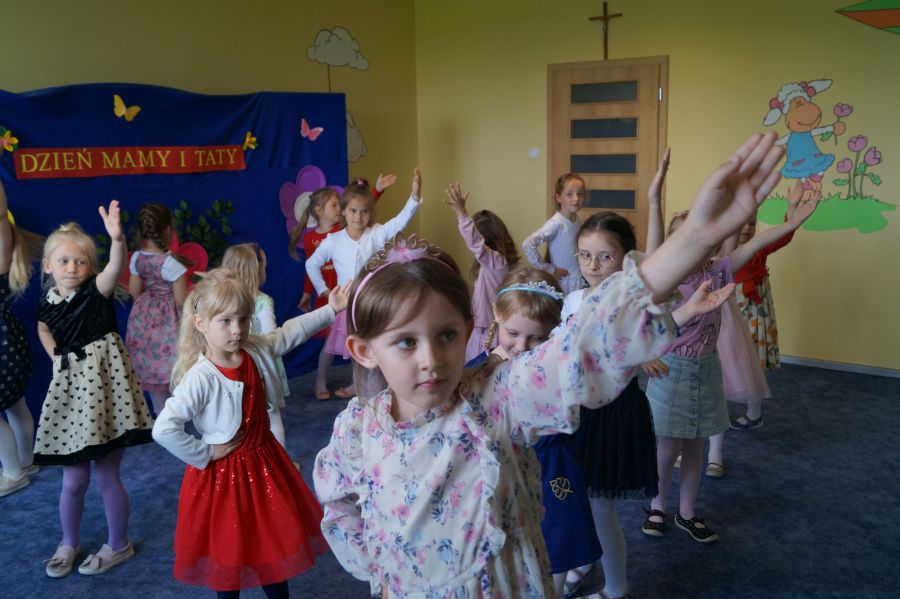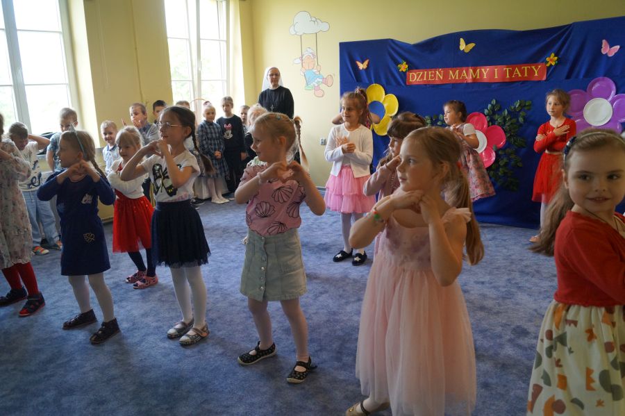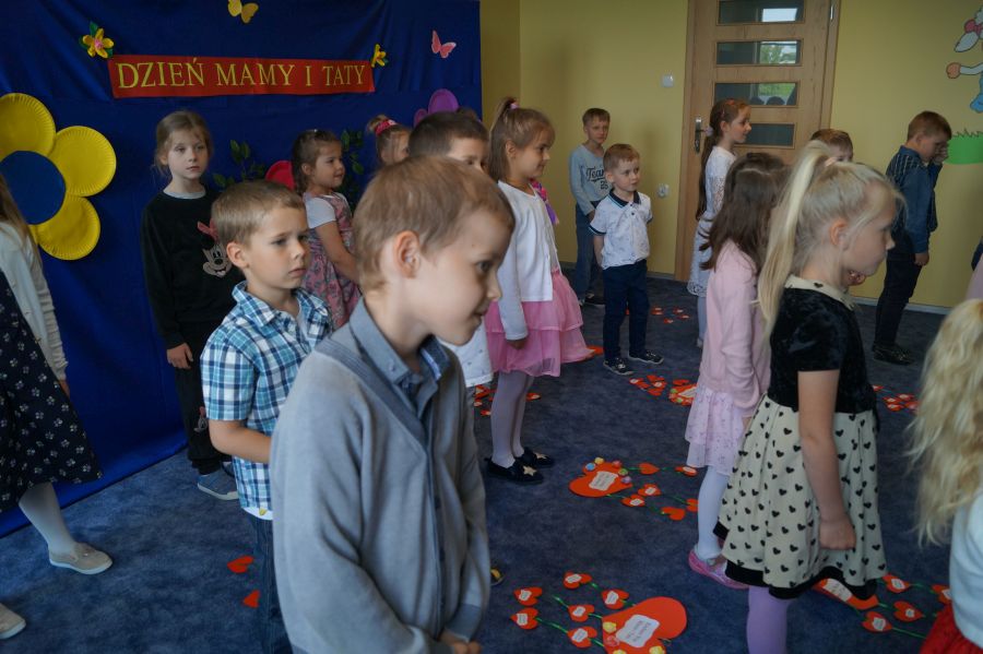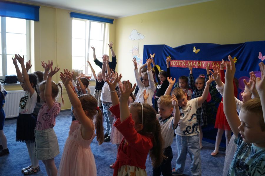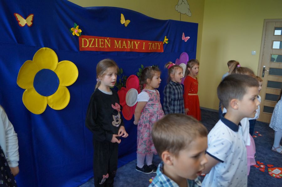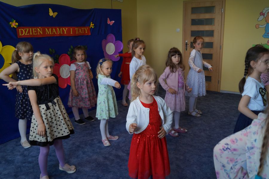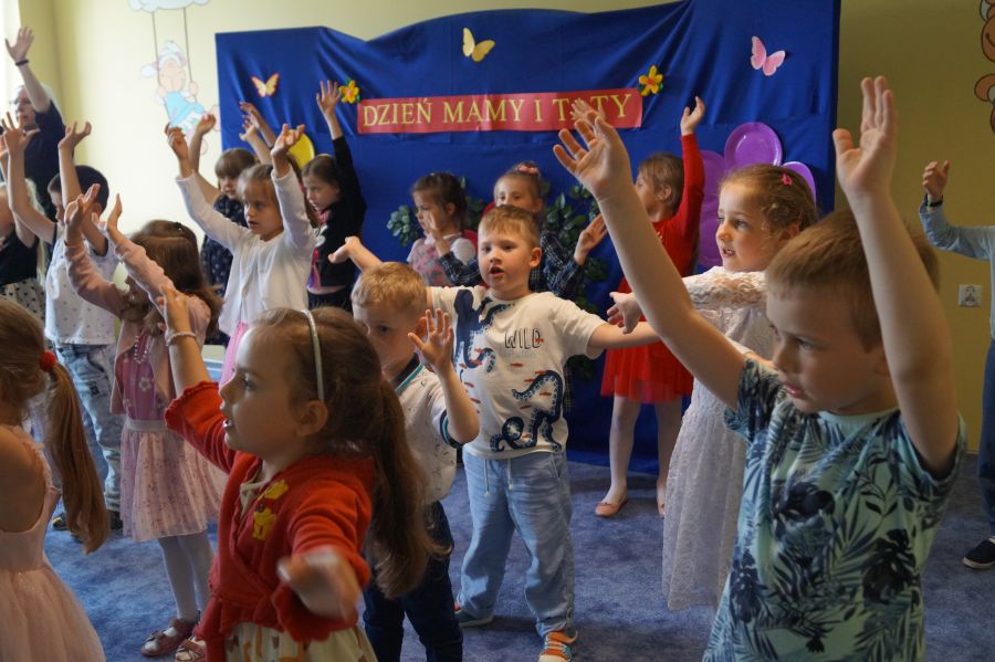 Dzisiaj nasi starszacy zaprosili swoich rodziców na krótkie przedstawienie i zabawy taneczne z okazji zbliżających się świąt Mamy i Taty.