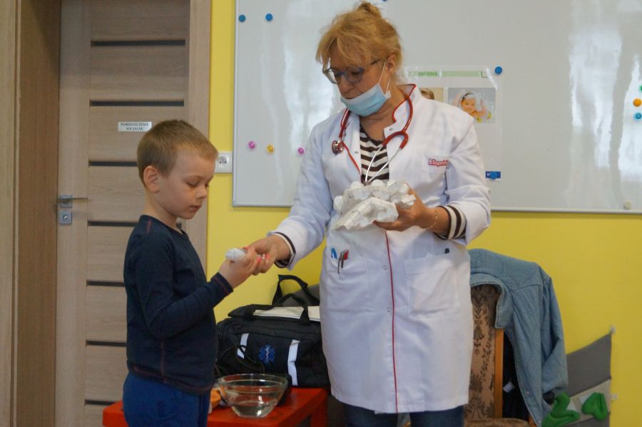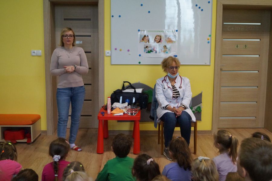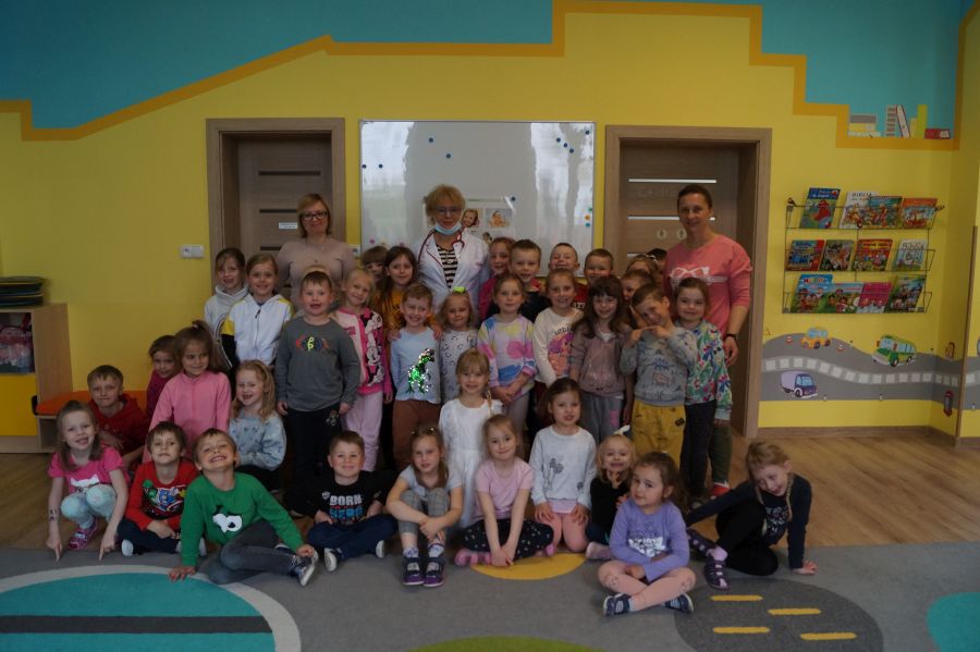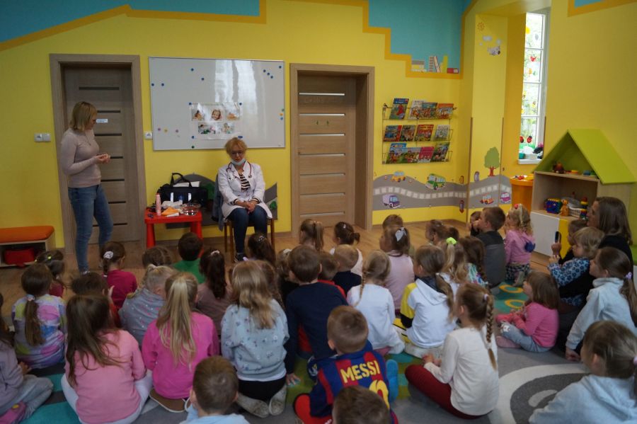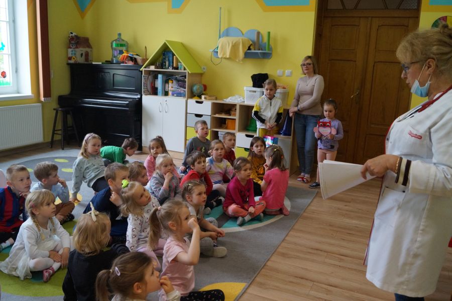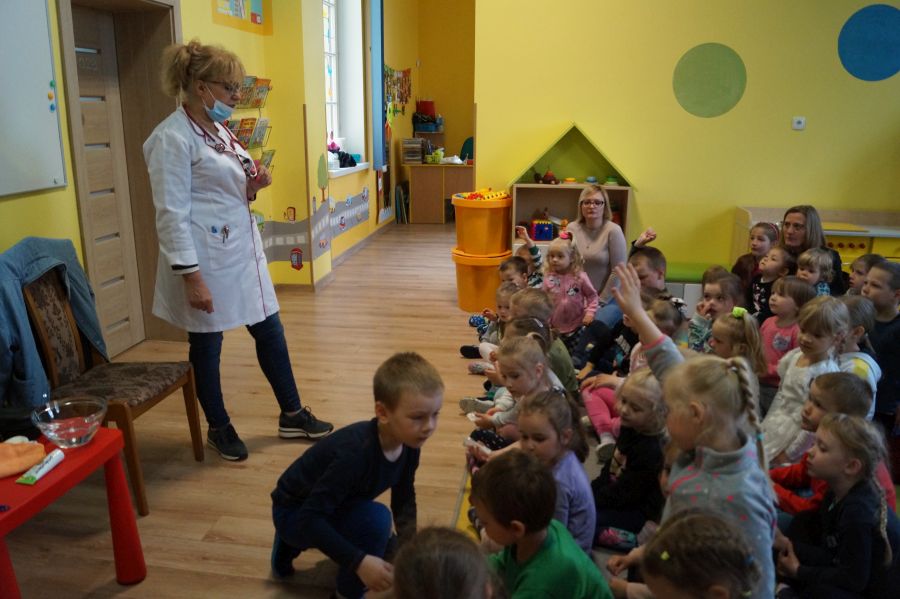 Goście, goście…dzisiaj w przedszkolu spotkanie z panią pielęgniarką, z Gminnej Przychodni w Osielsku. Pani Jolanta, opowiedziała dzieciom, w jaki sposób należy dbać o higienę osobistą ciała.