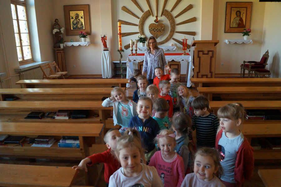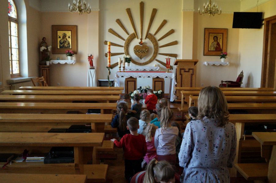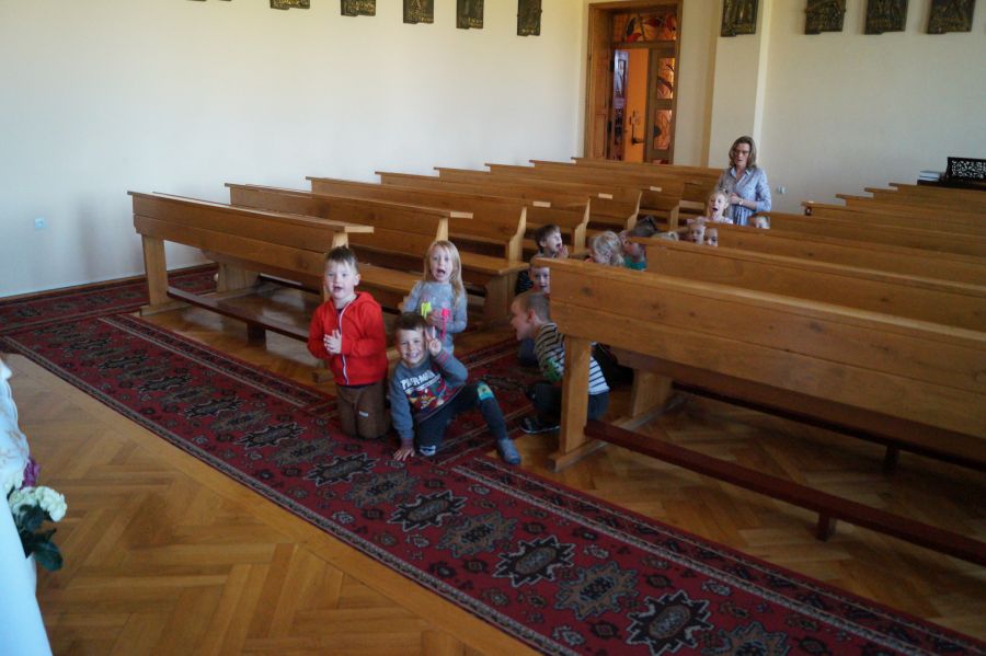 Nasze dzieci codziennie odwiedzają w kaplicy Pana Jezusa ukrytego w Najświętszym Sakramencie. Najczęściej zanoszą do Niego swoje prośby, ale często też dziękują, śpiewają piosenki i oczywiście wzywają opieki Aniołów Stróżów. Na zdjęciach jest grupa młodsza, ale starszacy oczywiście też modlą się w kaplicy zaraz po pierwszym śniadaniu.