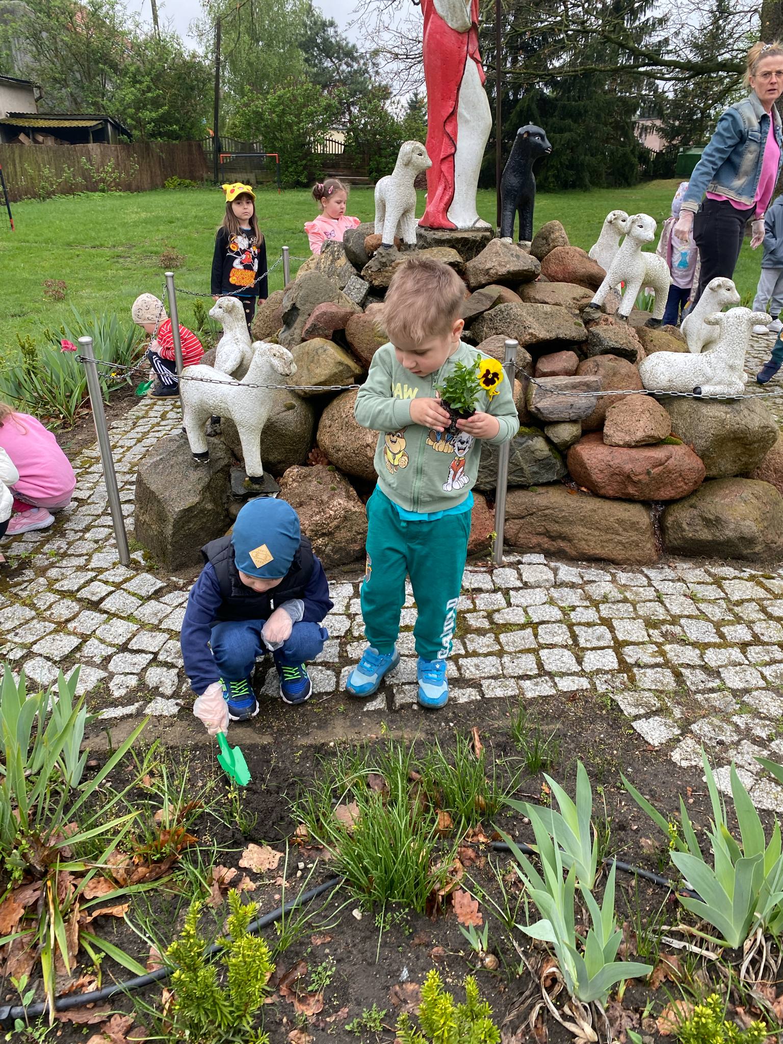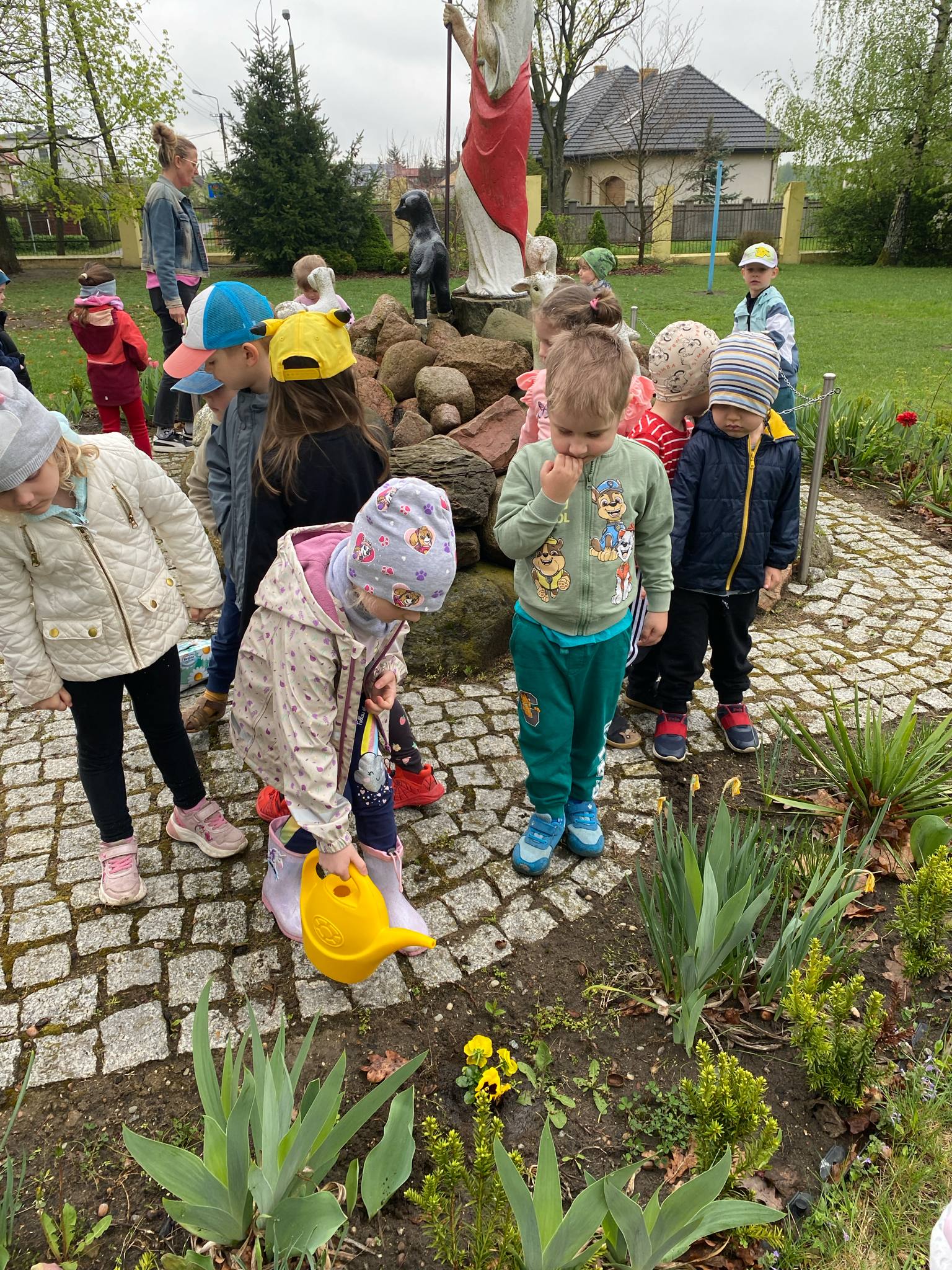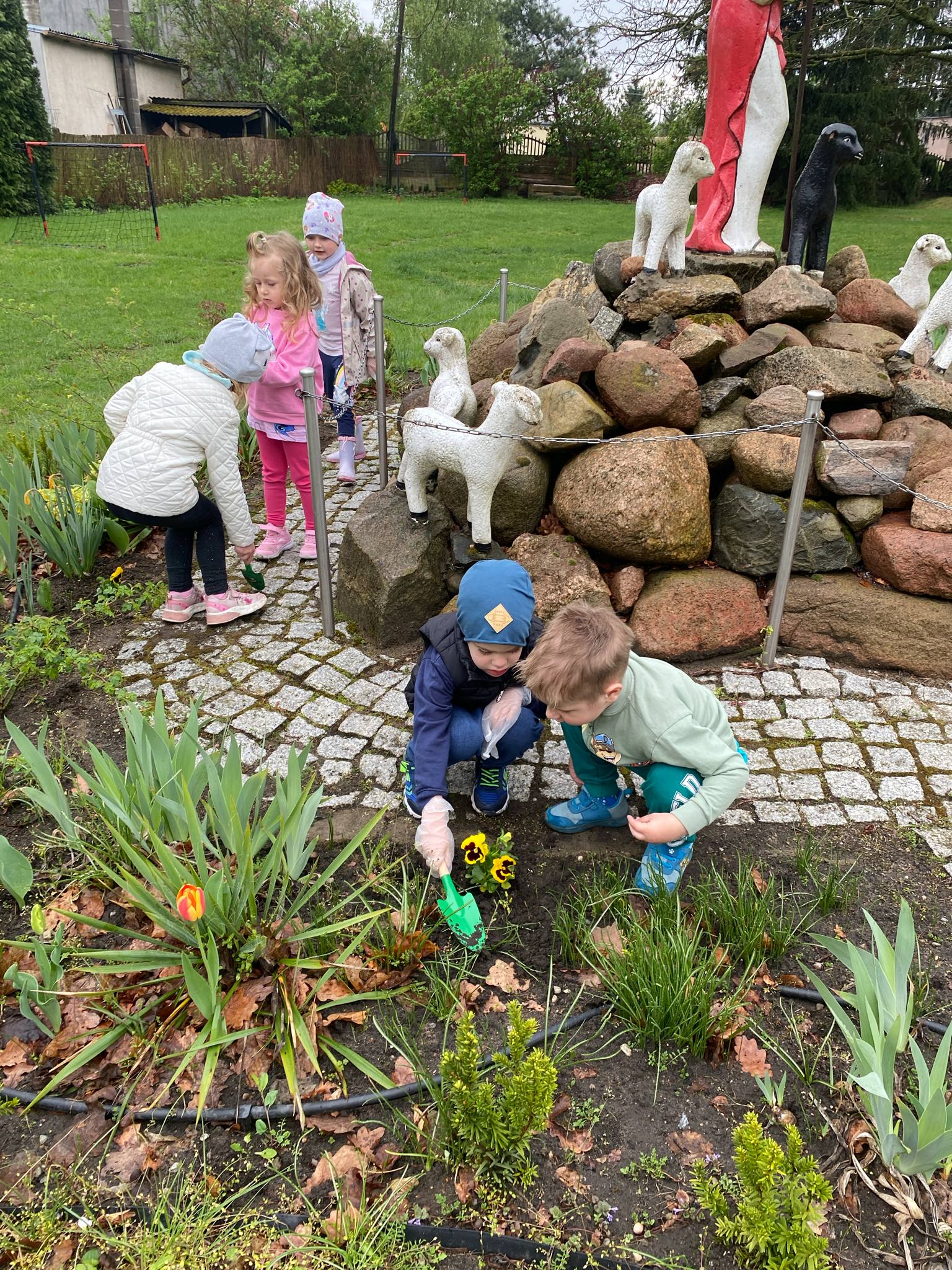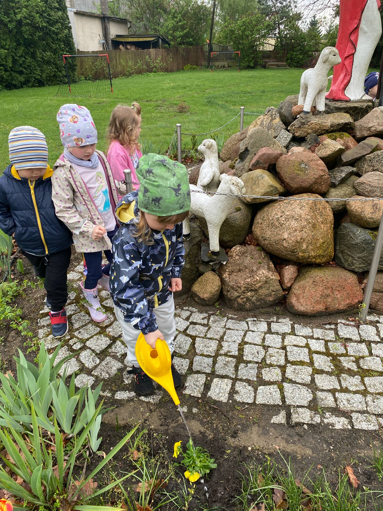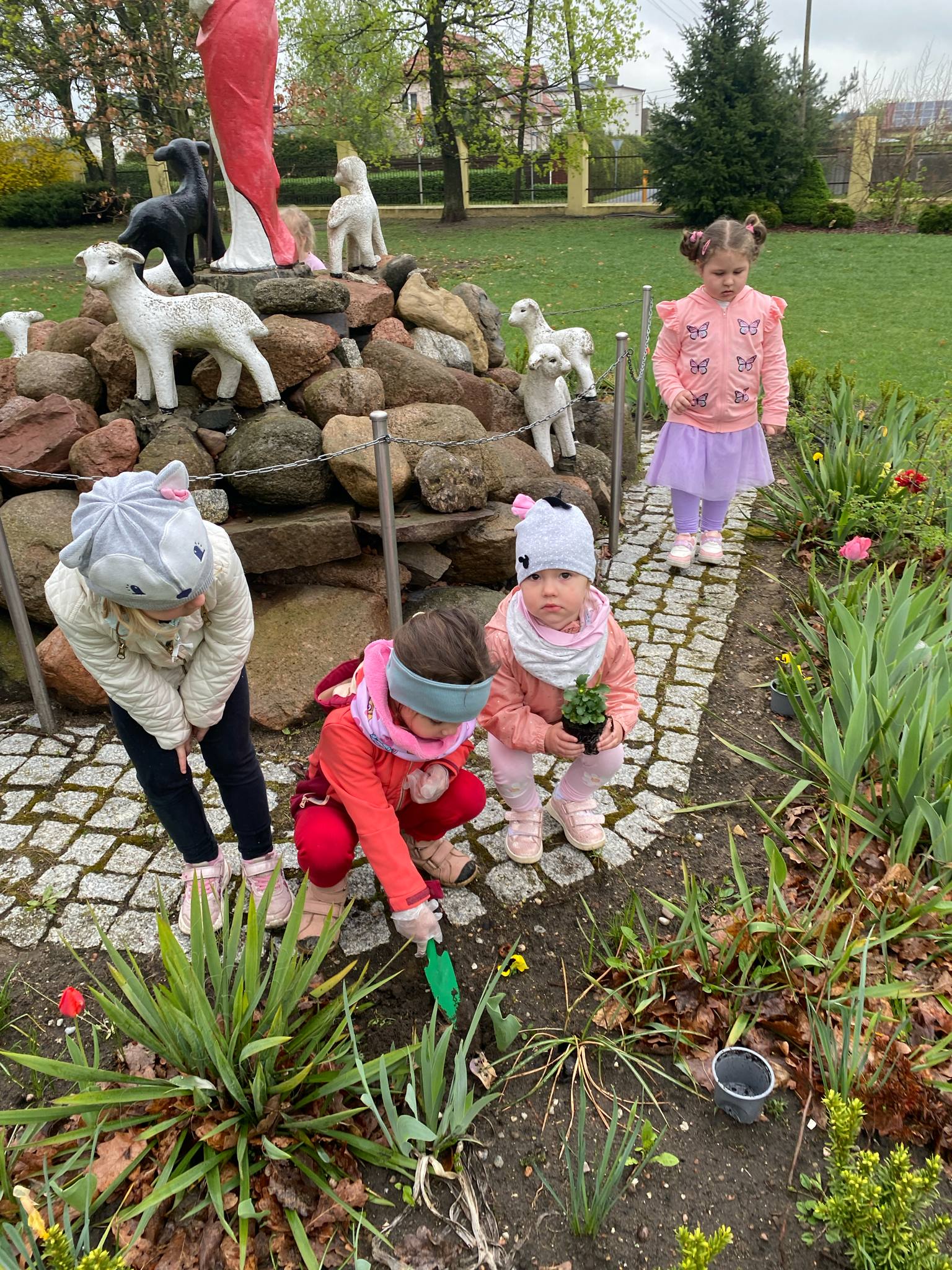 Światowy Dzień Ziemi nasze maluszki obchodziły sadząc bratki wokół figurki Pana Jezusa Dobrego Pasterza.