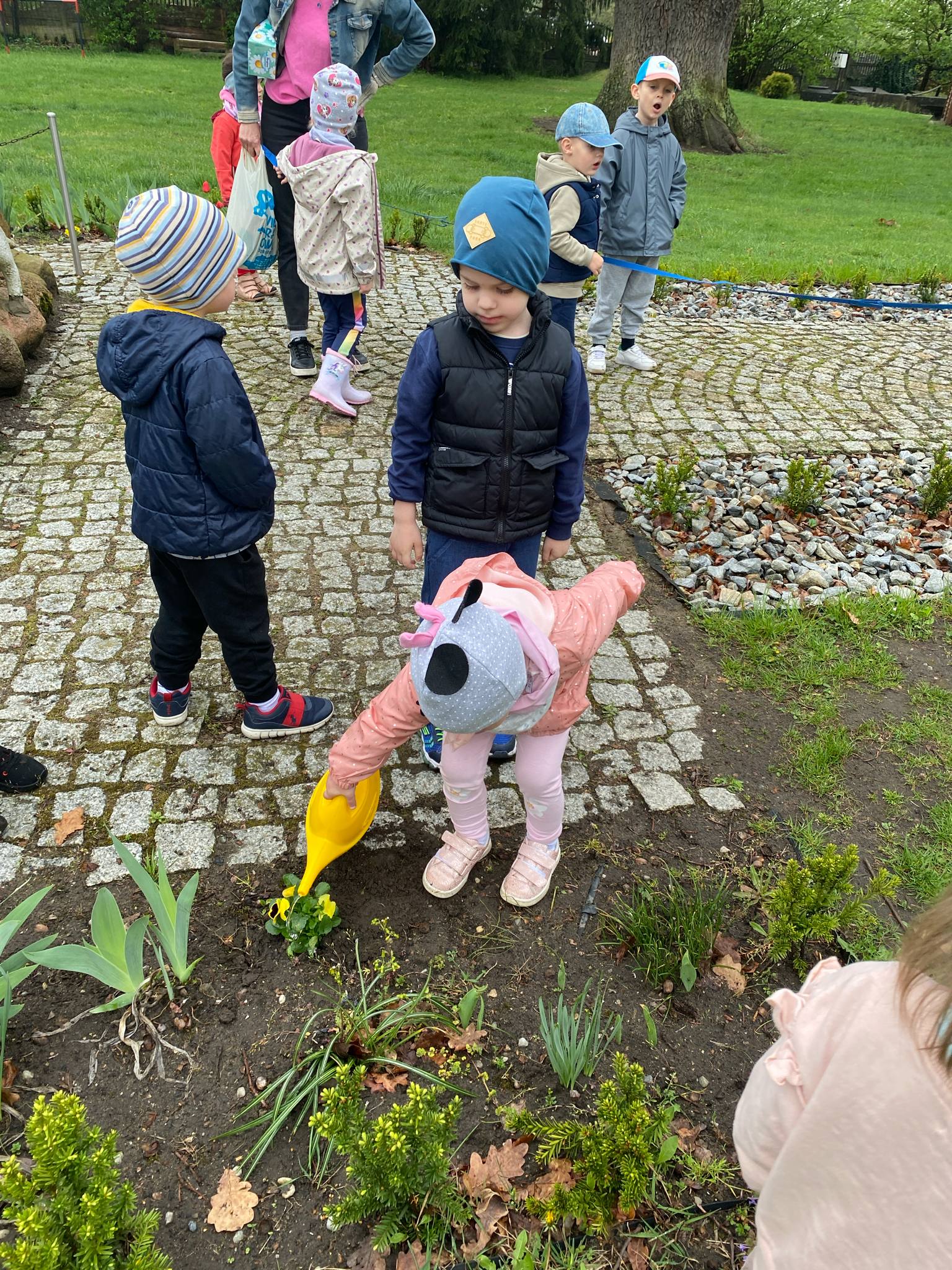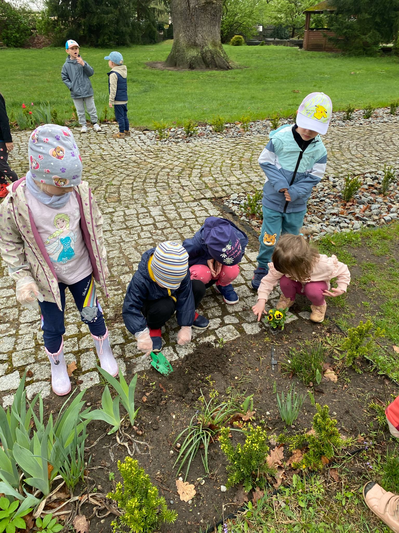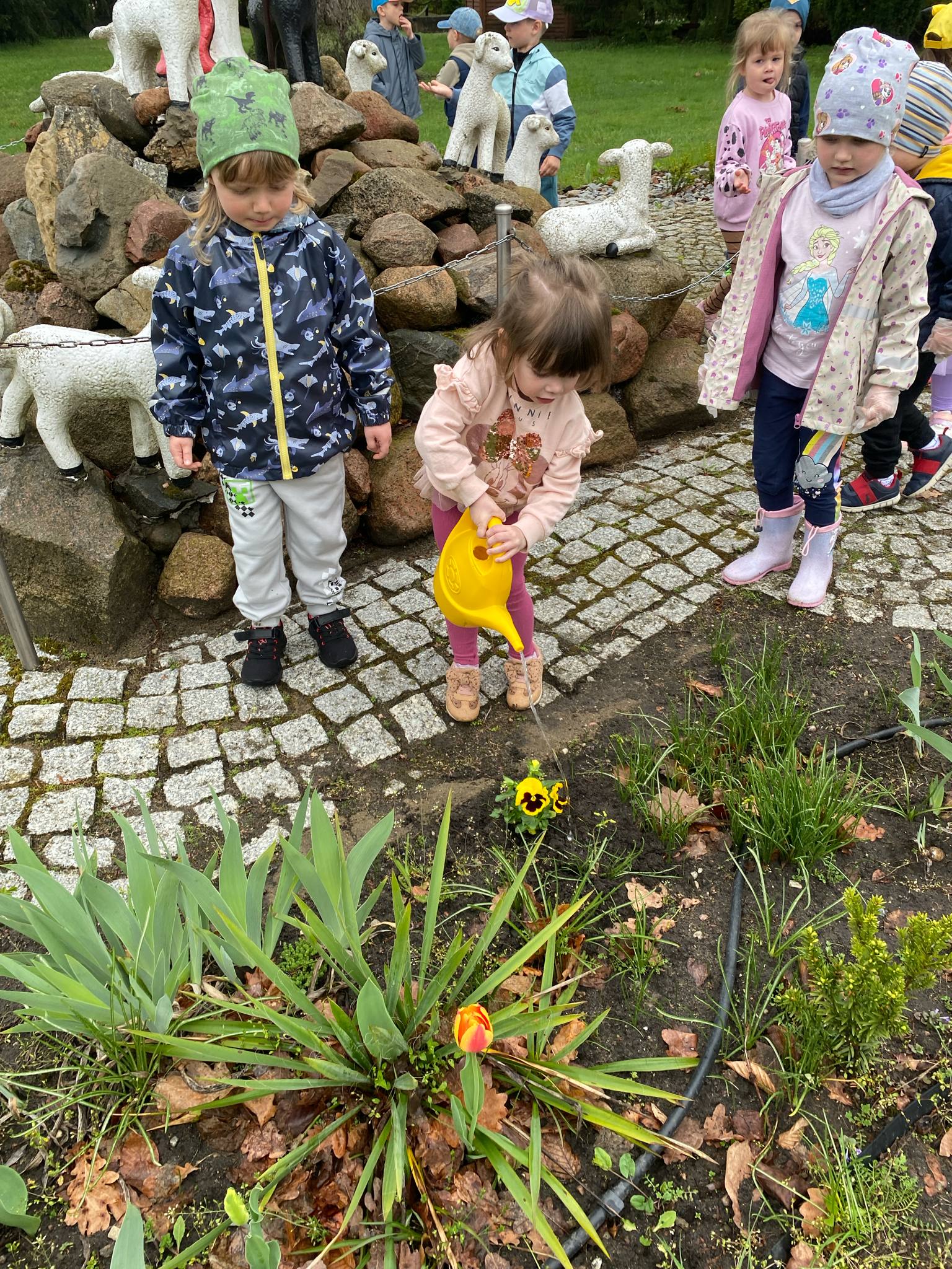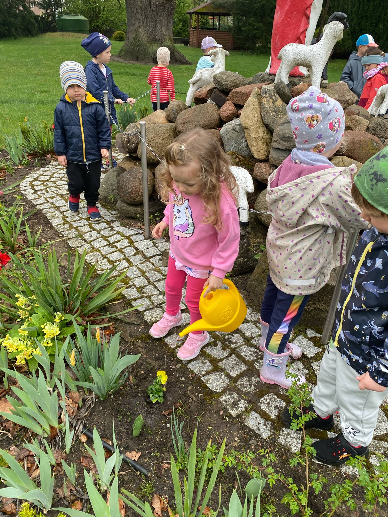 Światowy Dzień Ziemi nasze maluszki obchodziły sadząc bratki wokół figurki Pana Jezusa Dobrego Pasterza.