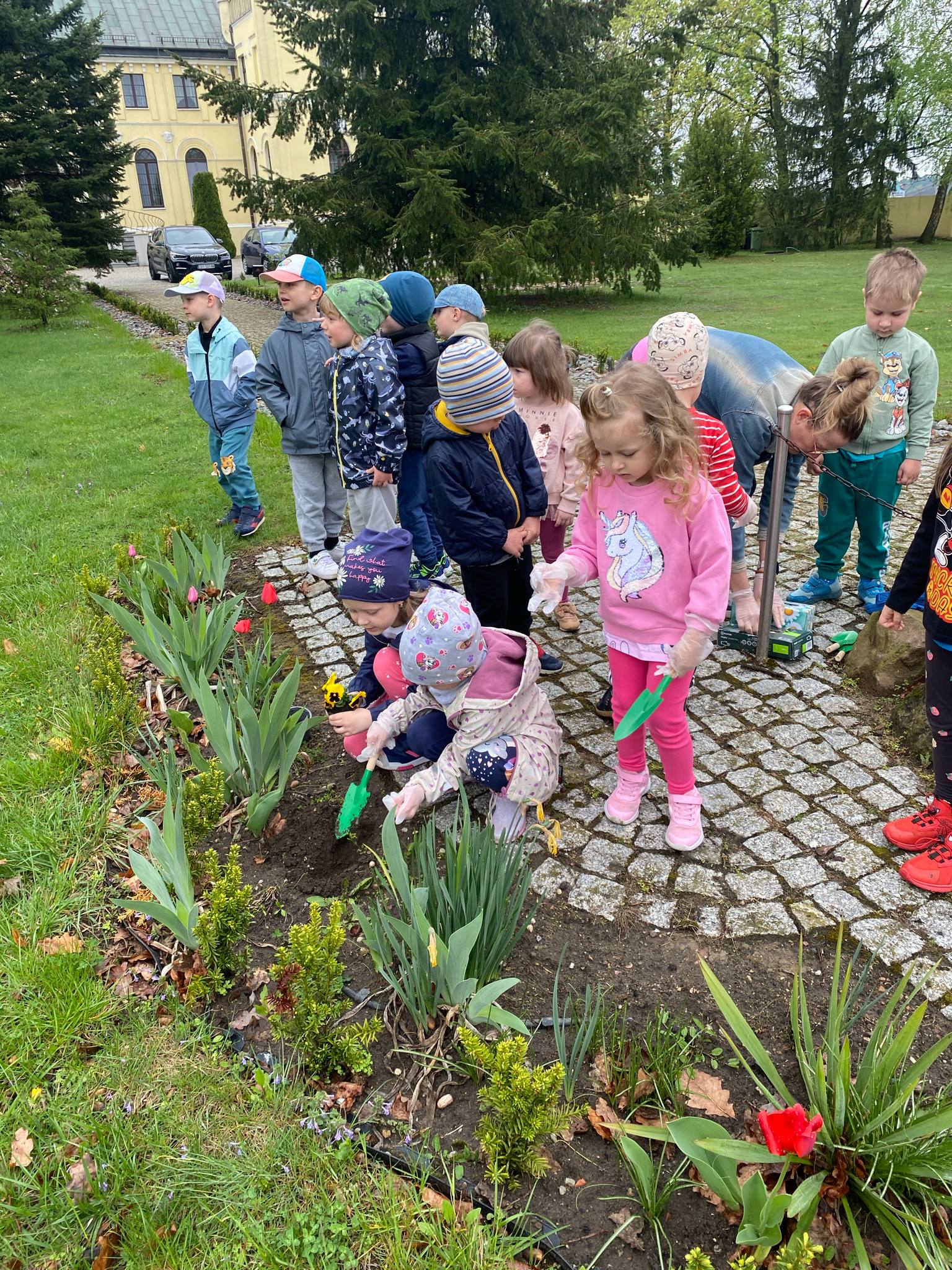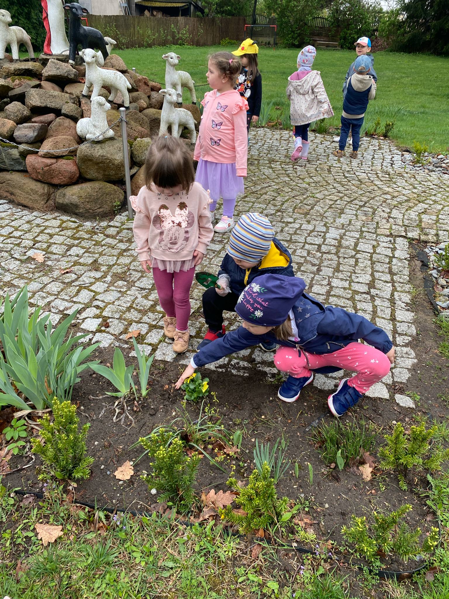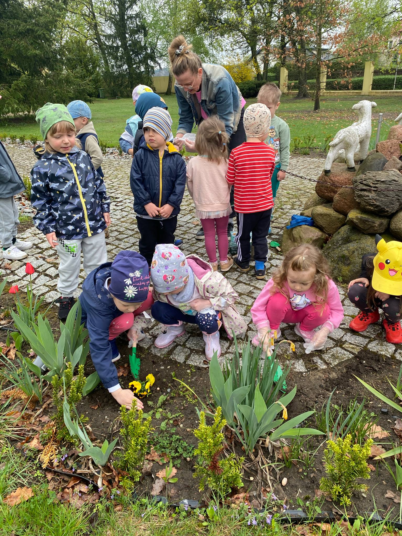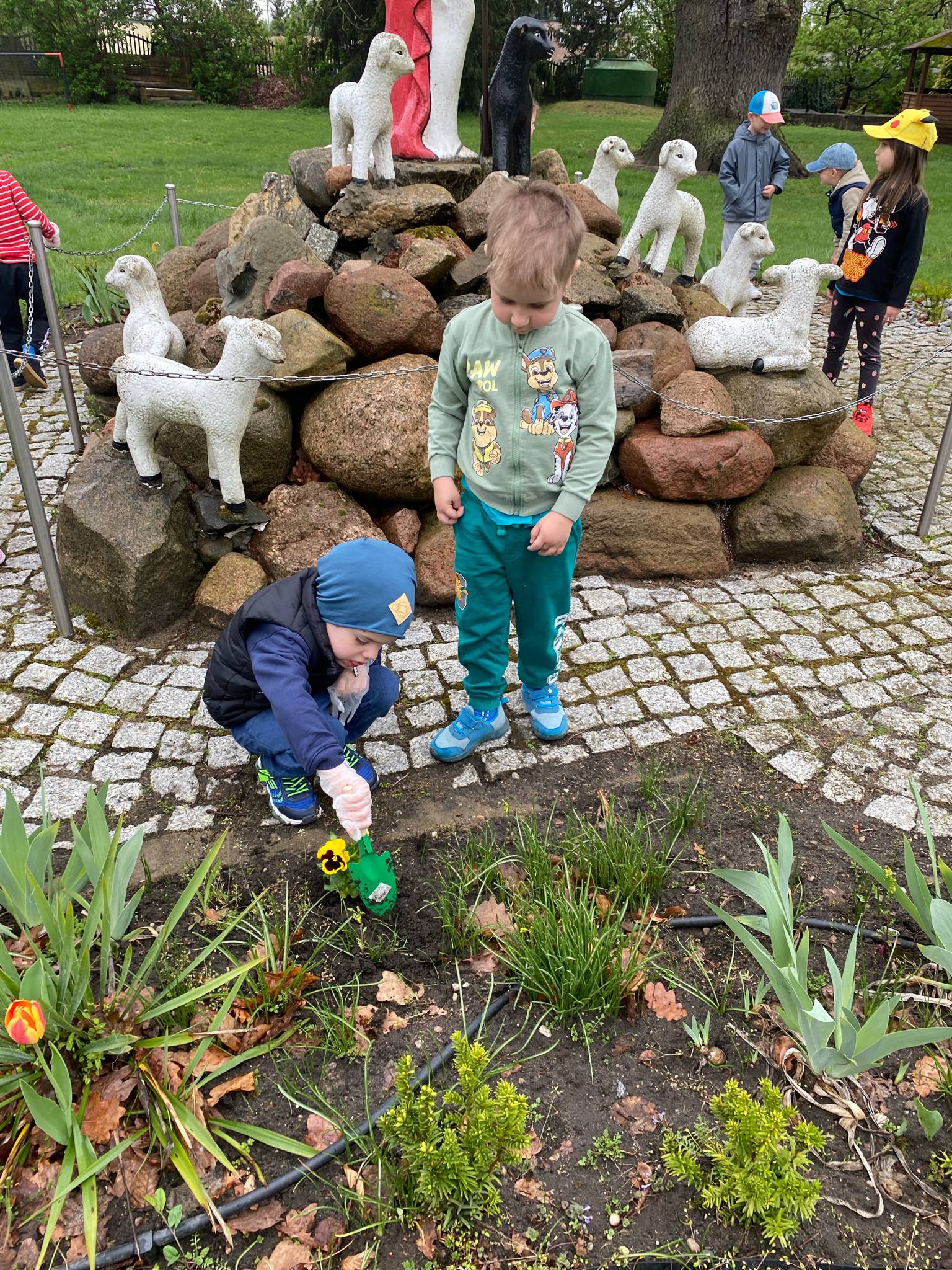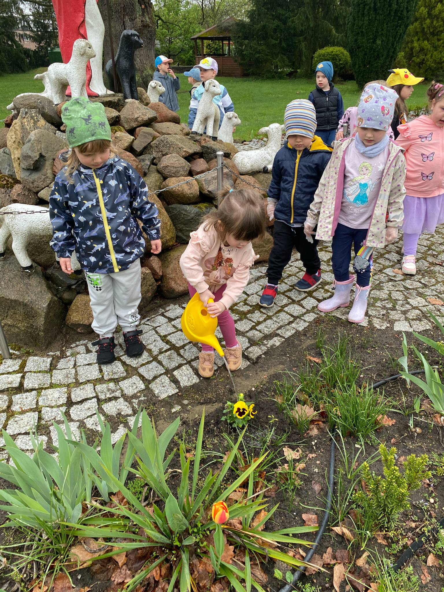 Światowy Dzień Ziemi nasze maluszki obchodziły sadząc bratki wokół figurki Pana Jezusa Dobrego Pasterza.