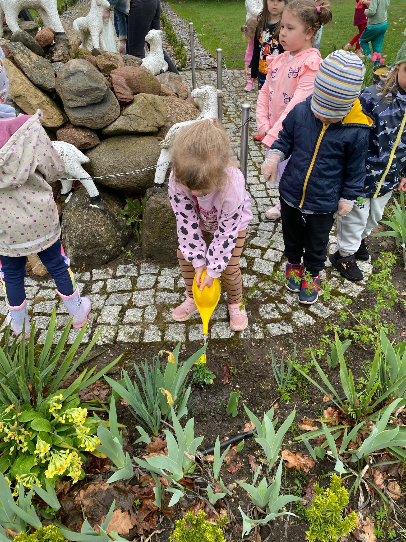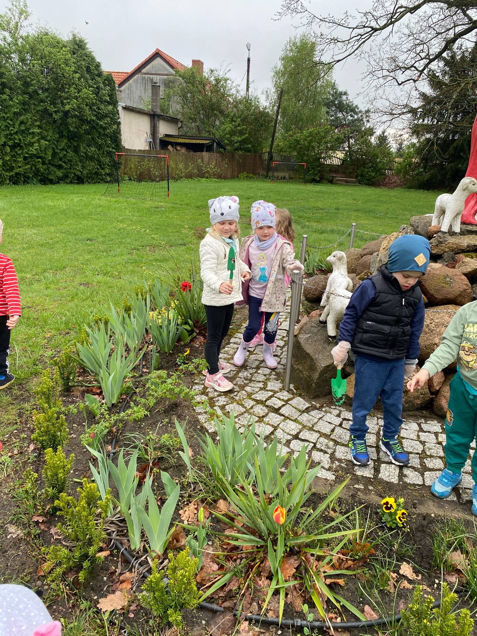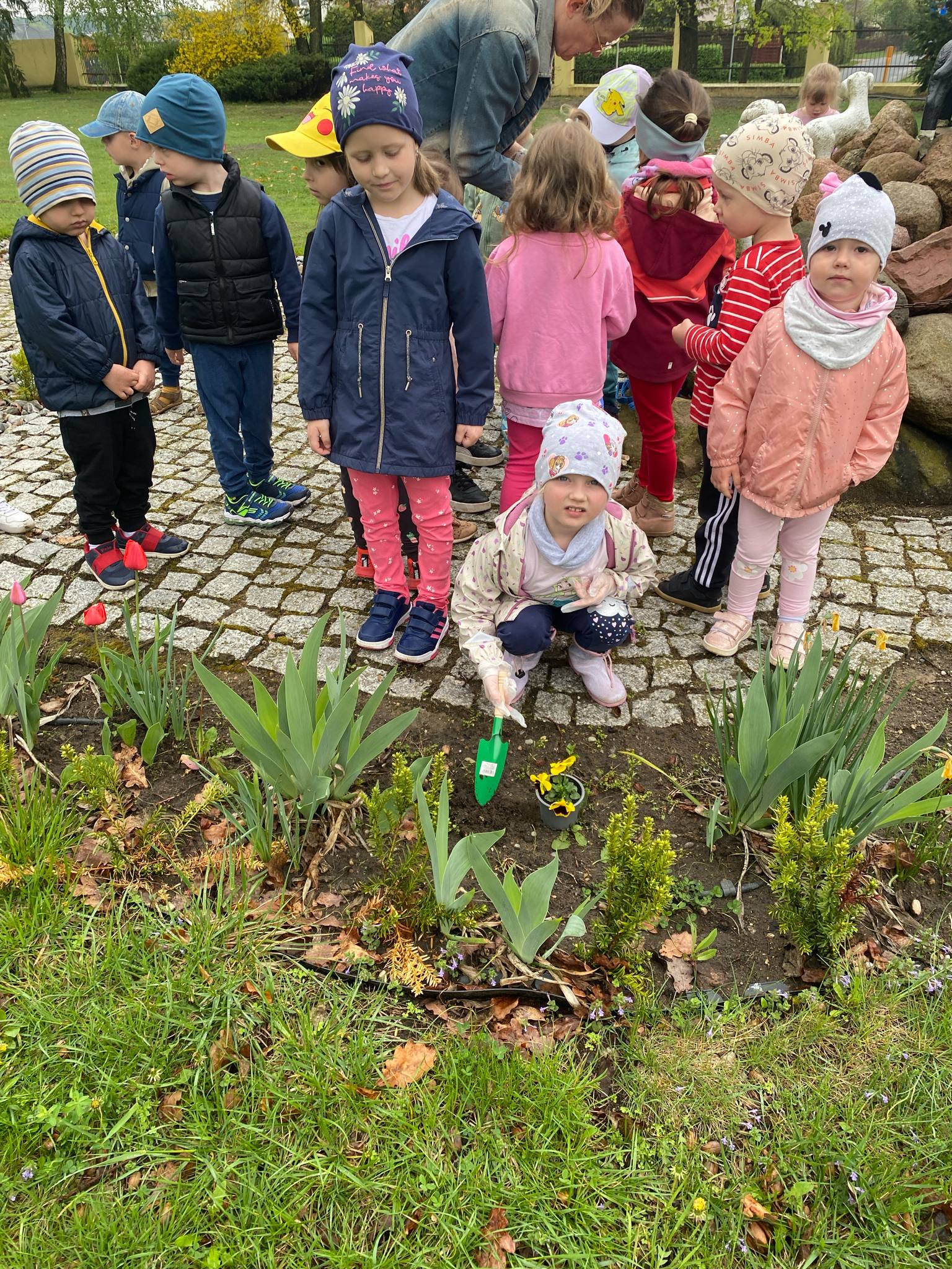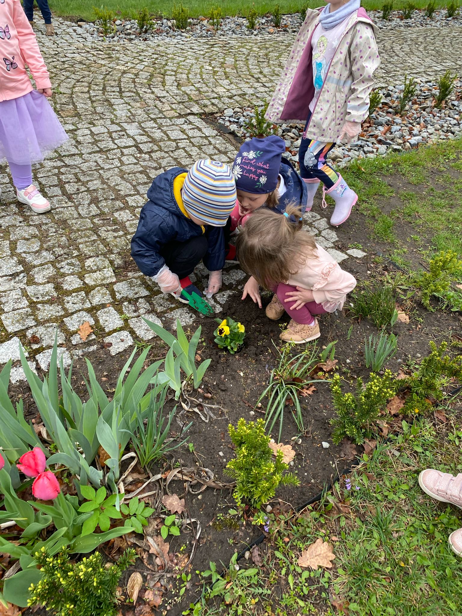 Światowy Dzień Ziemi nasze maluszki obchodziły sadząc bratki wokół figurki Pana Jezusa Dobrego Pasterza.