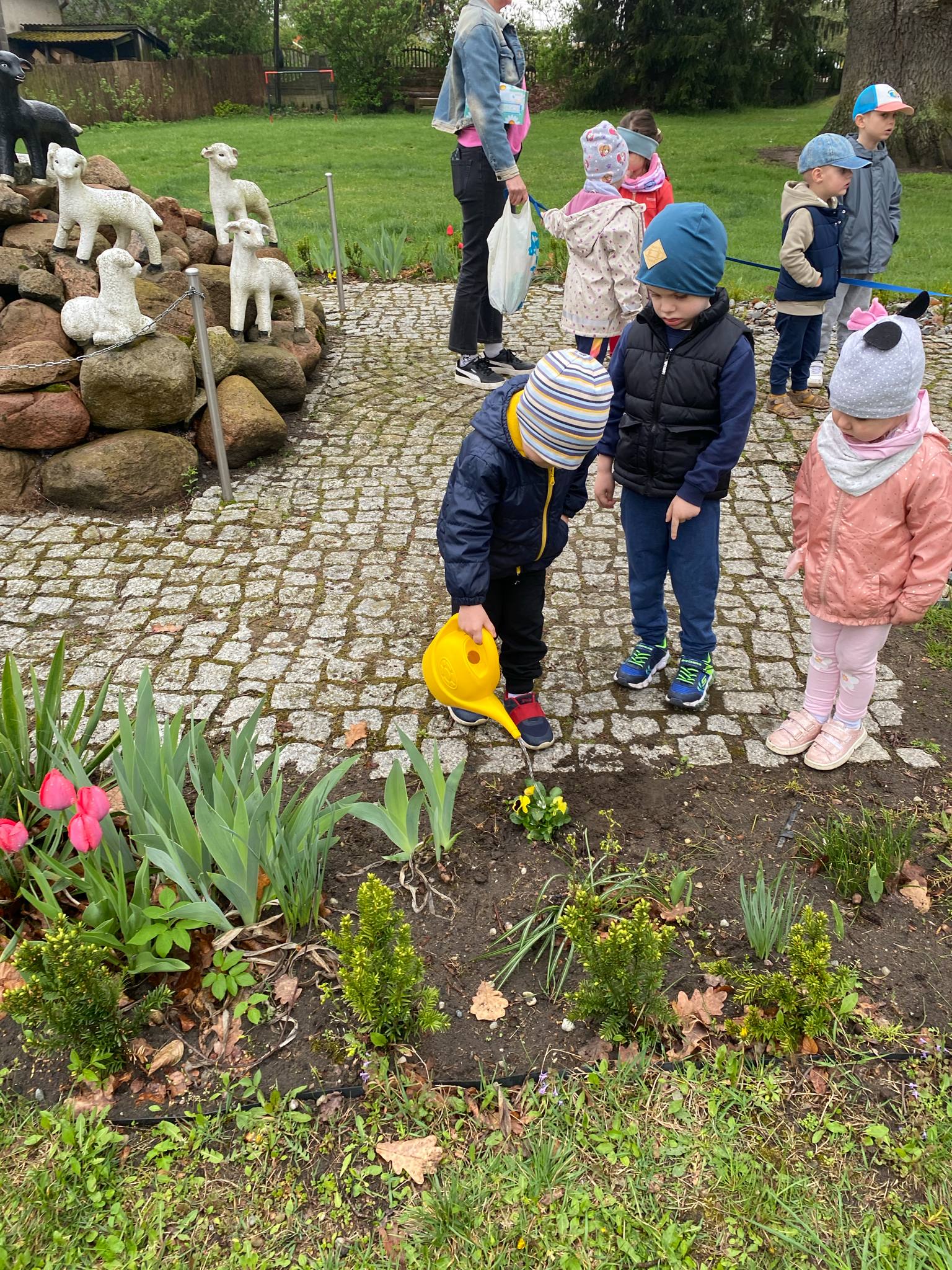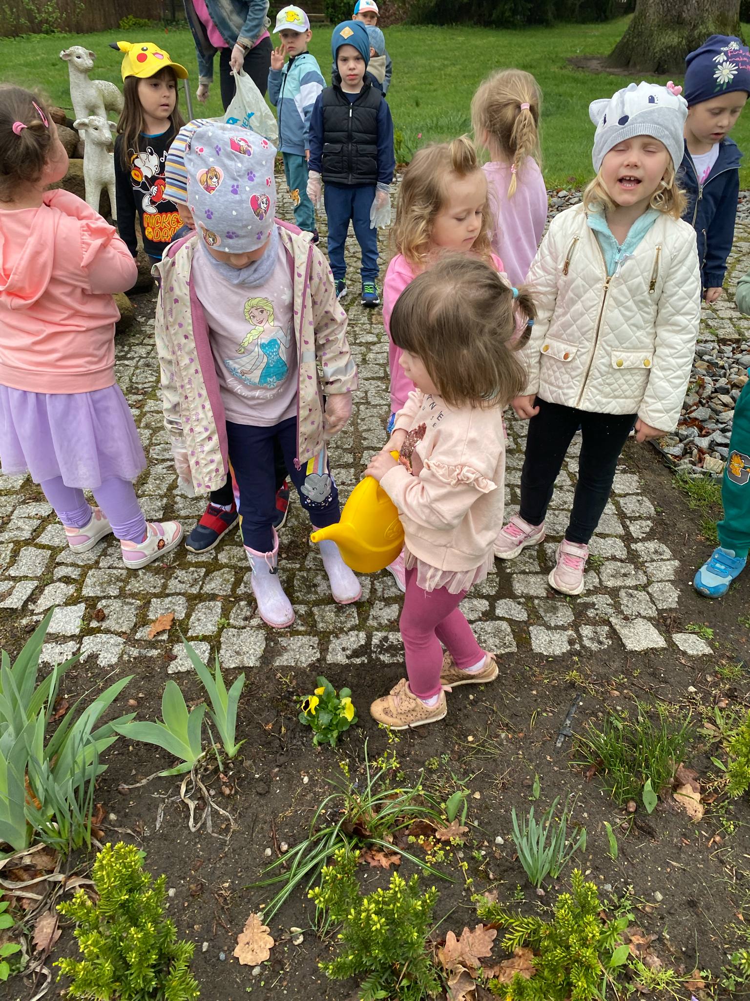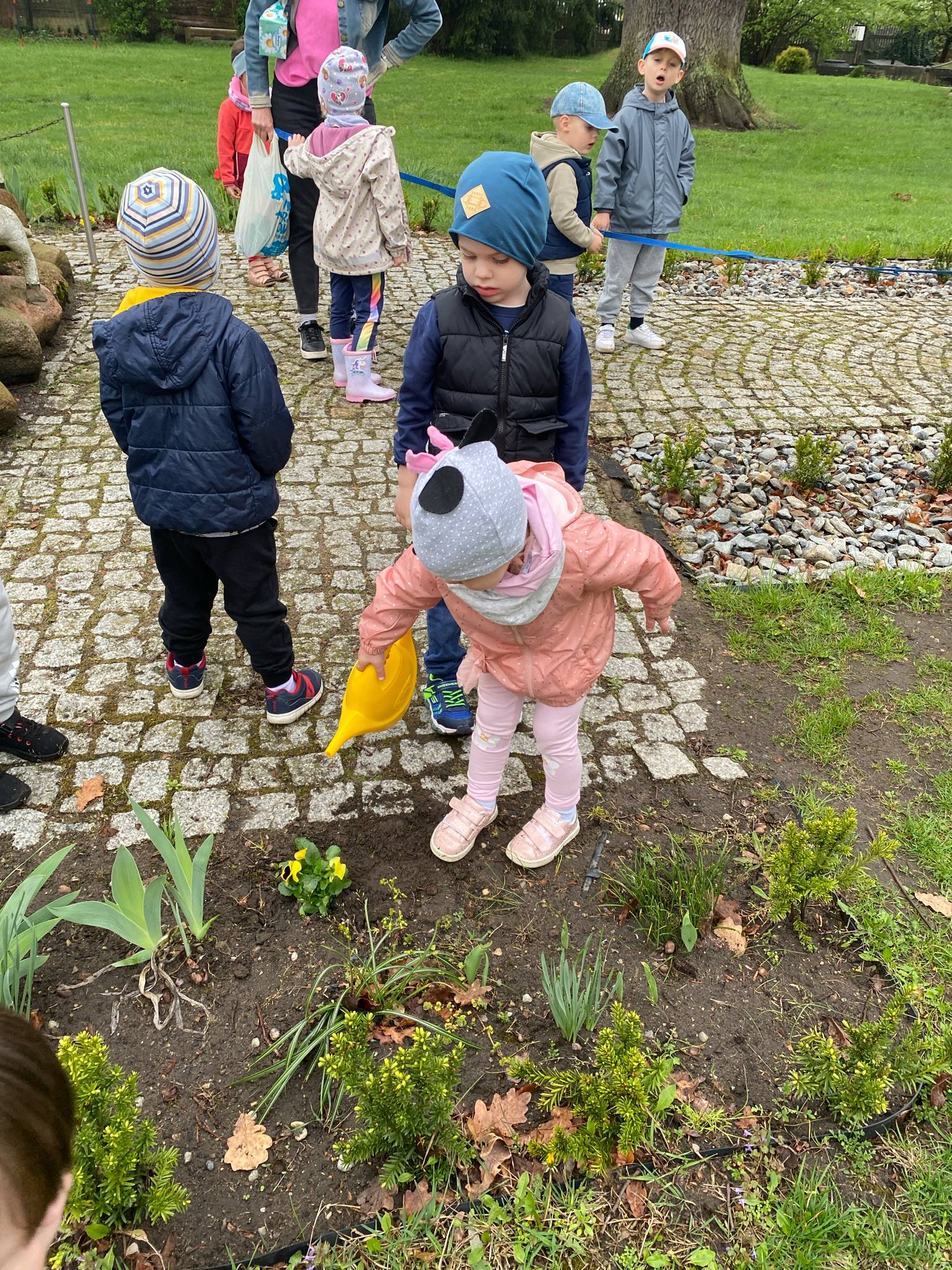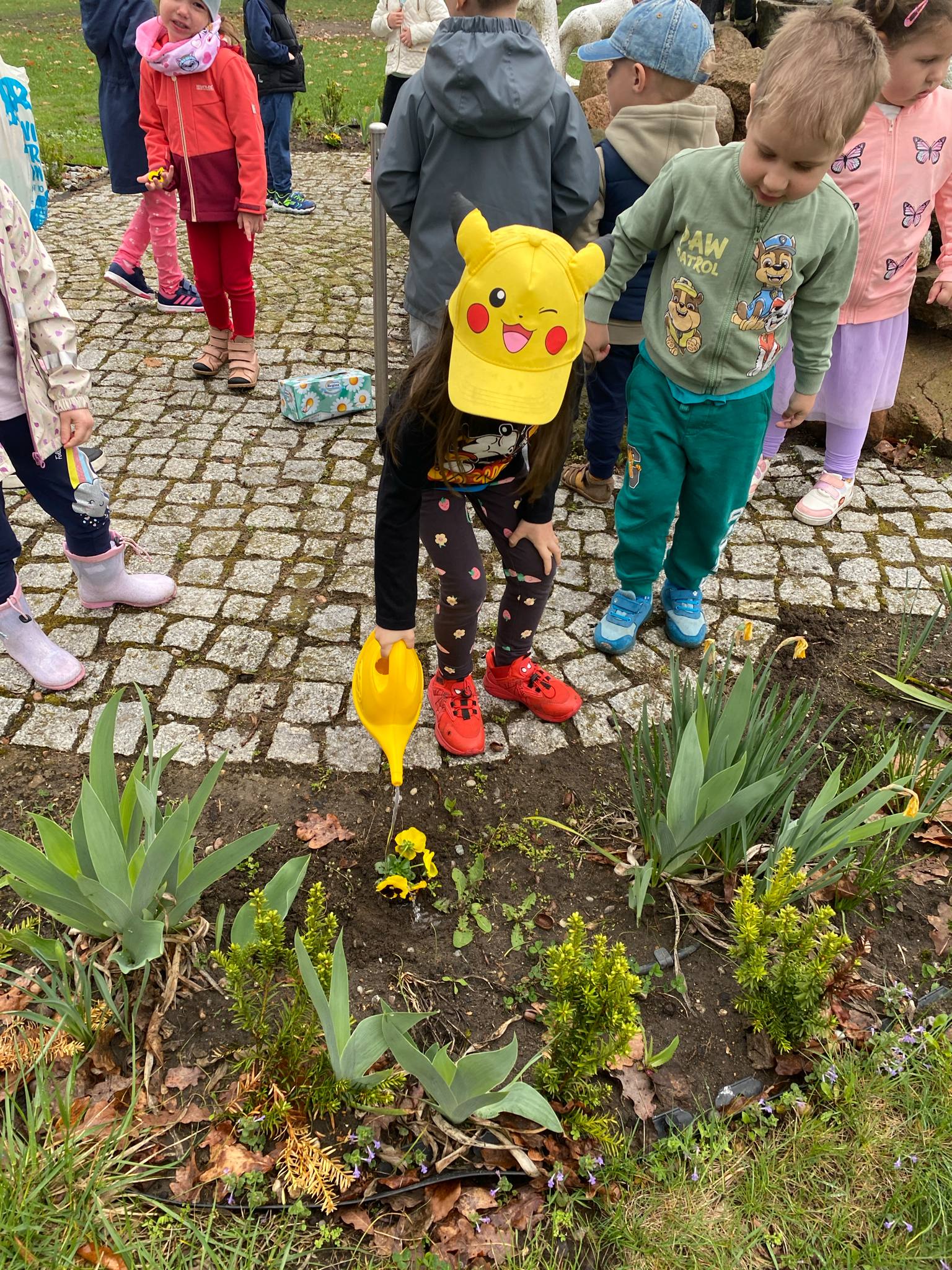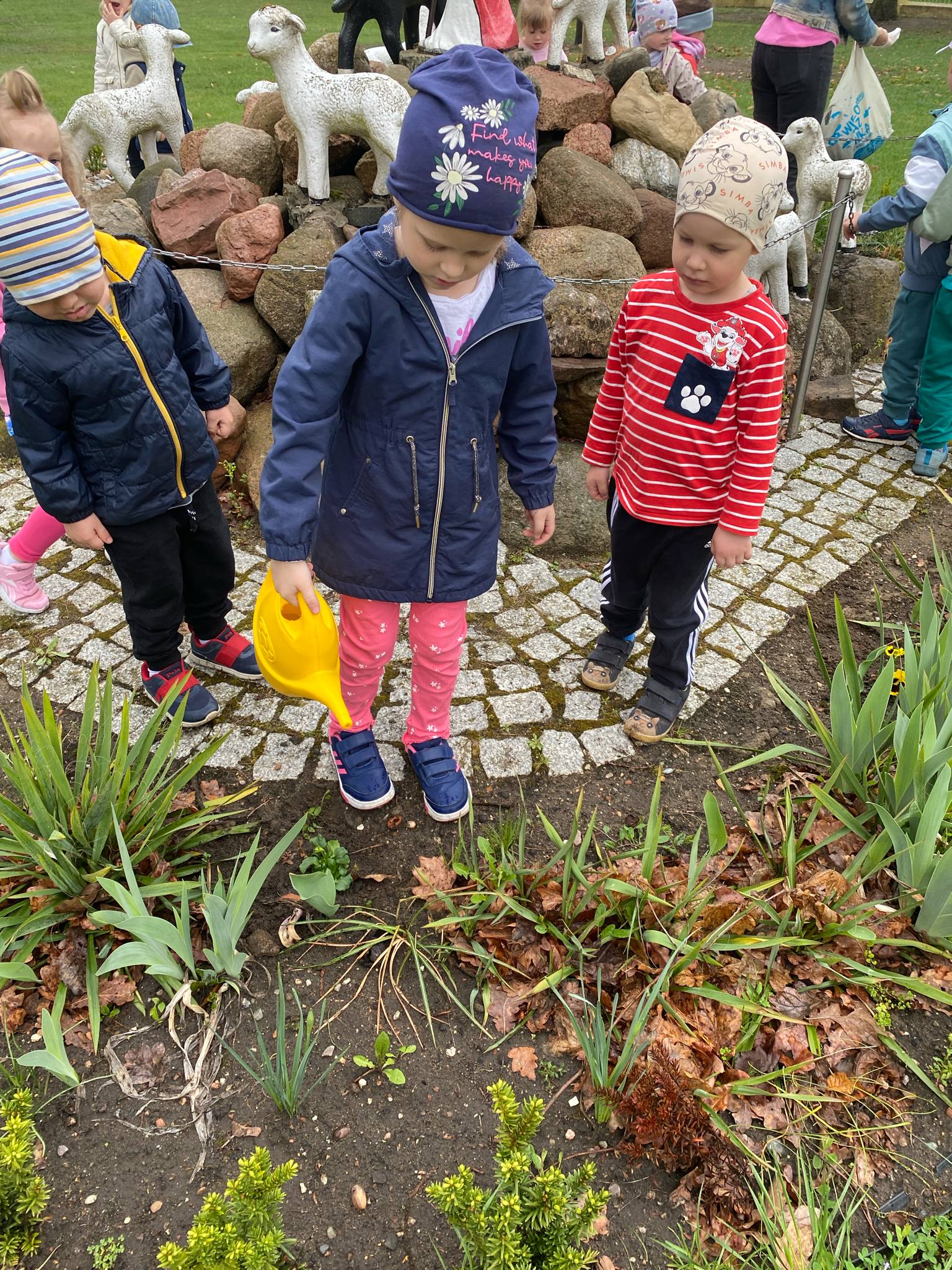 Światowy Dzień Ziemi nasze maluszki obchodziły sadząc bratki wokół figurki Pana Jezusa Dobrego Pasterza.
