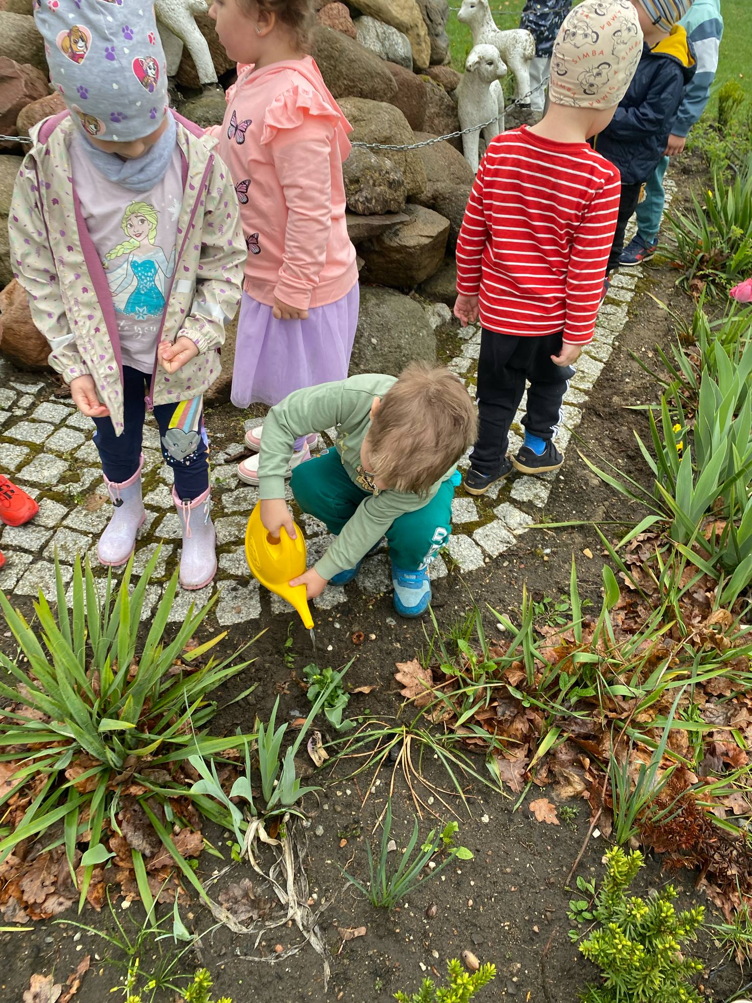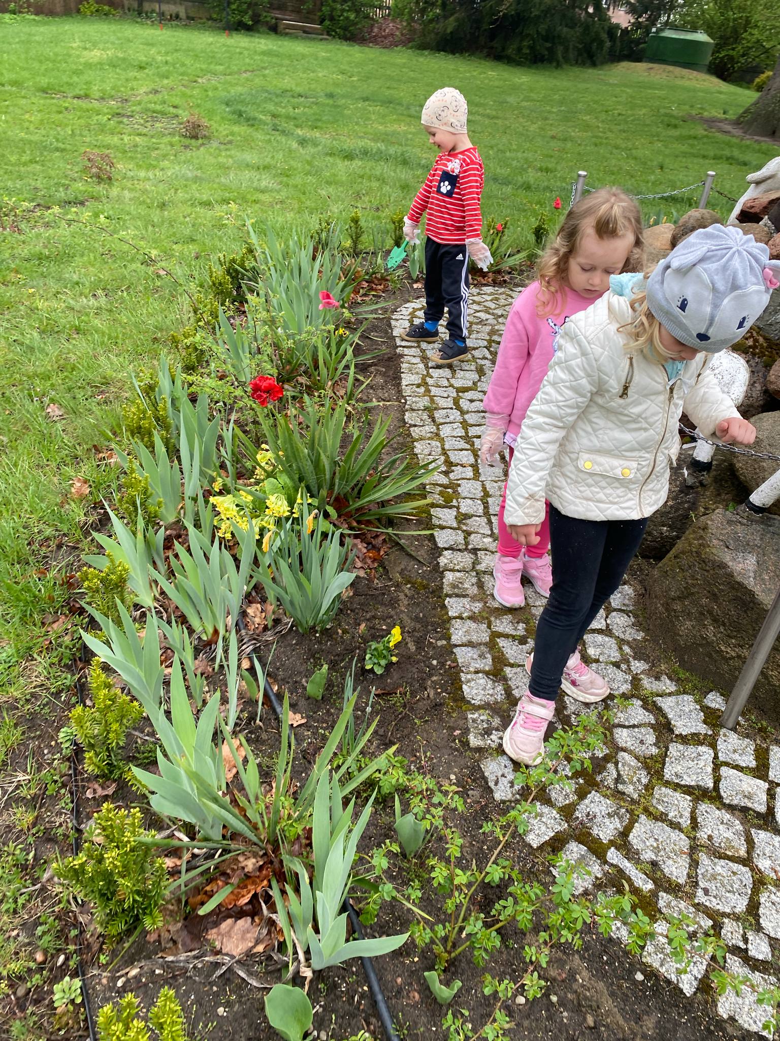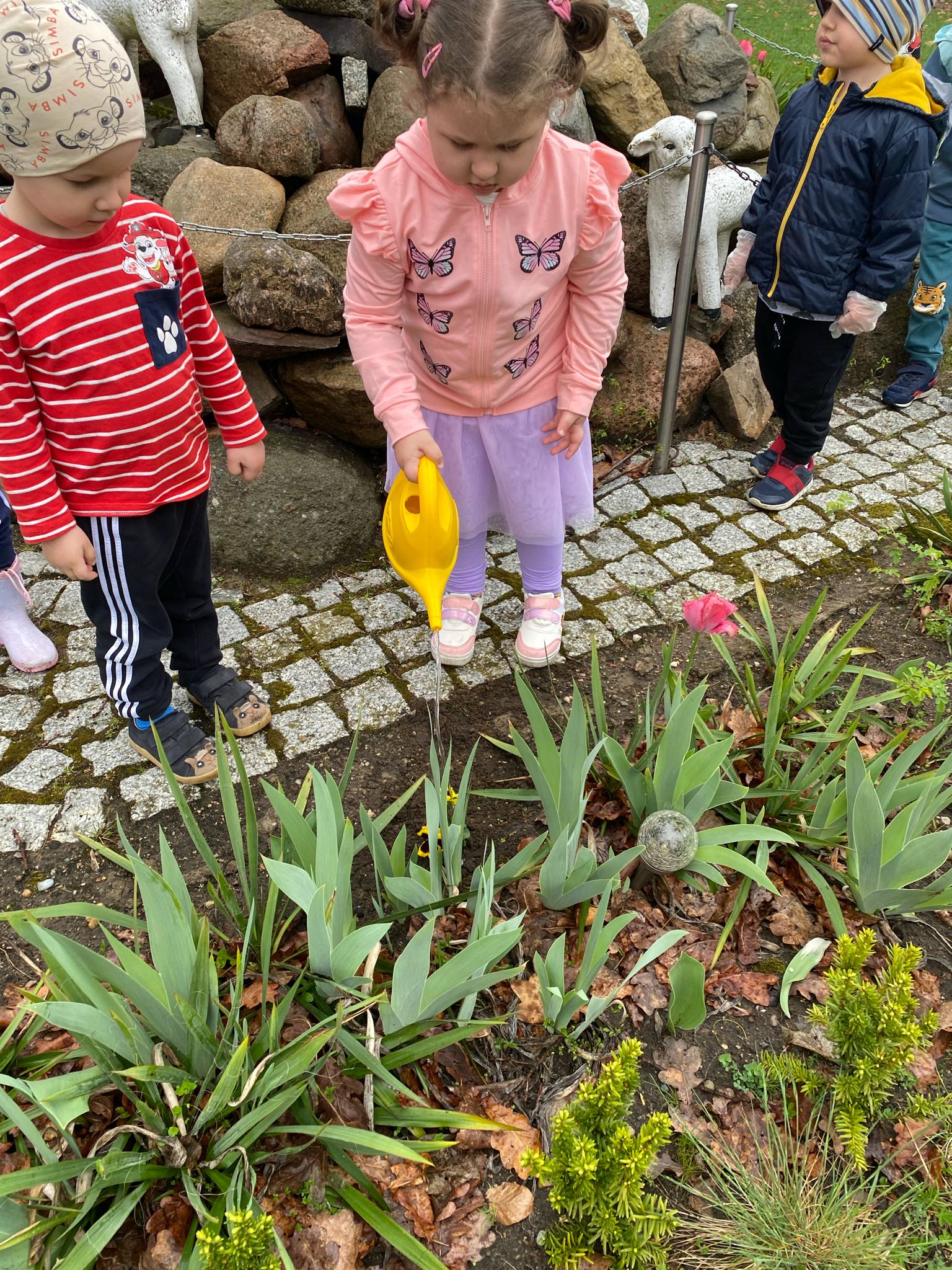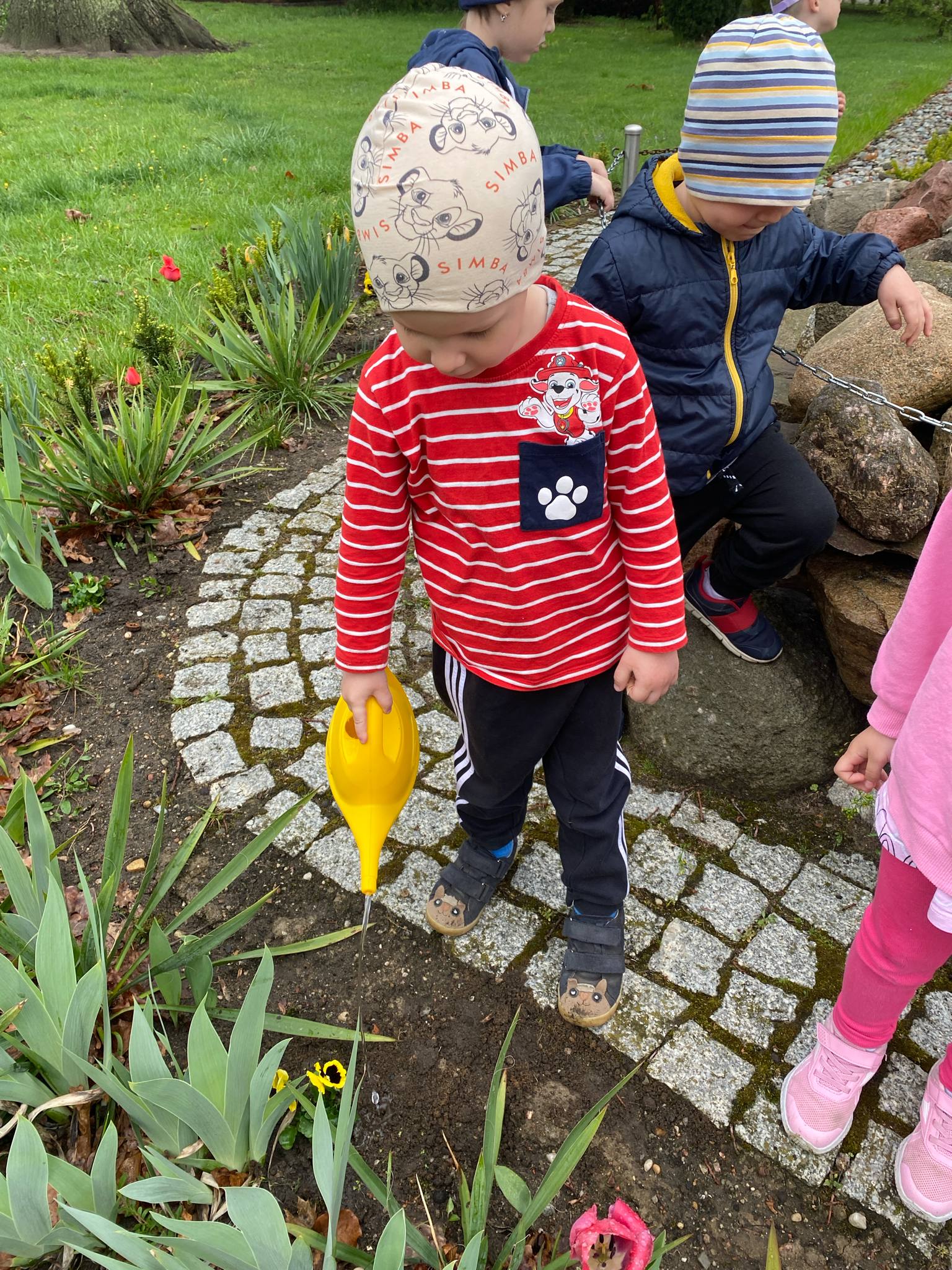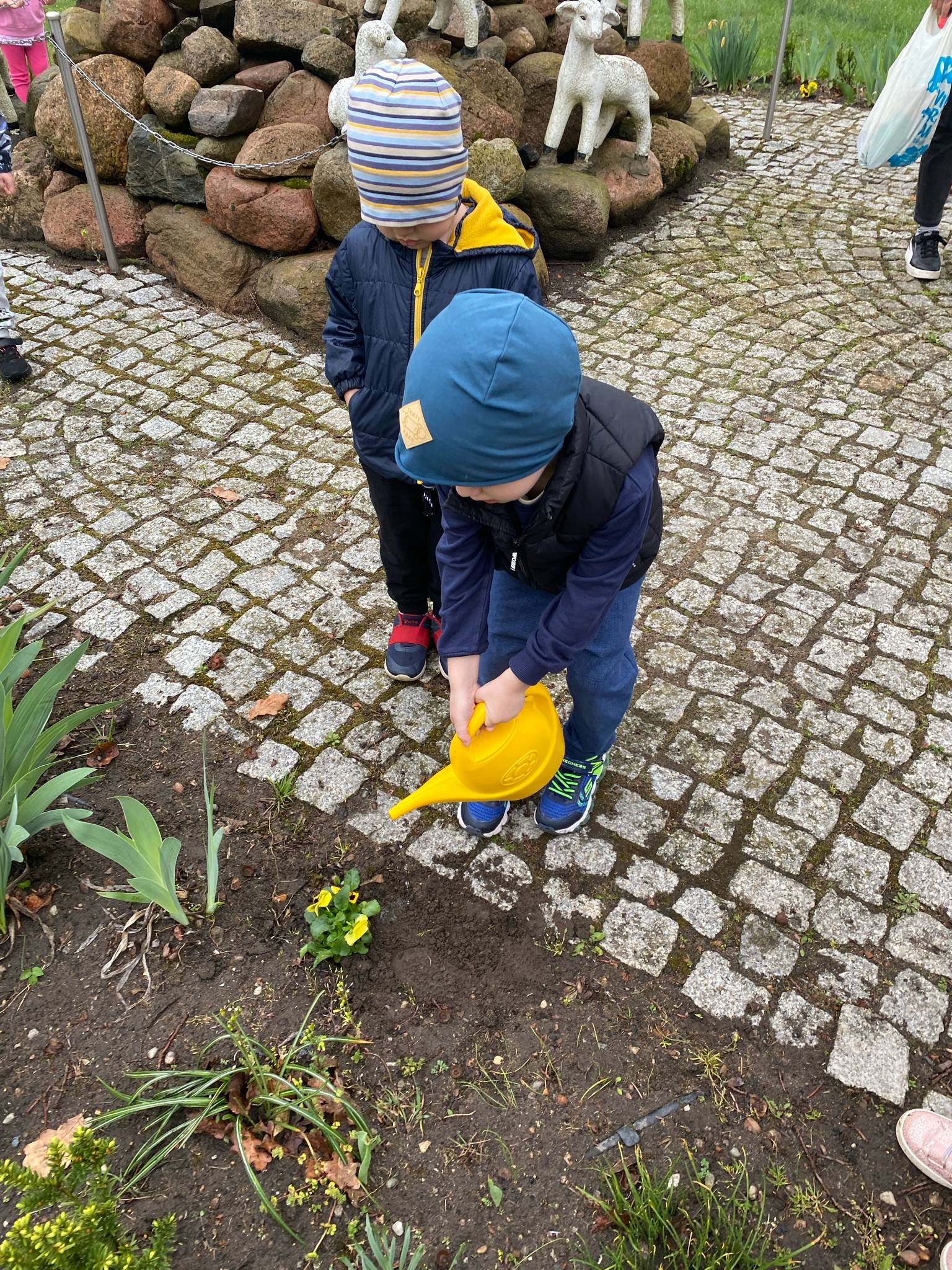 Światowy Dzień Ziemi nasze maluszki obchodziły sadząc bratki wokół figurki Pana Jezusa Dobrego Pasterza.