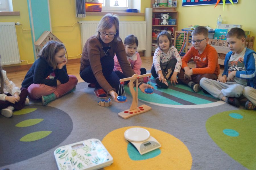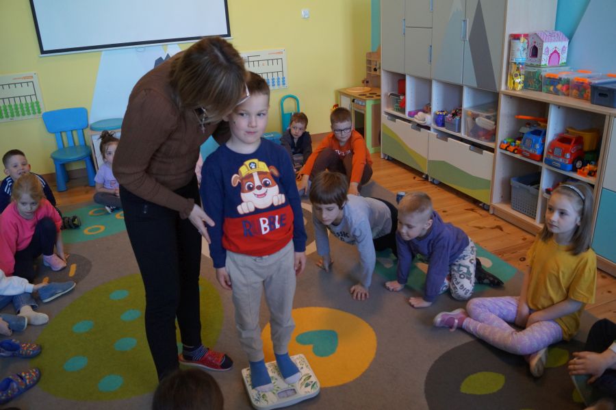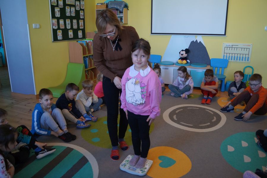 Grupa starsza na zajęciach poznała różne rodzaje wag. Dzieci porównywały przedmioty ze względu na ciężar. Na zakończenie postanowiliśmy poznać swoją wagę, kto jest najlżejszy a kto najcięższy.