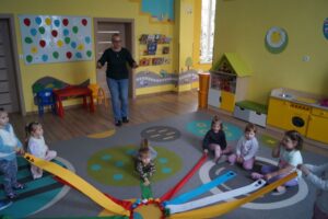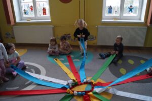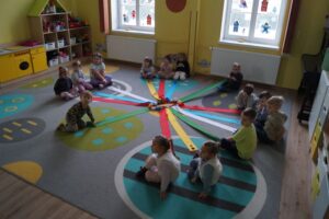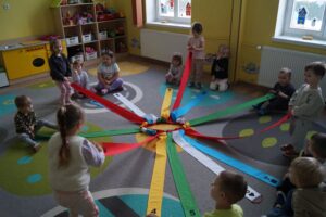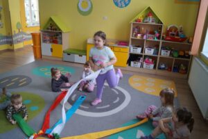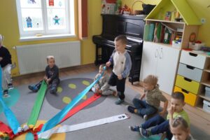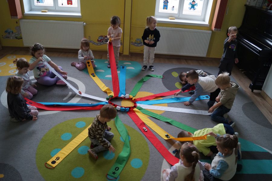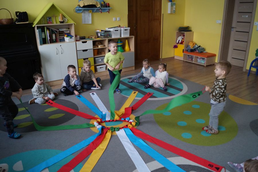 Dzisiaj dzieci bawiły sie z „Wiatrakiem matematycznym „. Utrwalały kolory oraz liczyły na konkretach: 3-latki do 5 a 4-latki do 8. Na końcu była zabawa w zjazd samochodzików.