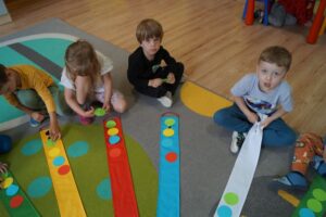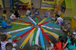 Dzisiaj na zajęciach był „Wiatrak matematyczny”. Dzieci liczyły, utrwalały kolory, była również zabawa na skojarzenia oraz na końcu zadanie- każde z dzieci miało ułożyć na ramieniu wiatraka tyle kolorowych kółek ile ma lat . Zajęcia się udały i dzieciom bardzo podobały.