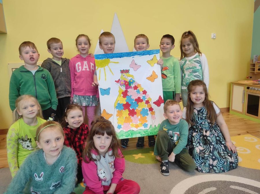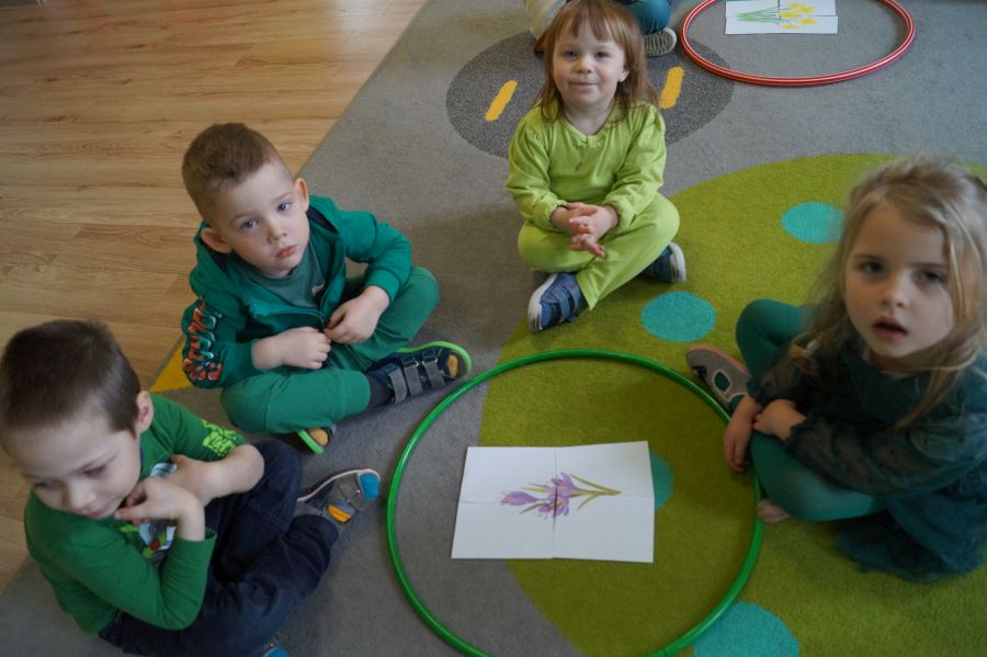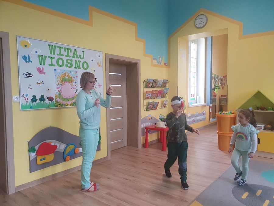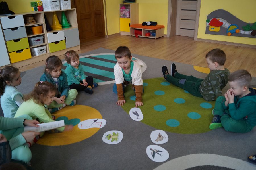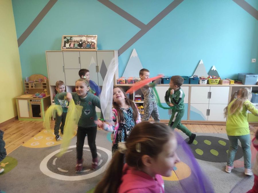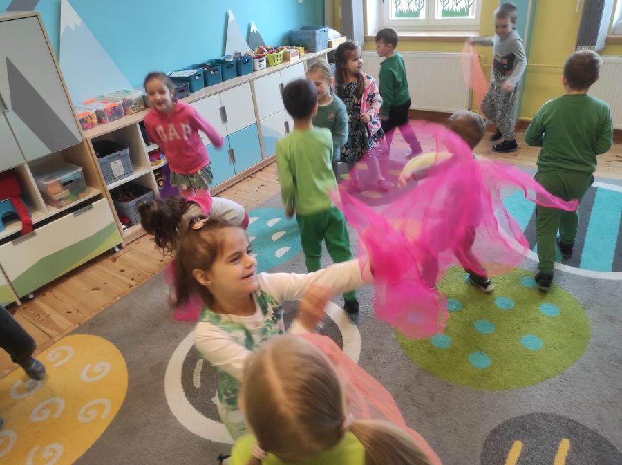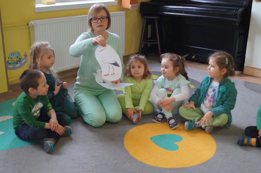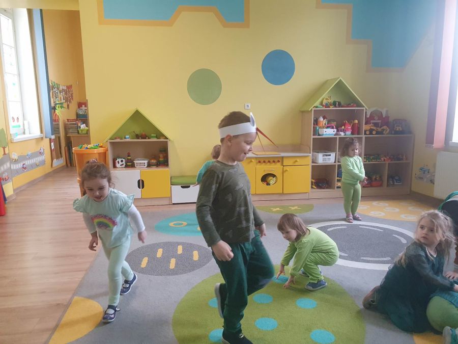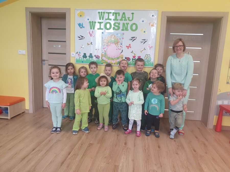 Powitanie wiosny w naszym przedszkolu odbyło się w obu grupach. Dzieci ubrane w kolorze zielonym podejmowały różne aktywności; układały puzzle, odgadywały zagadki, inscenizowały powrót bociana na łąkę, tworzyły prace plastyczne i tańczyły z kolorowymi chustami.