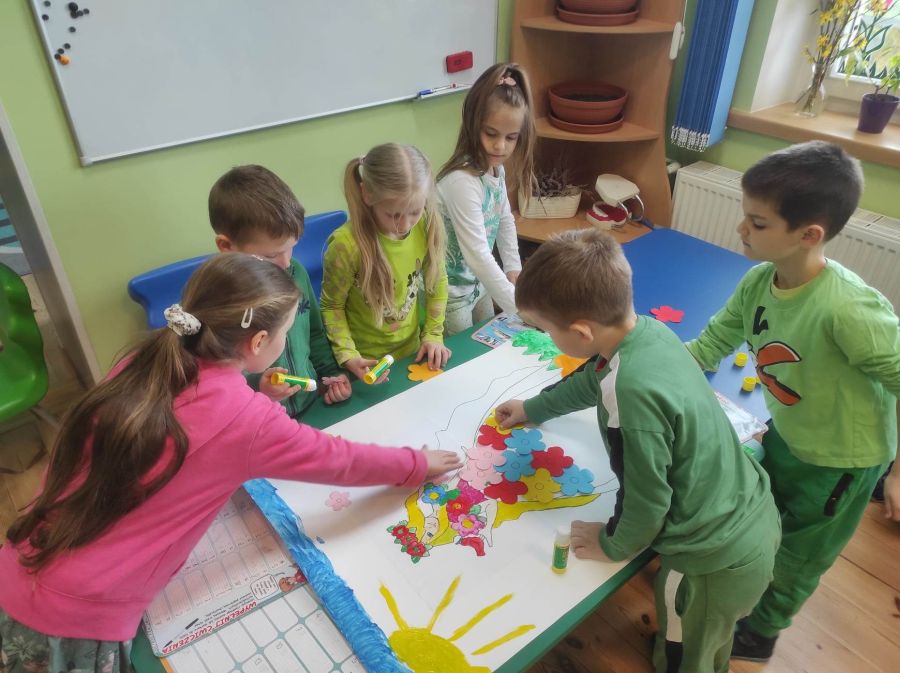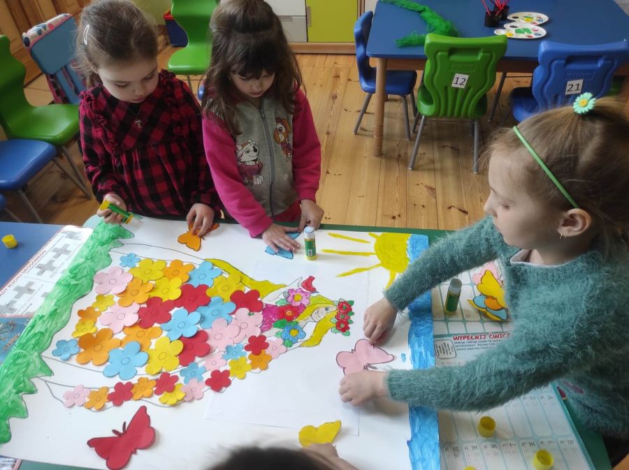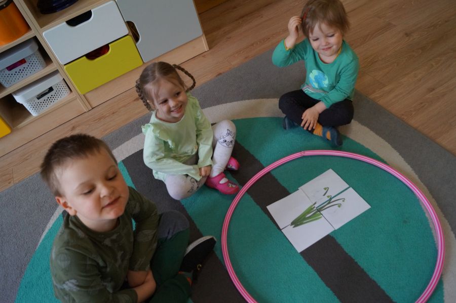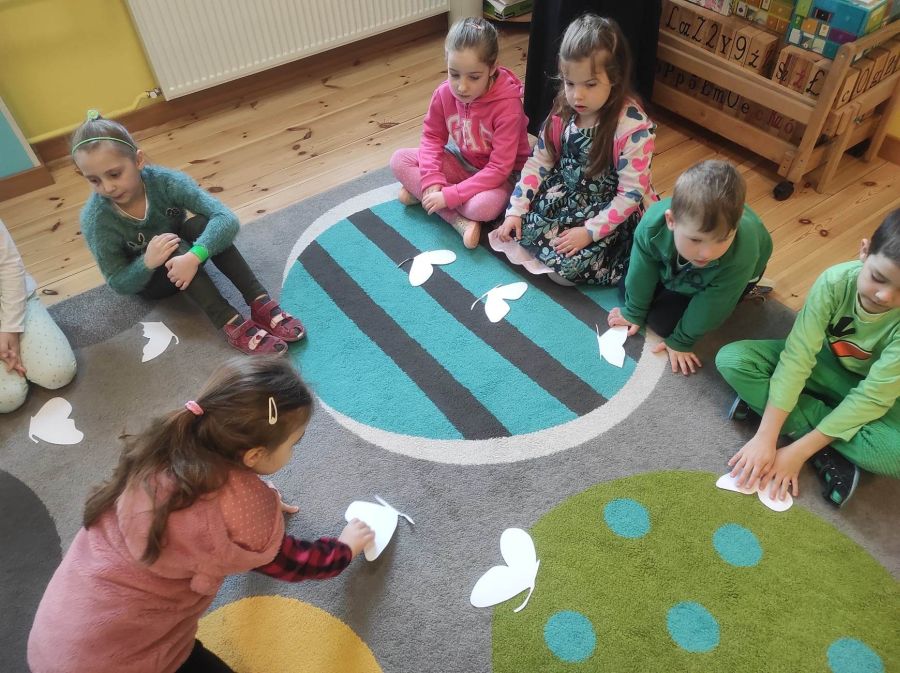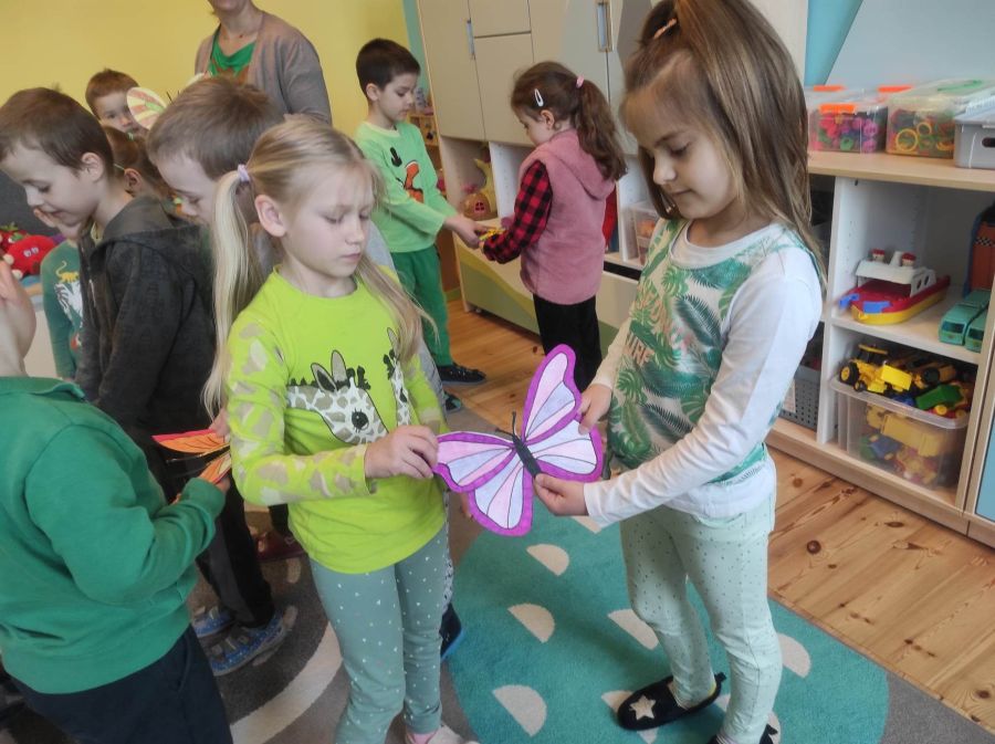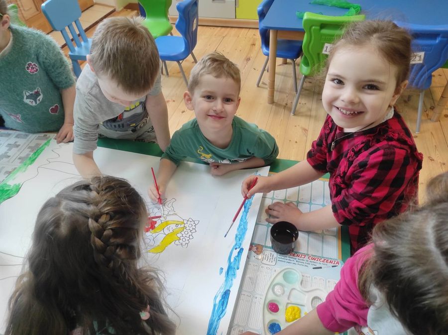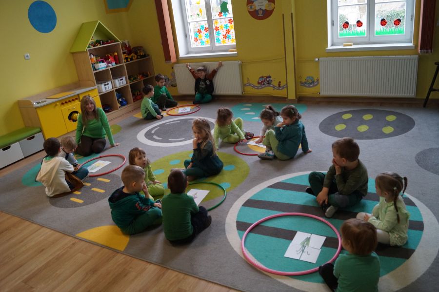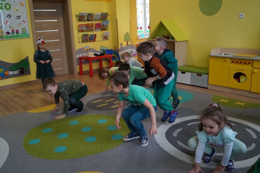 Powitanie wiosny w naszym przedszkolu odbyło się w obu grupach. Dzieci ubrane w kolorze zielonym podejmowały różne aktywności; układały puzzle, odgadywały zagadki, inscenizowały powrót bociana na łąkę, tworzyły prace plastyczne i tańczyły z kolorowymi chustami.