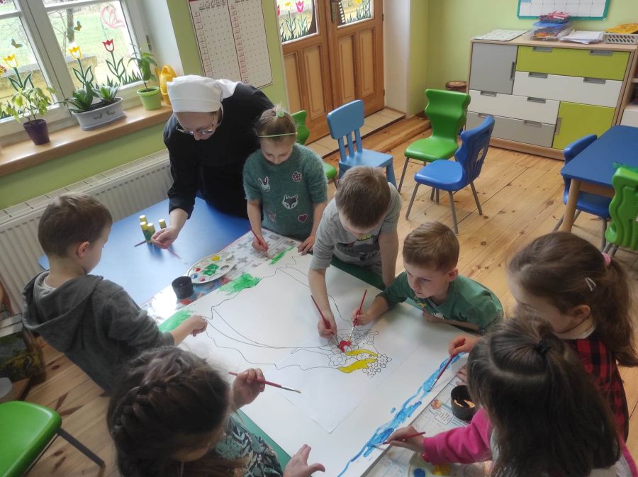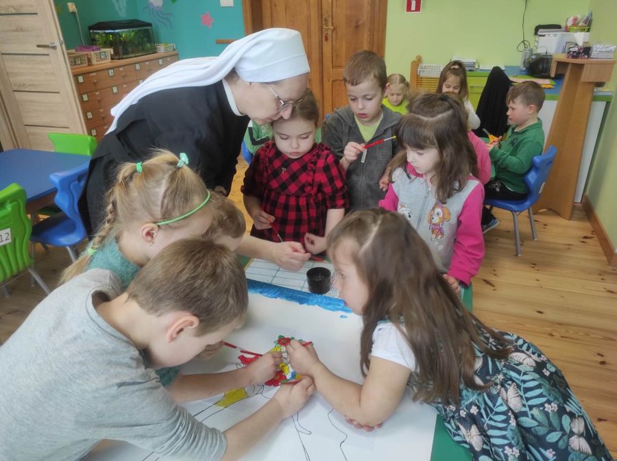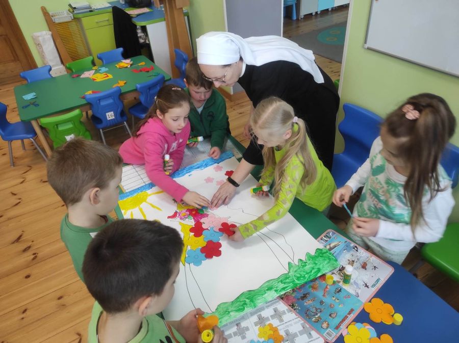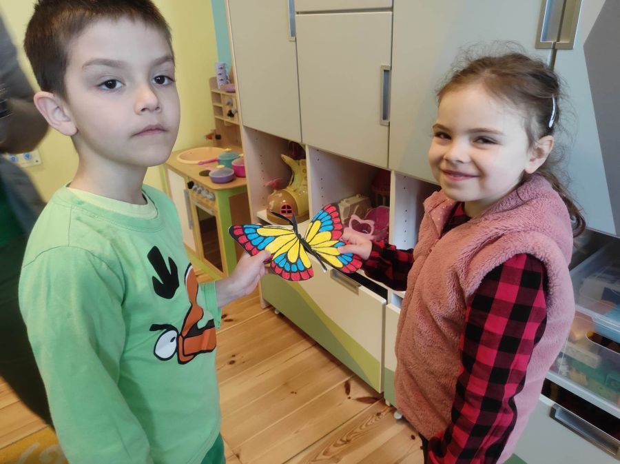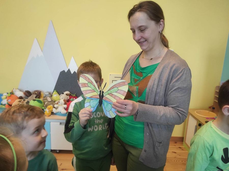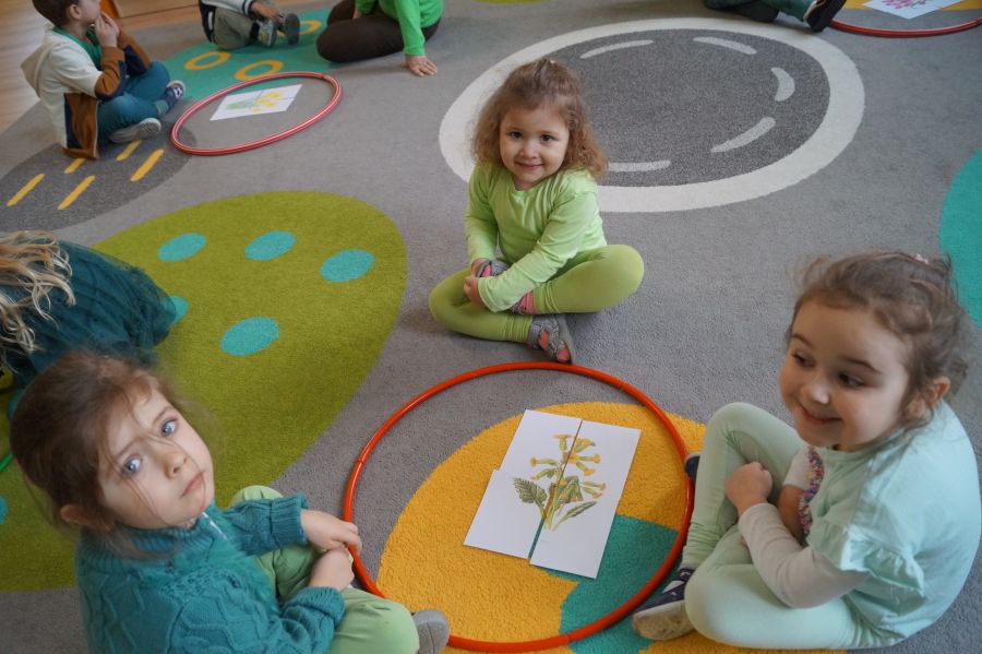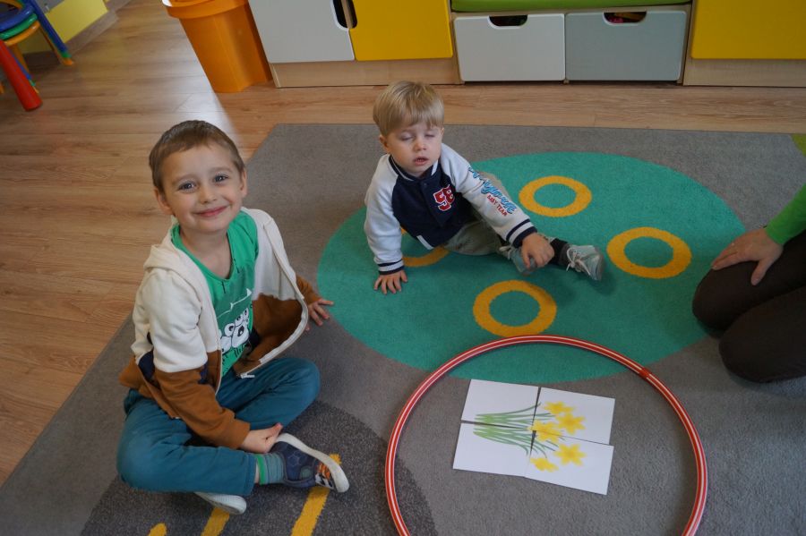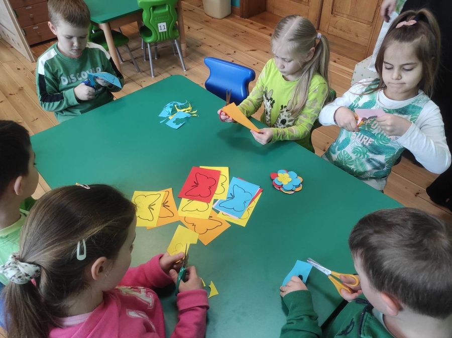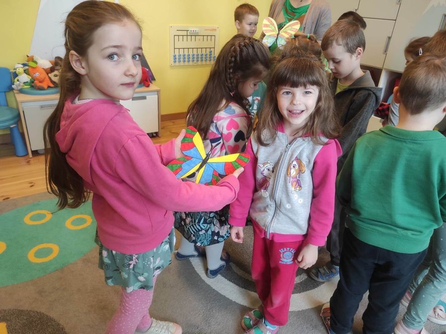 Powitanie wiosny w naszym przedszkolu odbyło się w obu grupach. Dzieci ubrane w kolorze zielonym podejmowały różne aktywności; układały puzzle, odgadywały zagadki, inscenizowały powrót bociana na łąkę, tworzyły prace plastyczne i tańczyły z kolorowymi chustami.