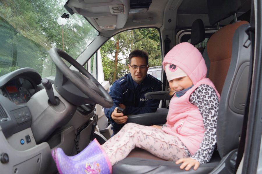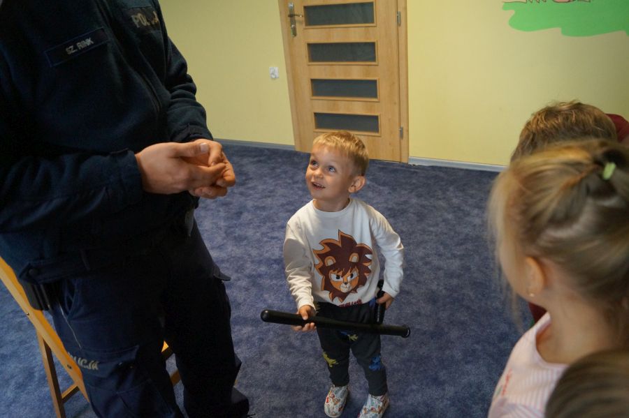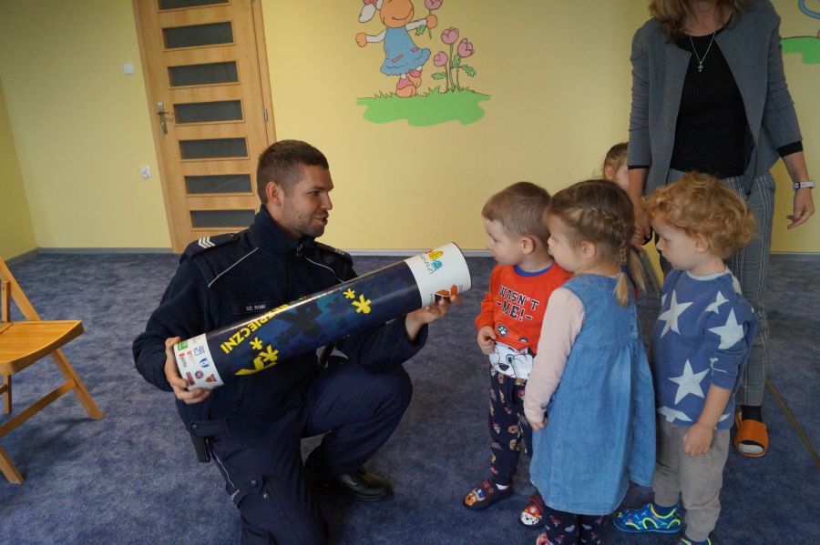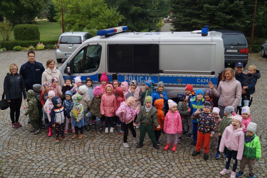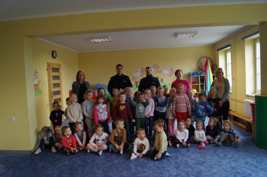 W naszym przedszkolu od razu zrobiło się bardziej bezpiecznie, gdy odwiedzili nas policjanci. Dzieci były zachwycone radiowozem, aktywnie brały udział w spotkaniu.