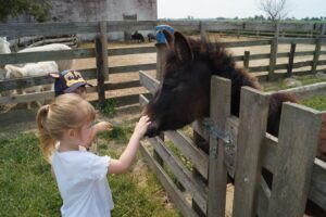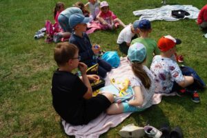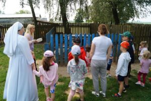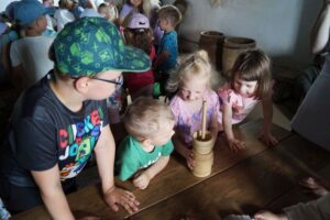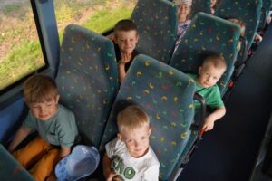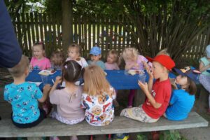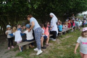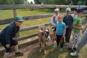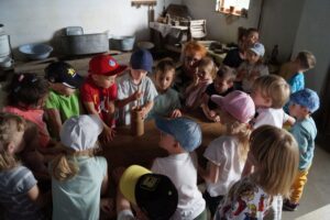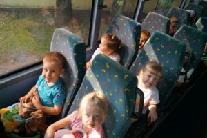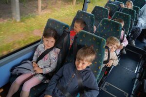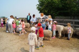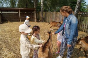 Dzieci mogły karmić zwierzęta, samodzielnie wydoić kozę, ubić masło w drewnianej maselnicy, które później zjedliśmy ;). Dodatkową atrakcją był oczywiście przejazd autokarem. Niektóre dzieci jechały nim po raz pierwszy w życiu.