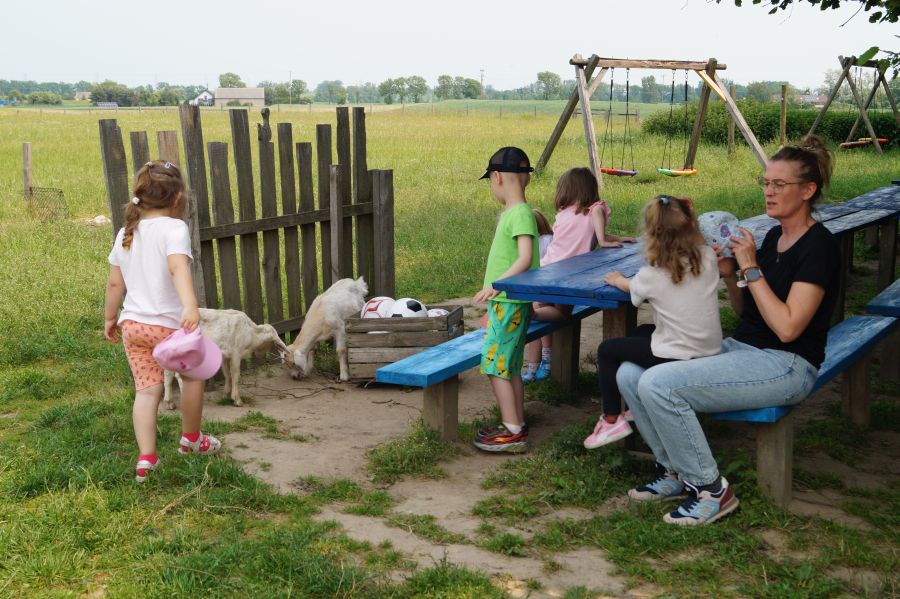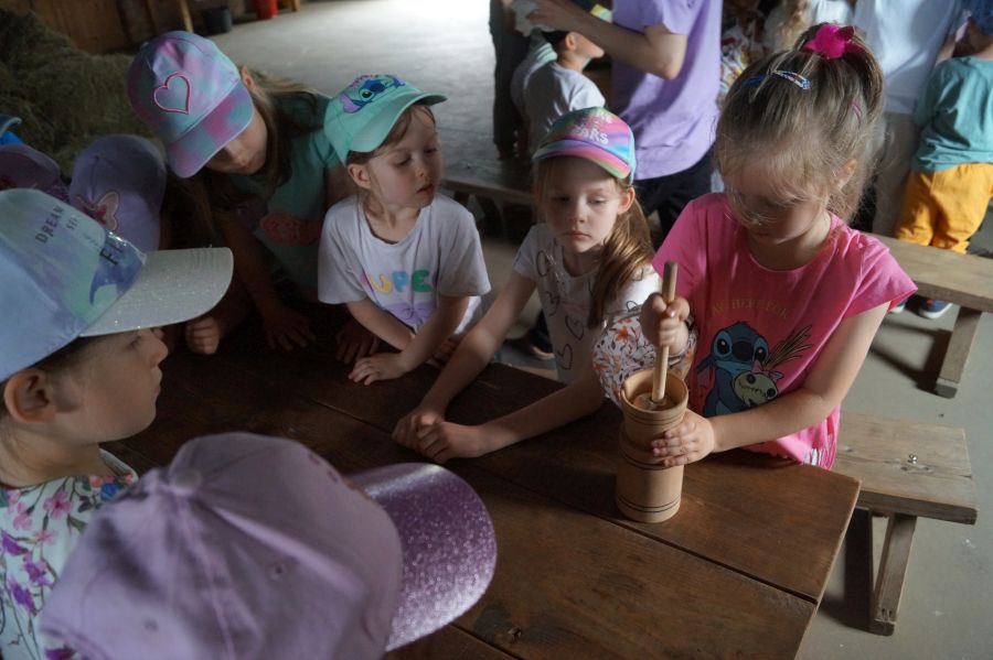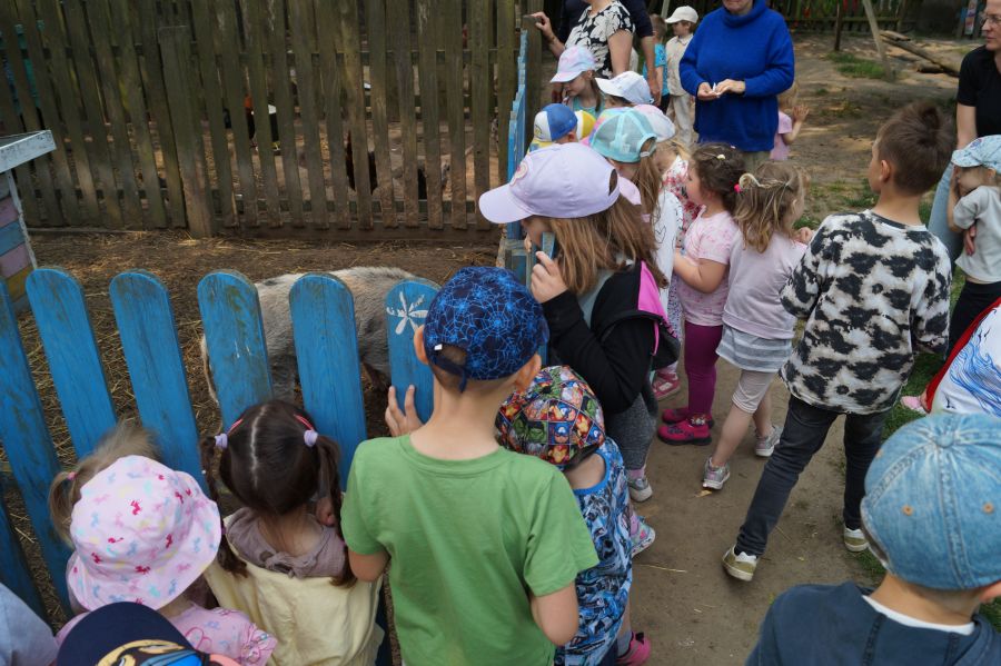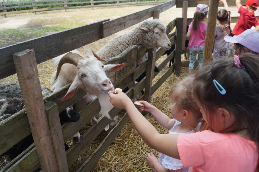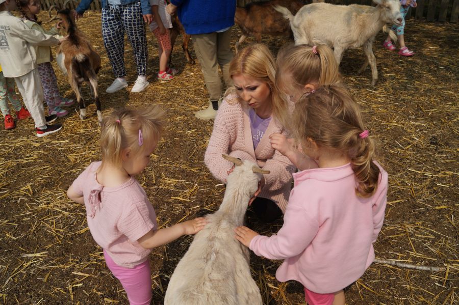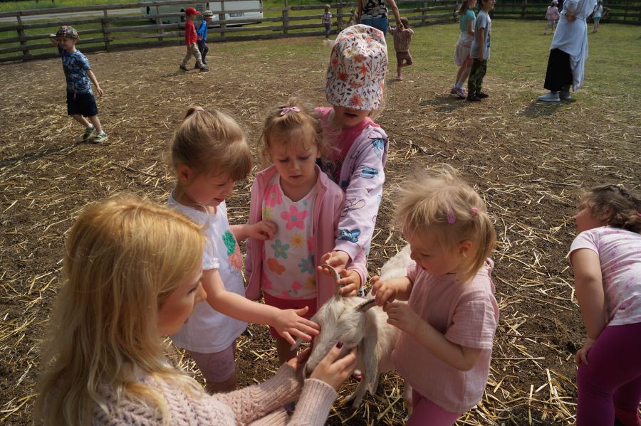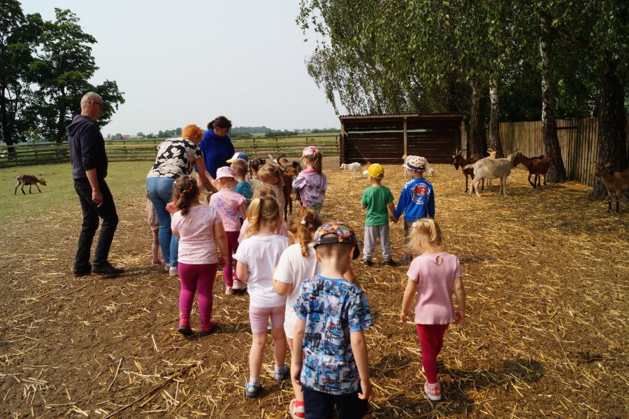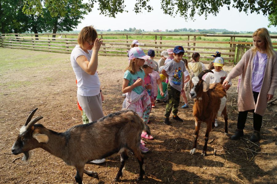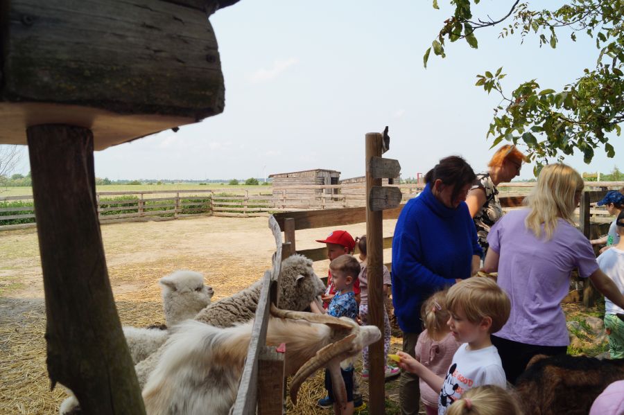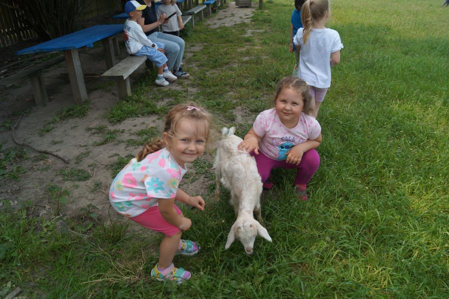 Dzieci mogły karmić zwierzęta, samodzielnie wydoić kozę, ubić masło w drewnianej maselnicy, które później zjedliśmy ;). Dodatkową atrakcją był oczywiście przejazd autokarem. Niektóre dzieci jechały nim po raz pierwszy w życiu.
