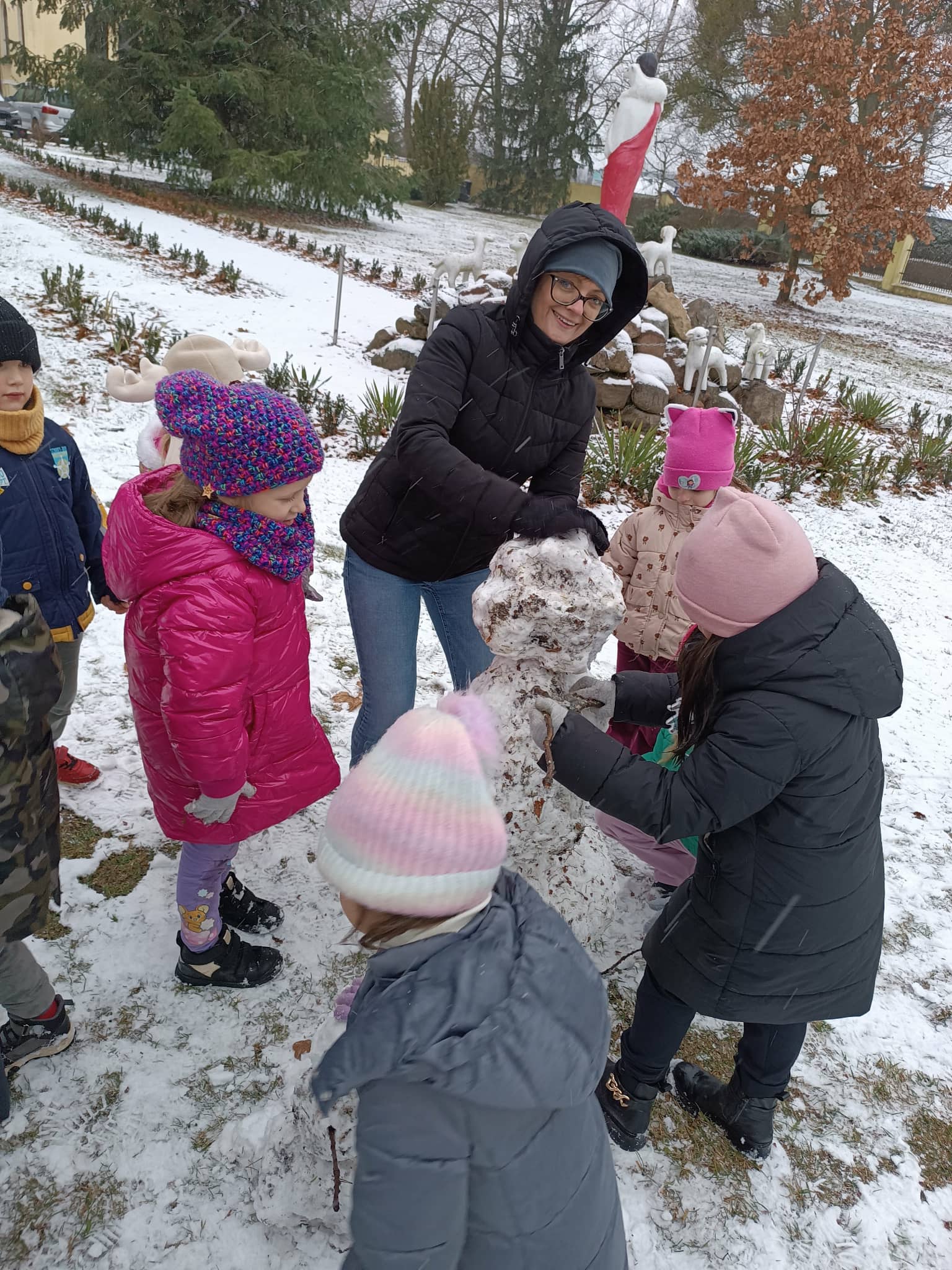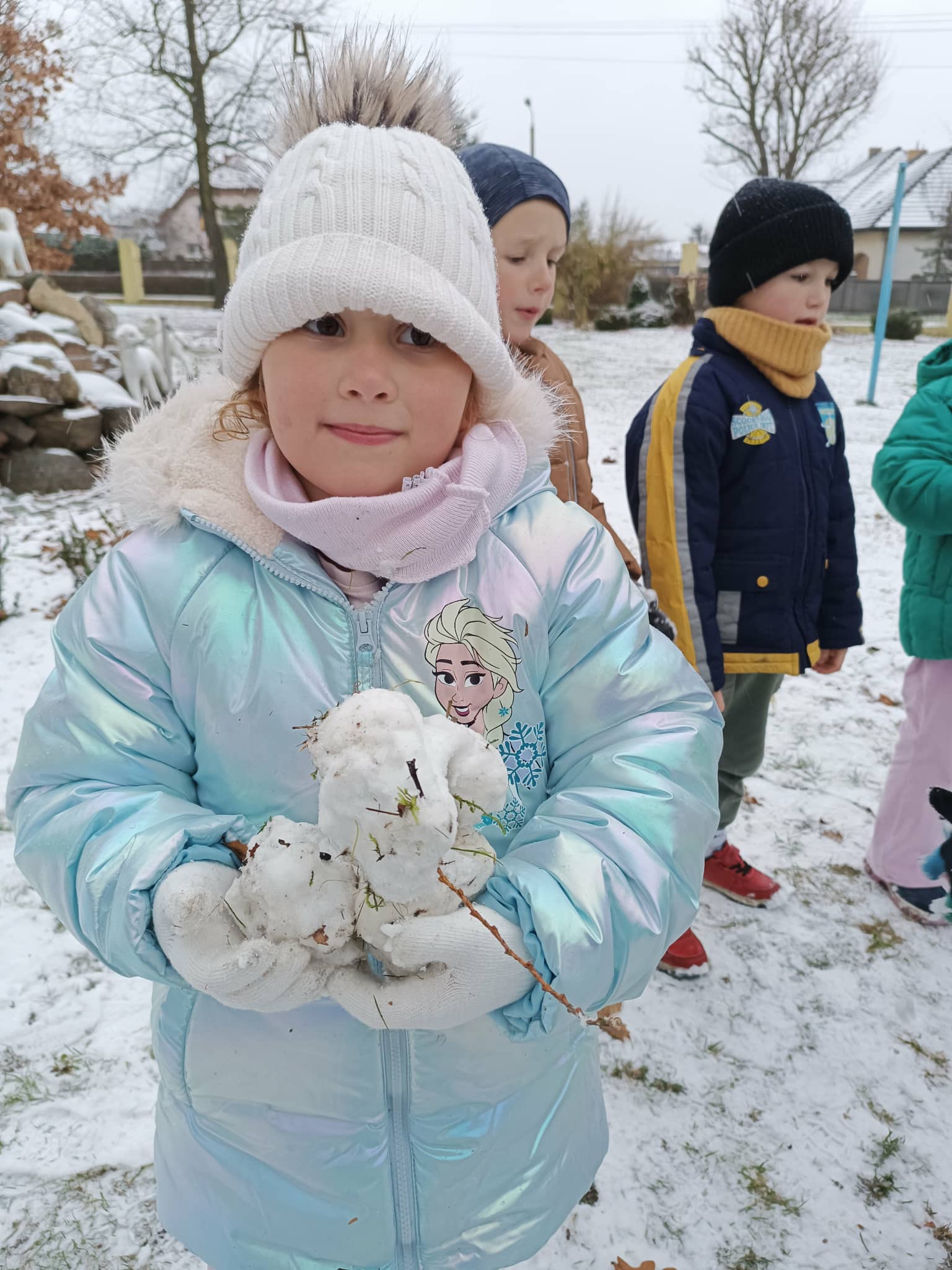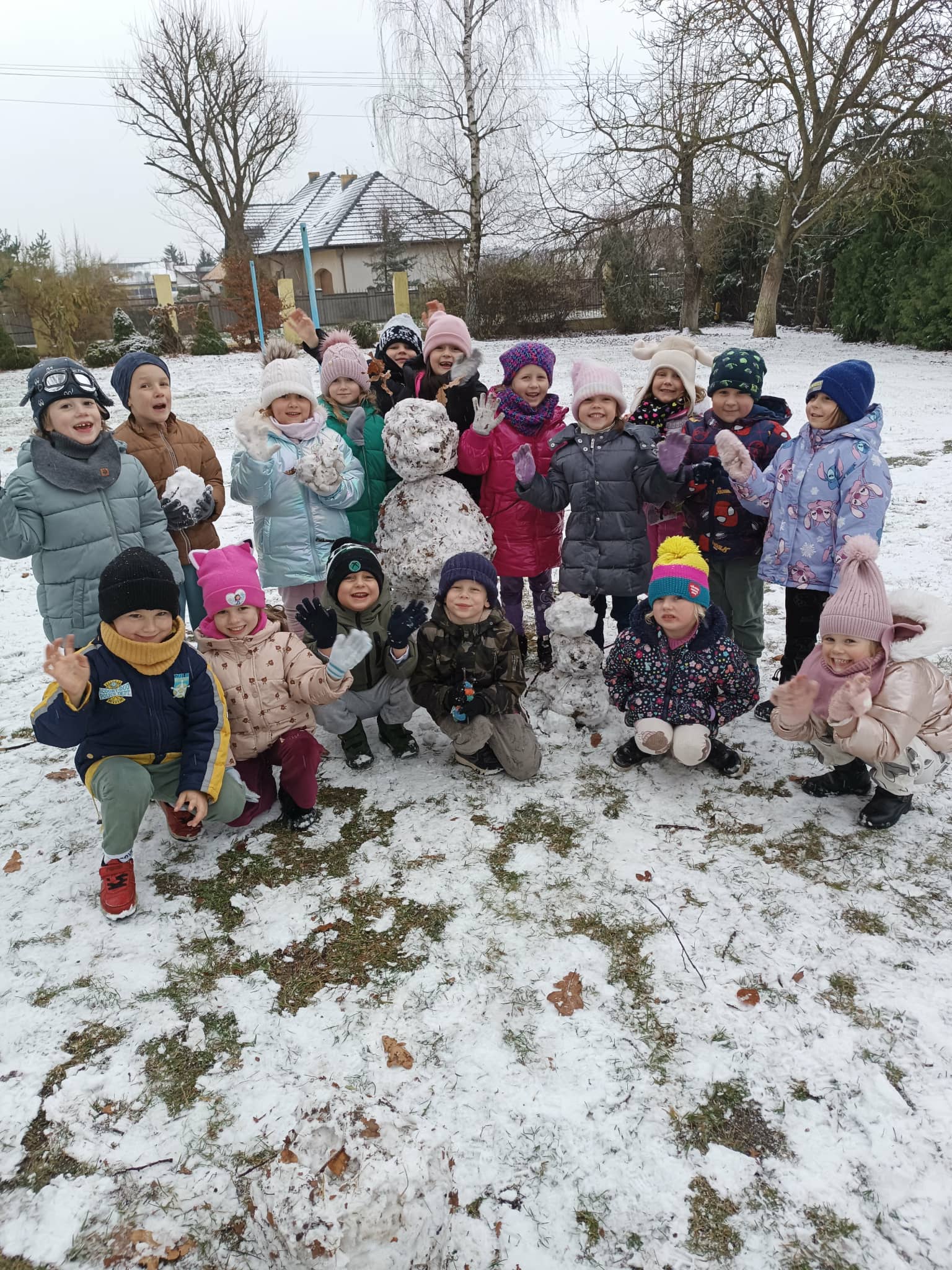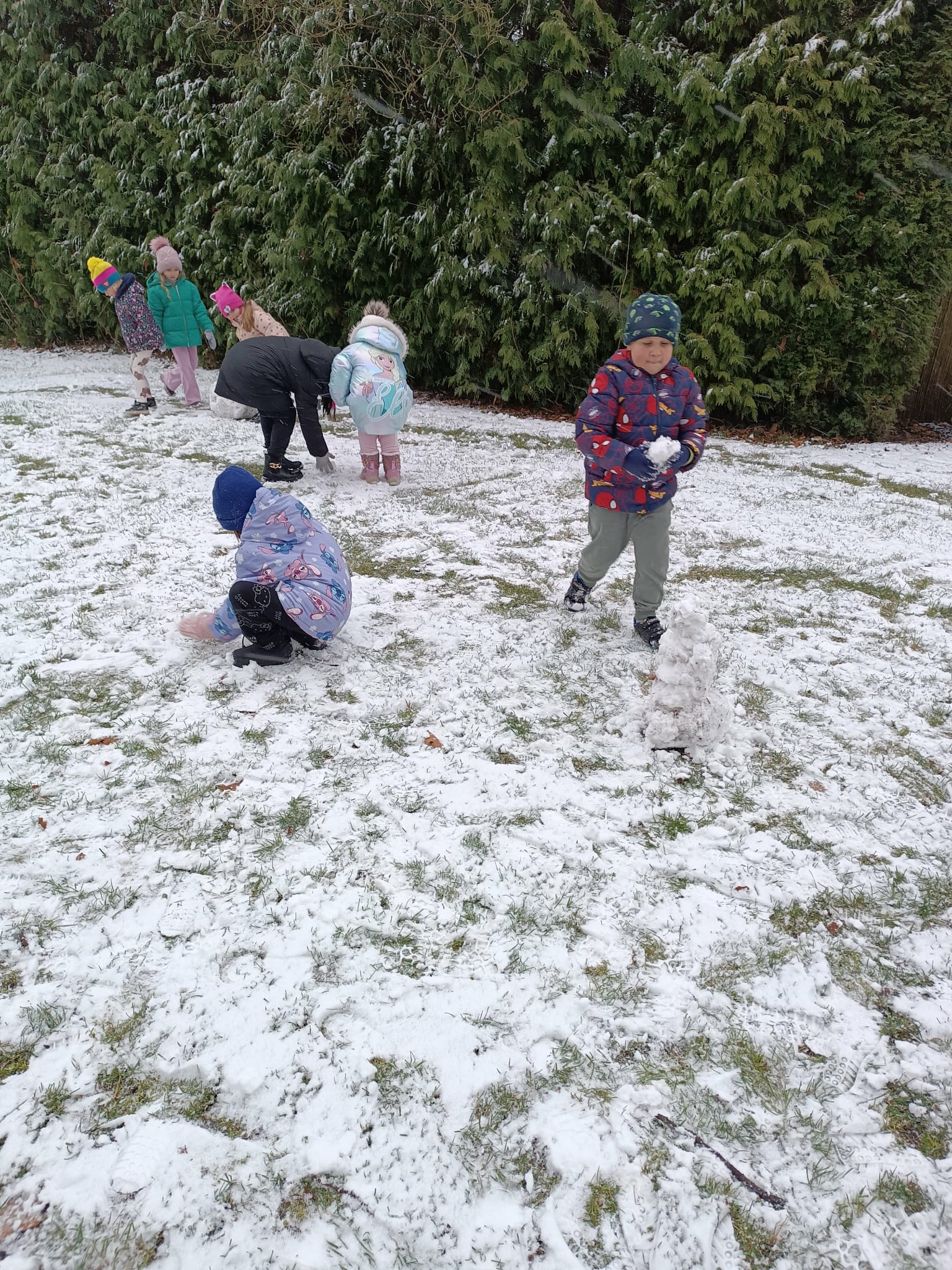 Grupa starsza korzystając z tego, że spadł pierwszy śnieg postanowiła pobawić się w ogrodzie i ulepić wspólnie bałwana. Nie ukrywamy, że sprawiło to dzieciom wiele radości. Dzieci młodsze również chętnie, z ogromnym entuzjazmem bawiły się w ogrodzie przedszkolnym.