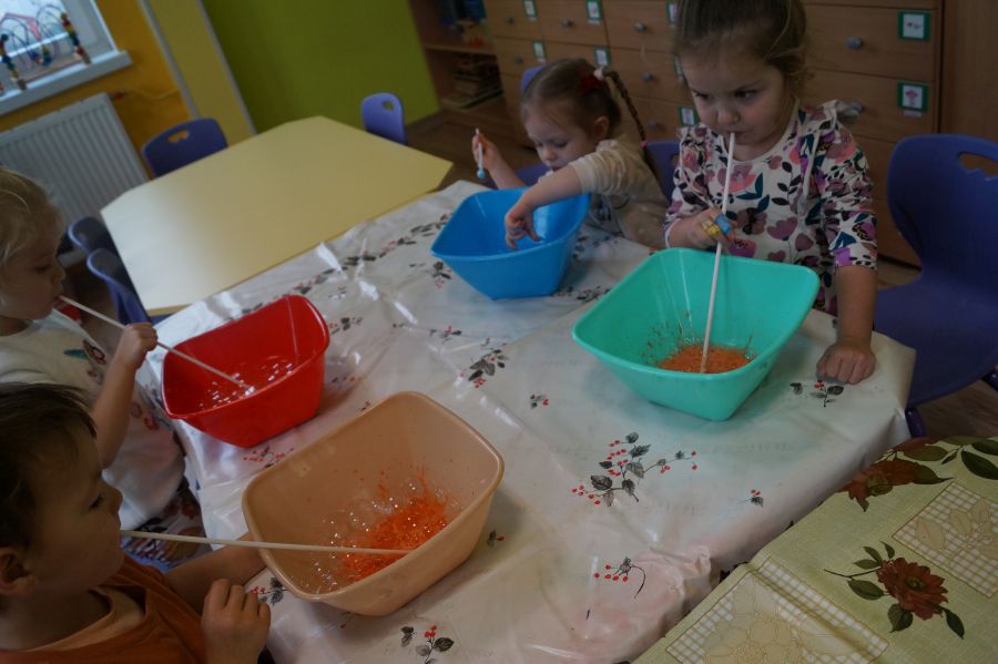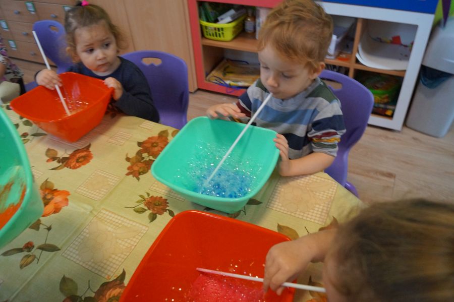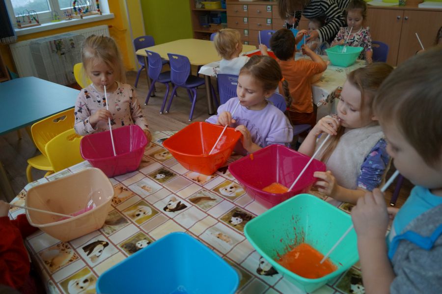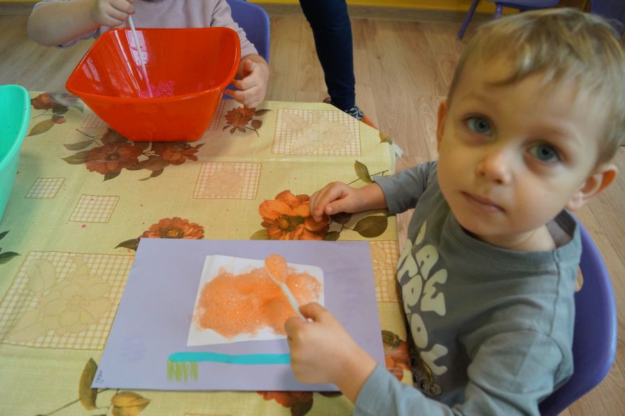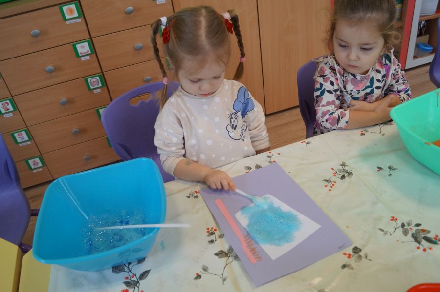W grupie młodszej z reguły jest bardzo wesoło, tym razem było też kolorowo. zobaczcie sami. Zabawy plastyczne u maluchów.