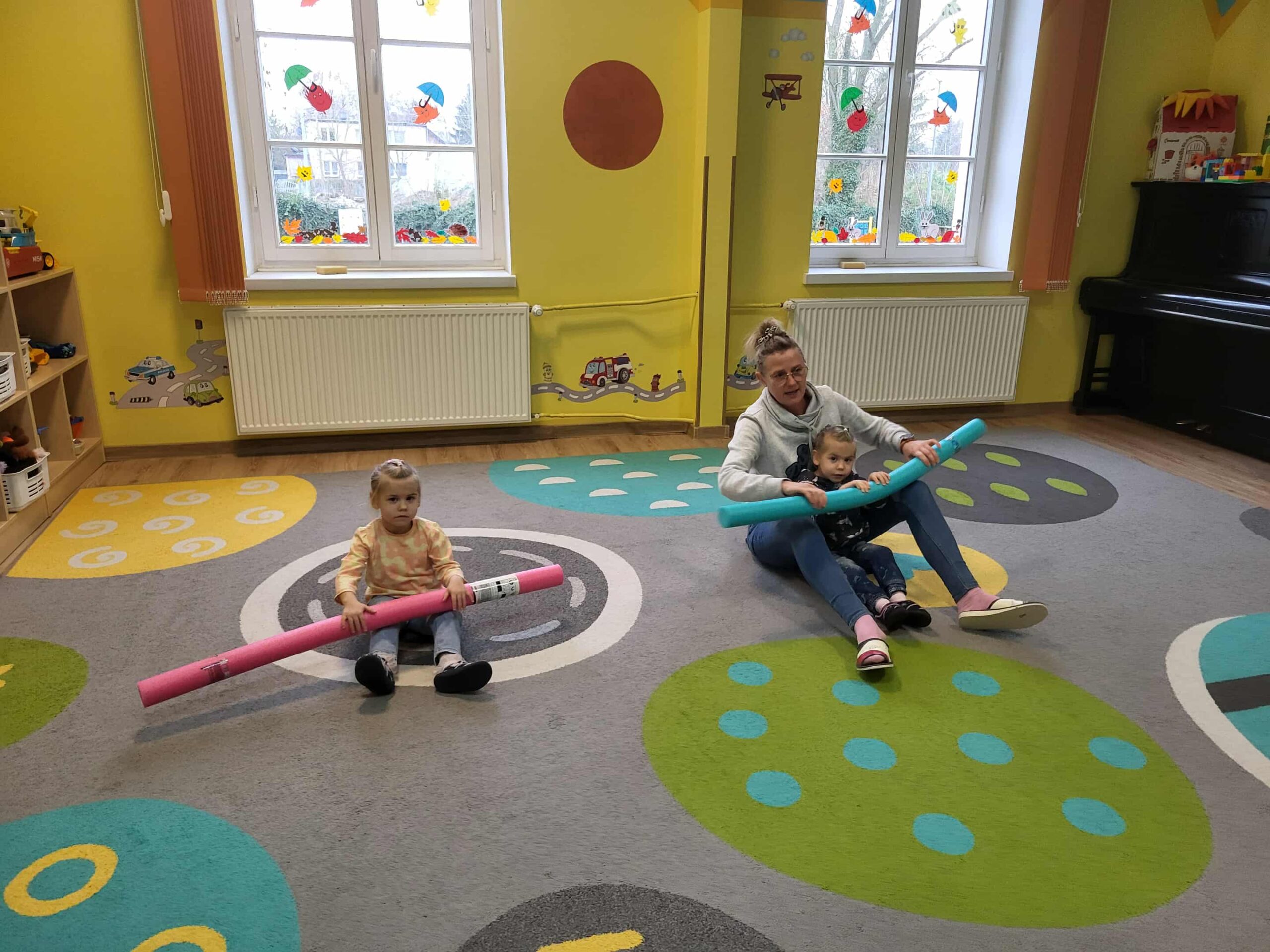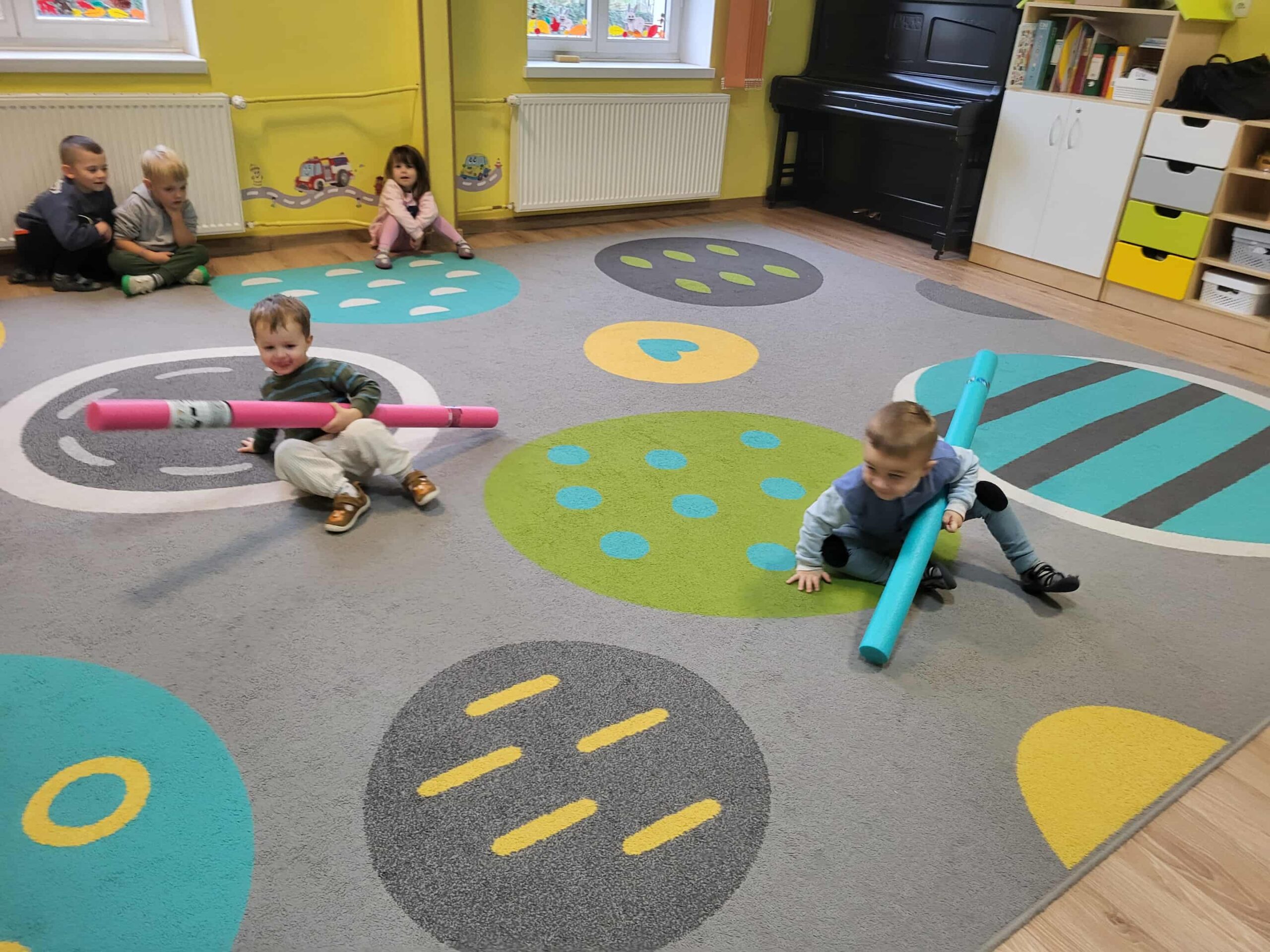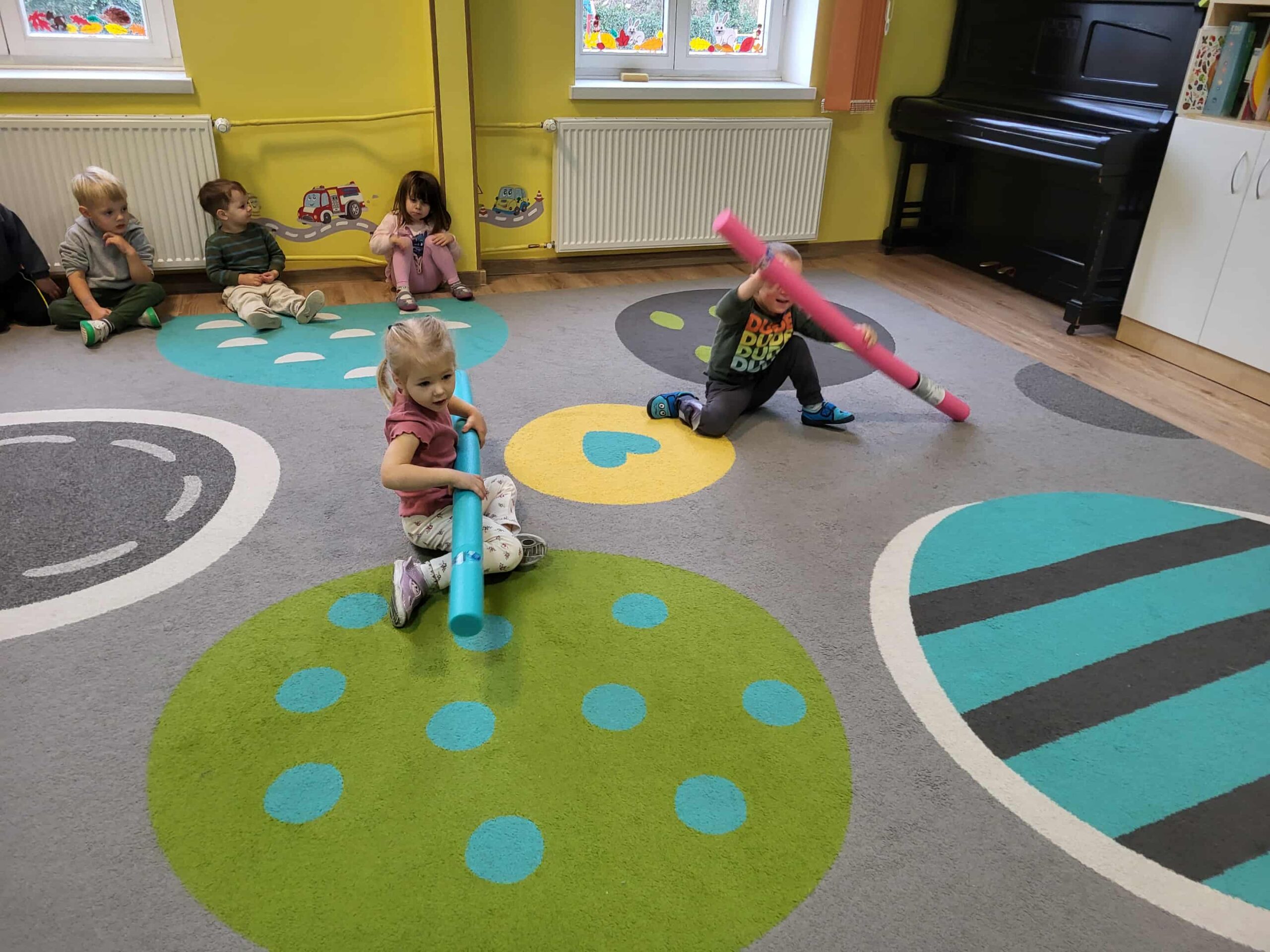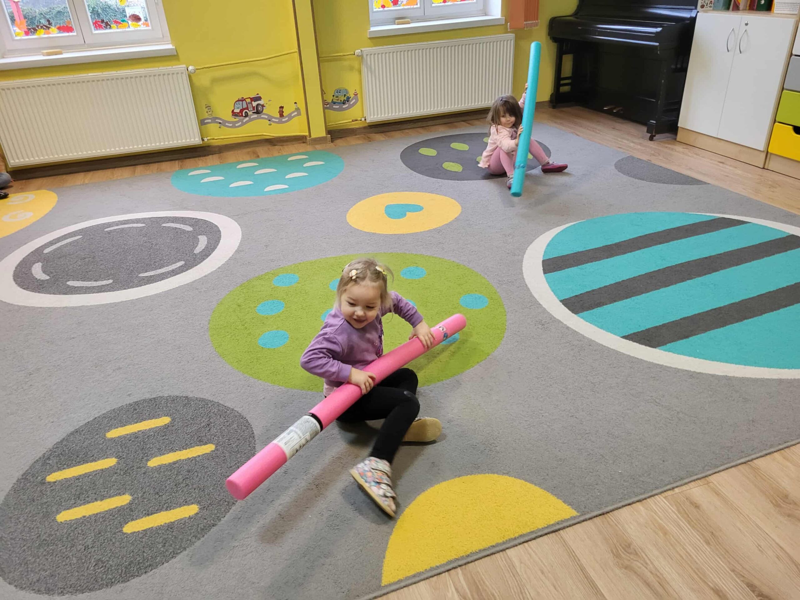 Dlatego też nasze maluchy np. „przepływają” po dywanie 😉 do krainy zabawek, wykorzystując tzw. makarony do pływania. Dużo radości, zabawy i korzyści dla mózgu!