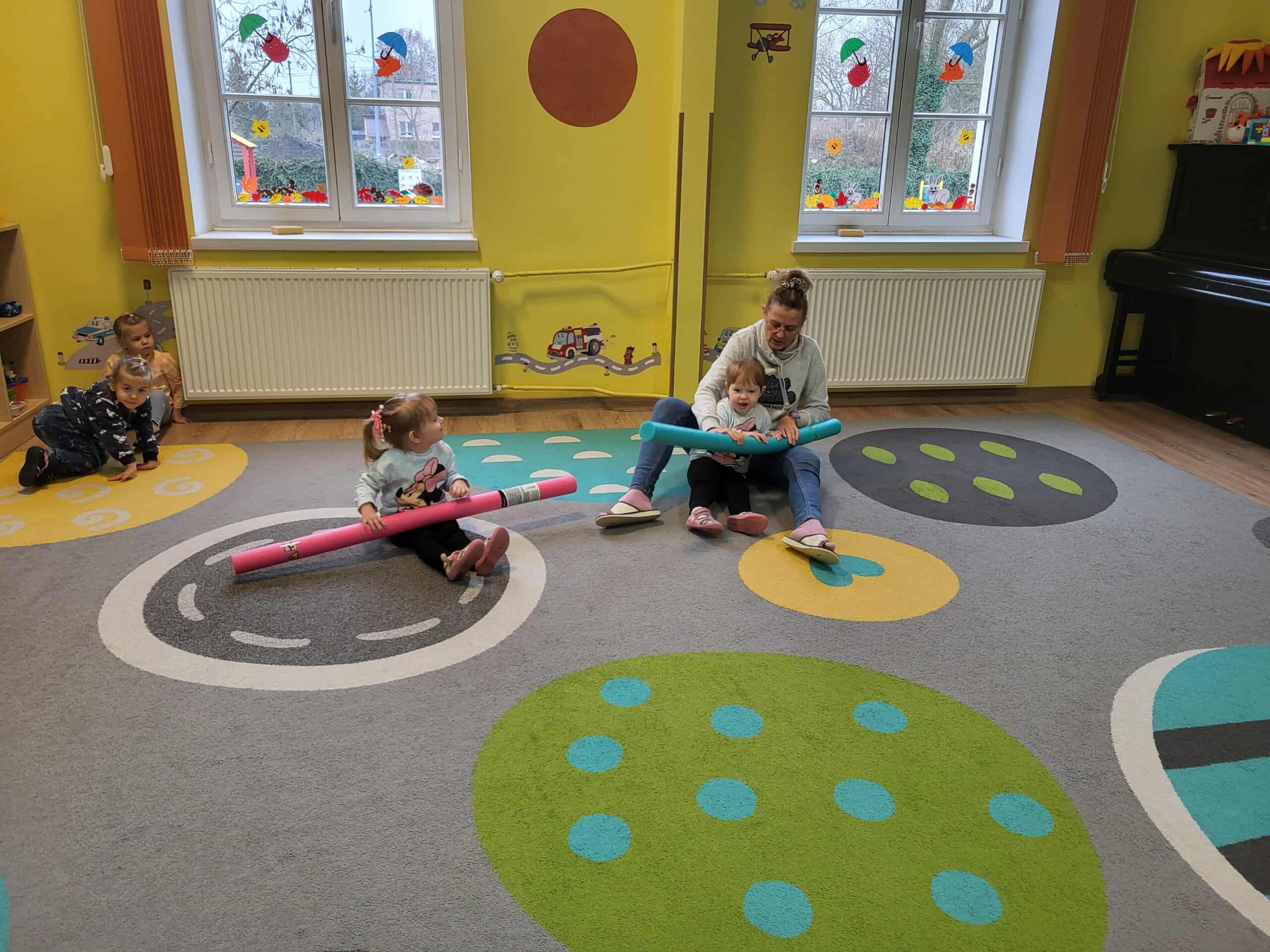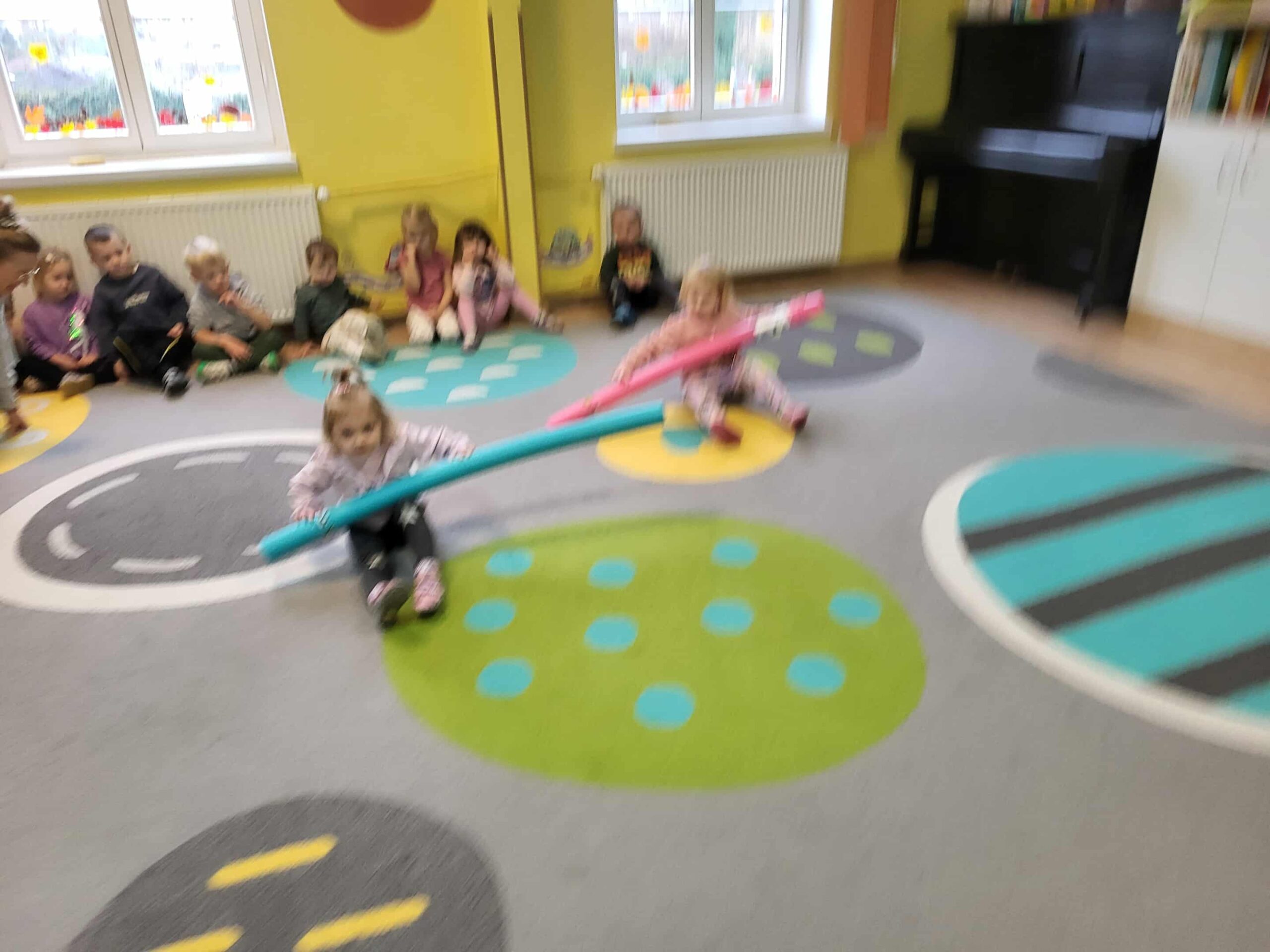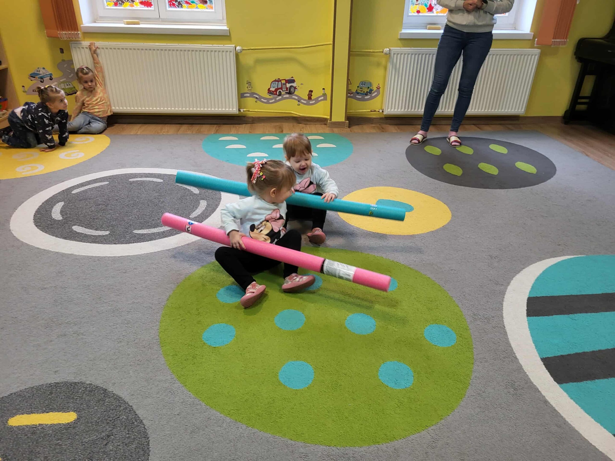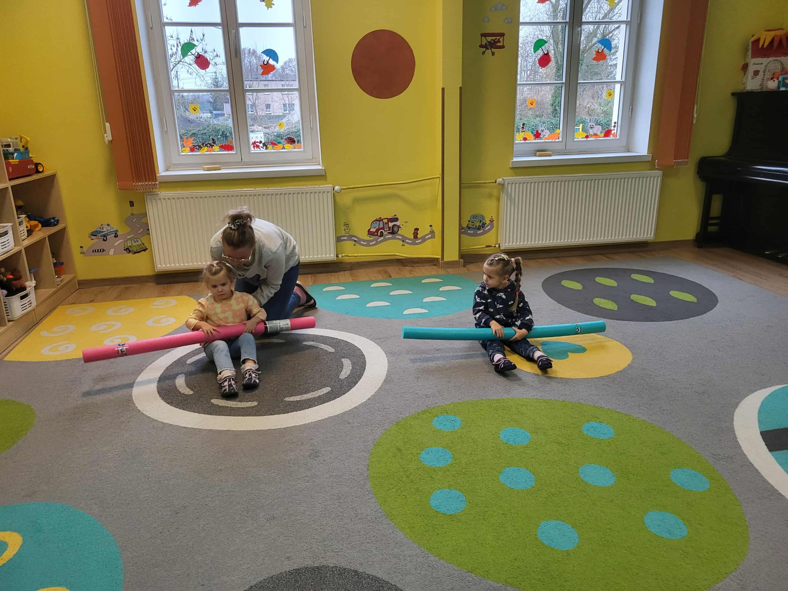 Dlatego też nasze maluchy np. „przepływają” po dywanie 😉 do krainy zabawek, wykorzystując tzw. makarony do pływania. Dużo radości, zabawy i korzyści dla mózgu!