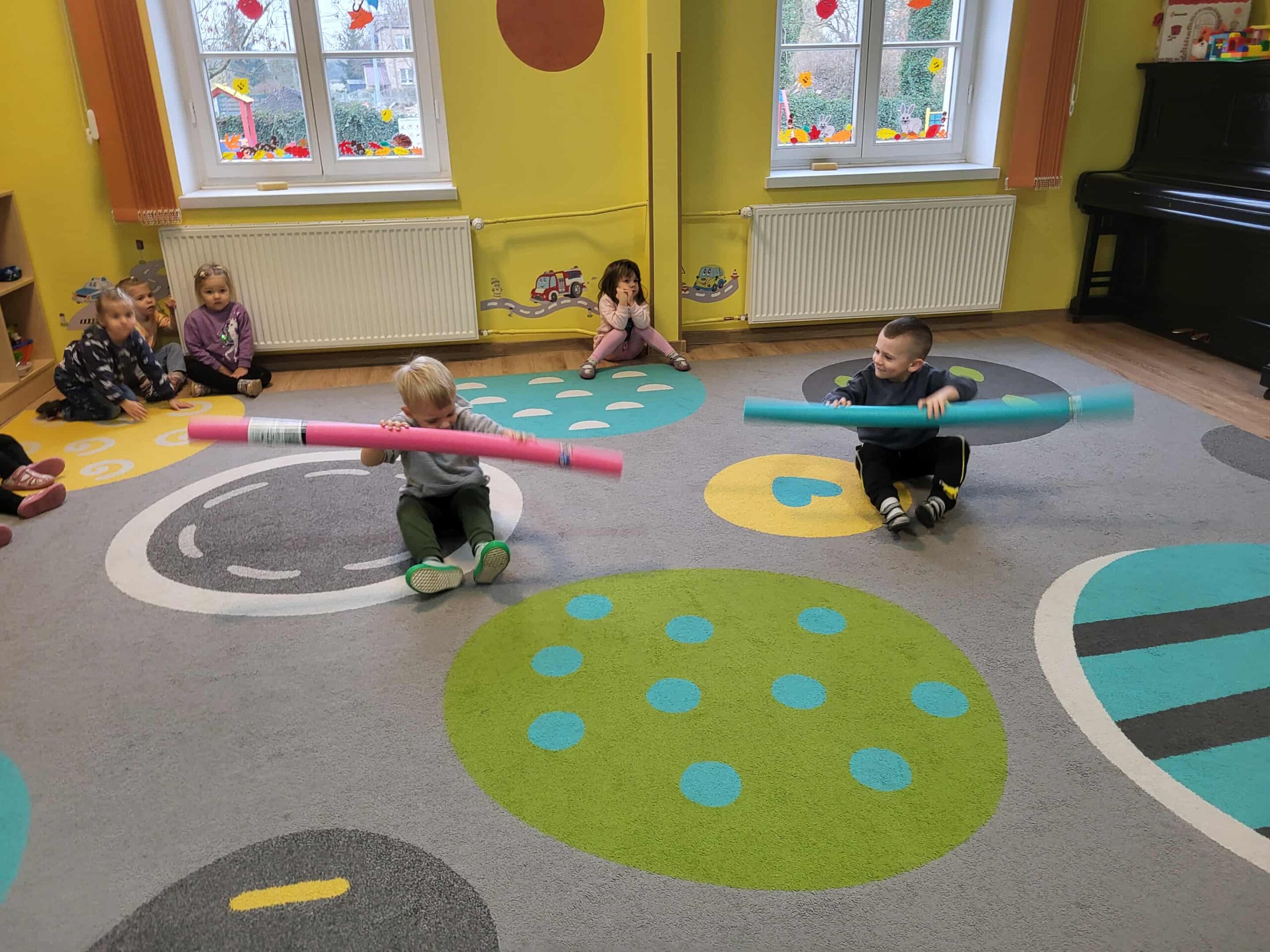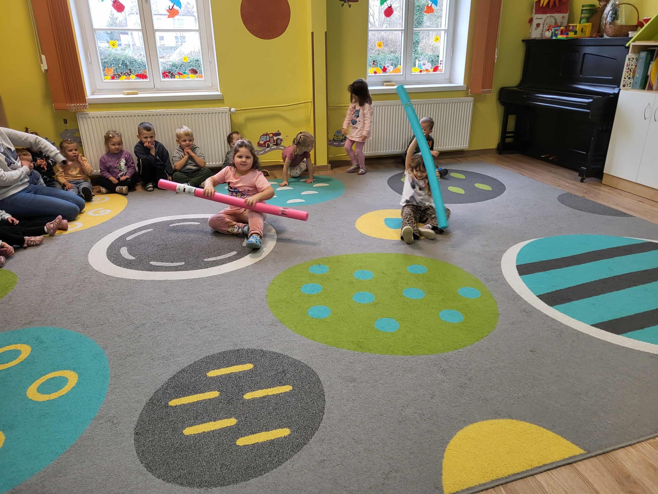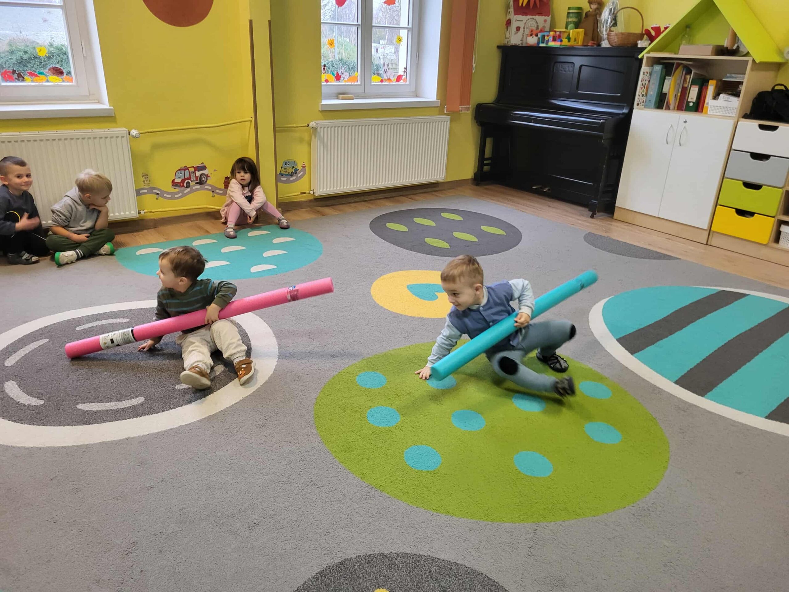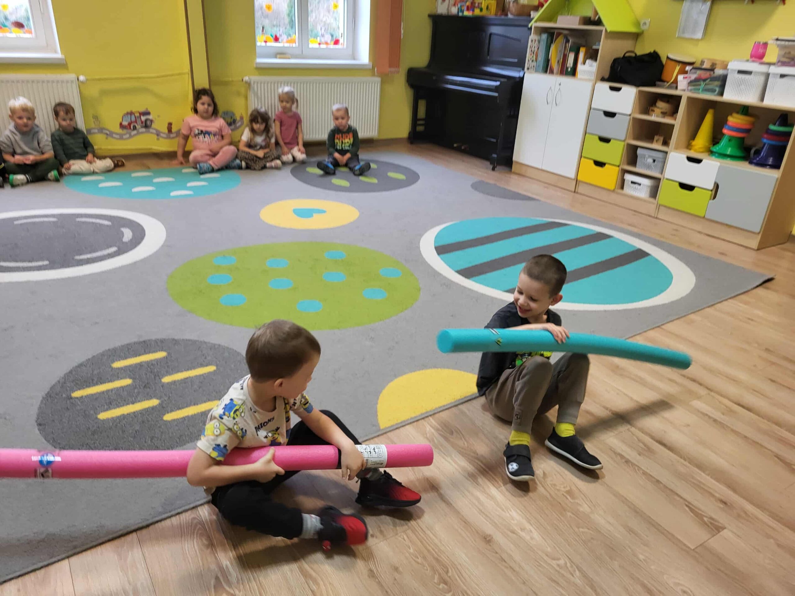 Dlatego też nasze maluchy np. „przepływają” po dywanie 😉 do krainy zabawek, wykorzystując tzw. makarony do pływania. Dużo radości, zabawy i korzyści dla mózgu!